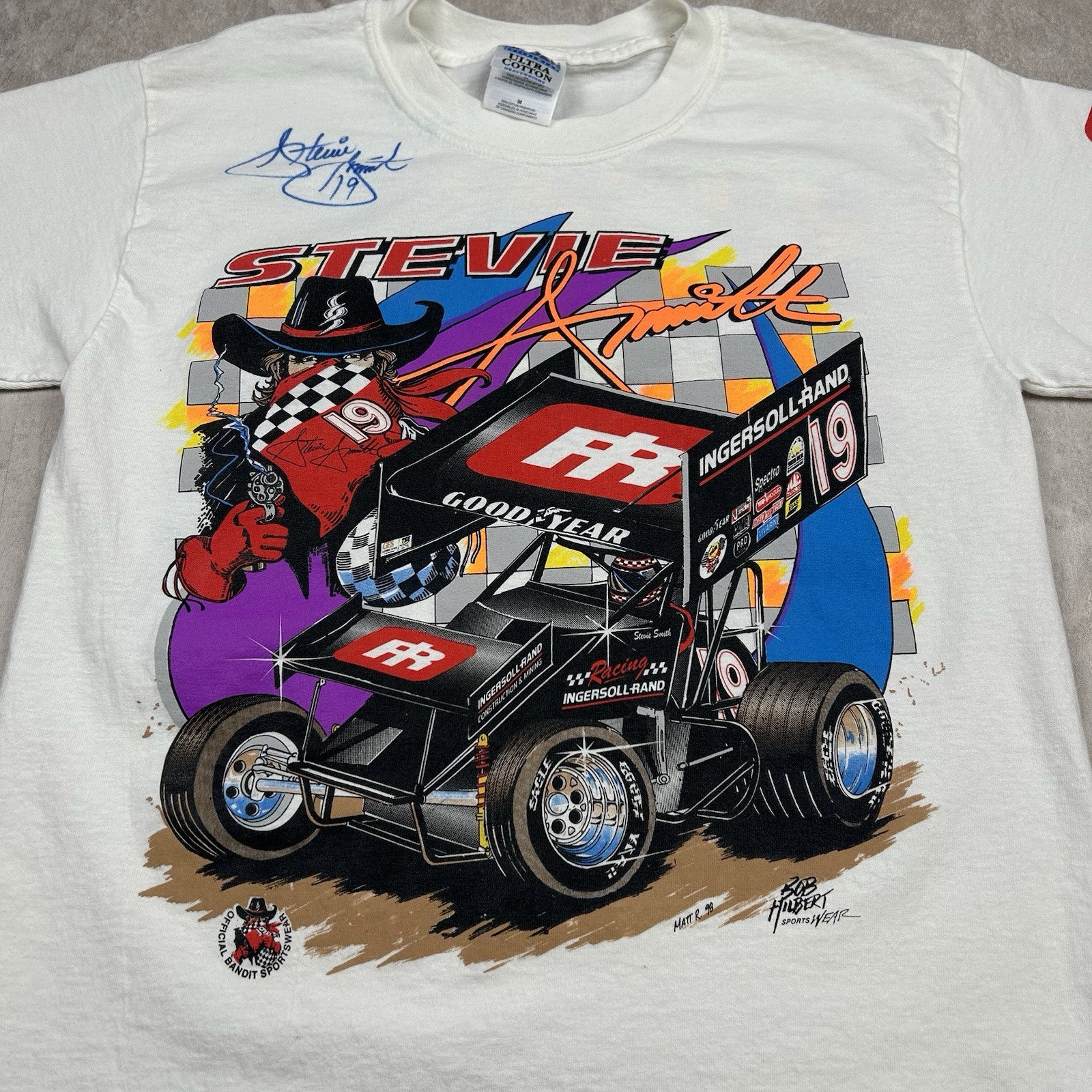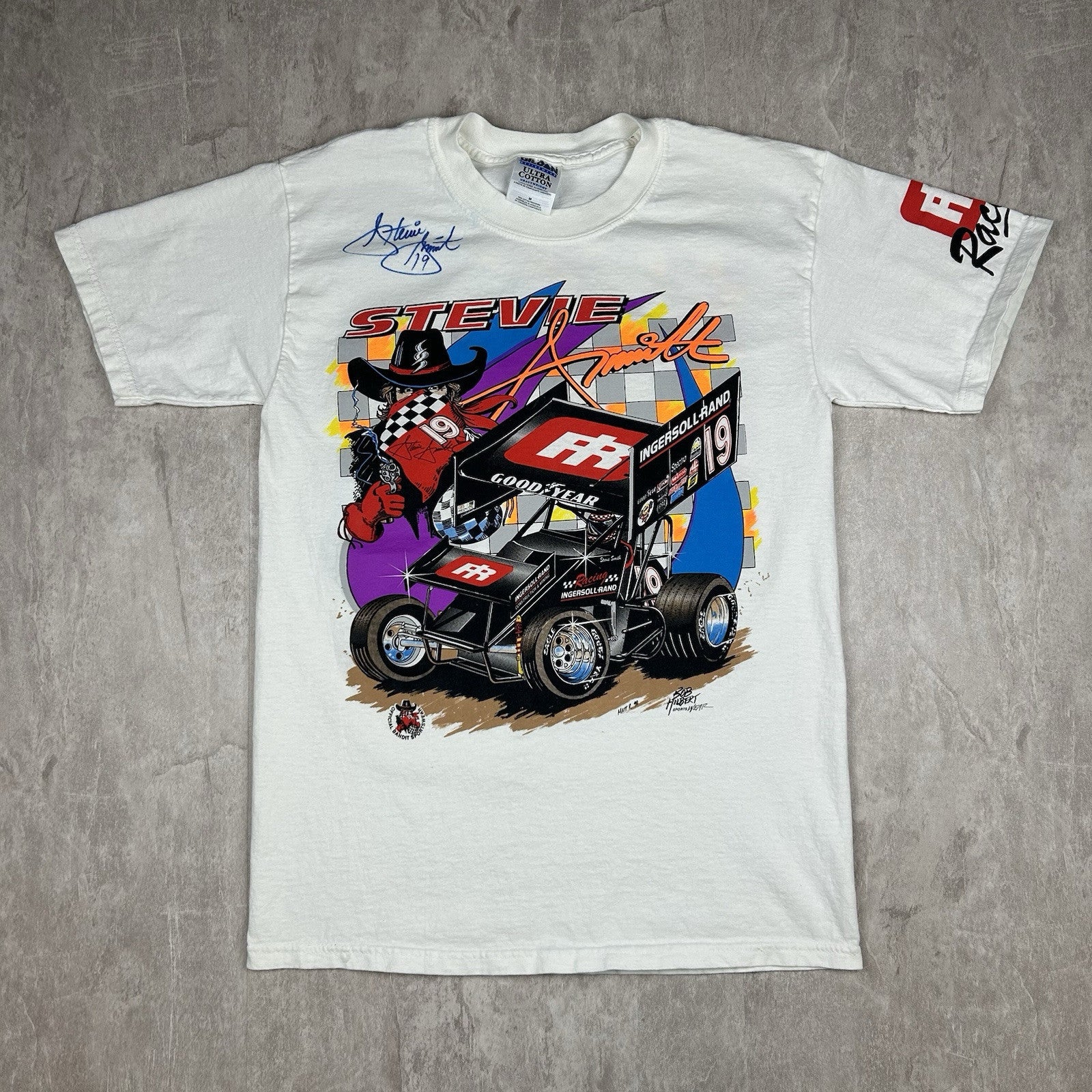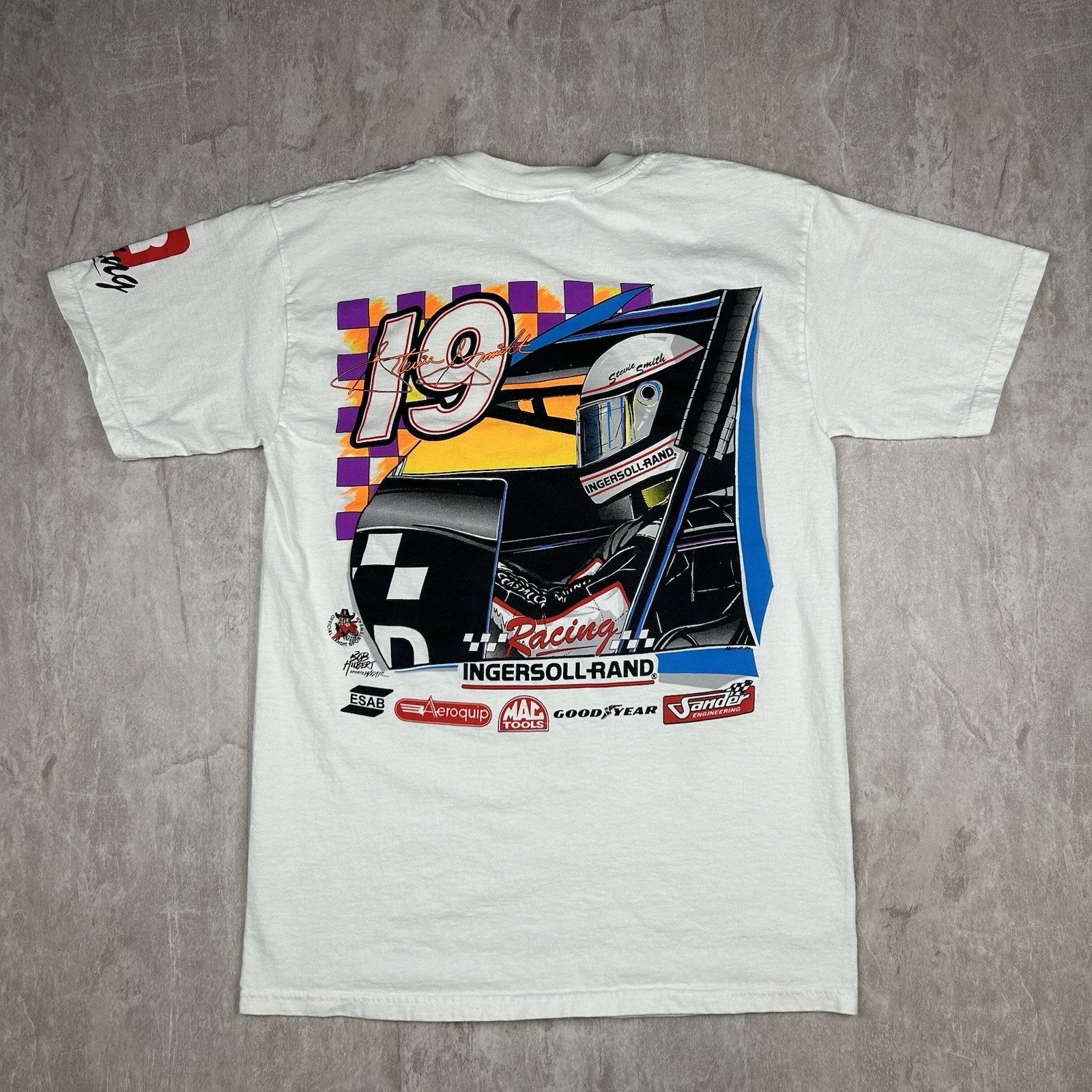 This signed vintage Stevie Smith #19 Ingersoll Rand sprint car T-shirt is a must-have for racing fans. Featuring a classic design, it comes in men's size M and is perfect for collectors of motorsports memorabilia.