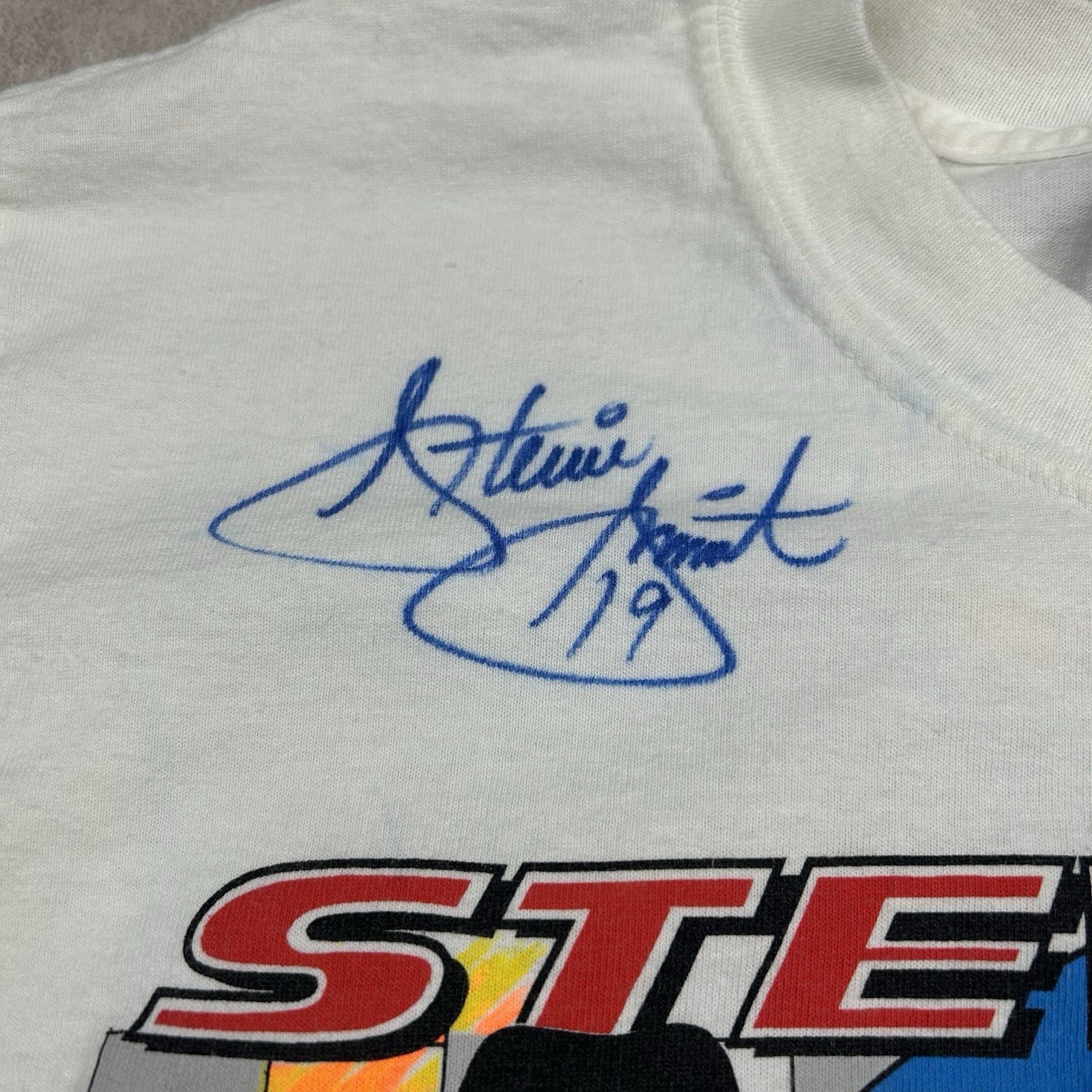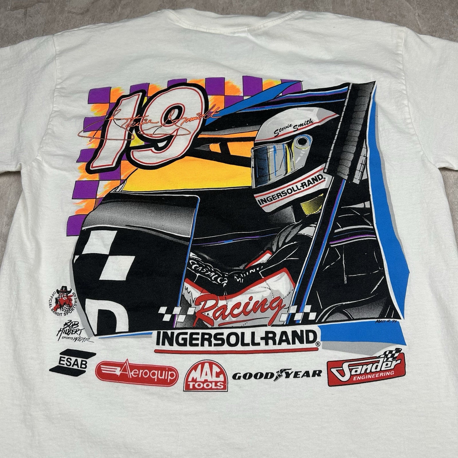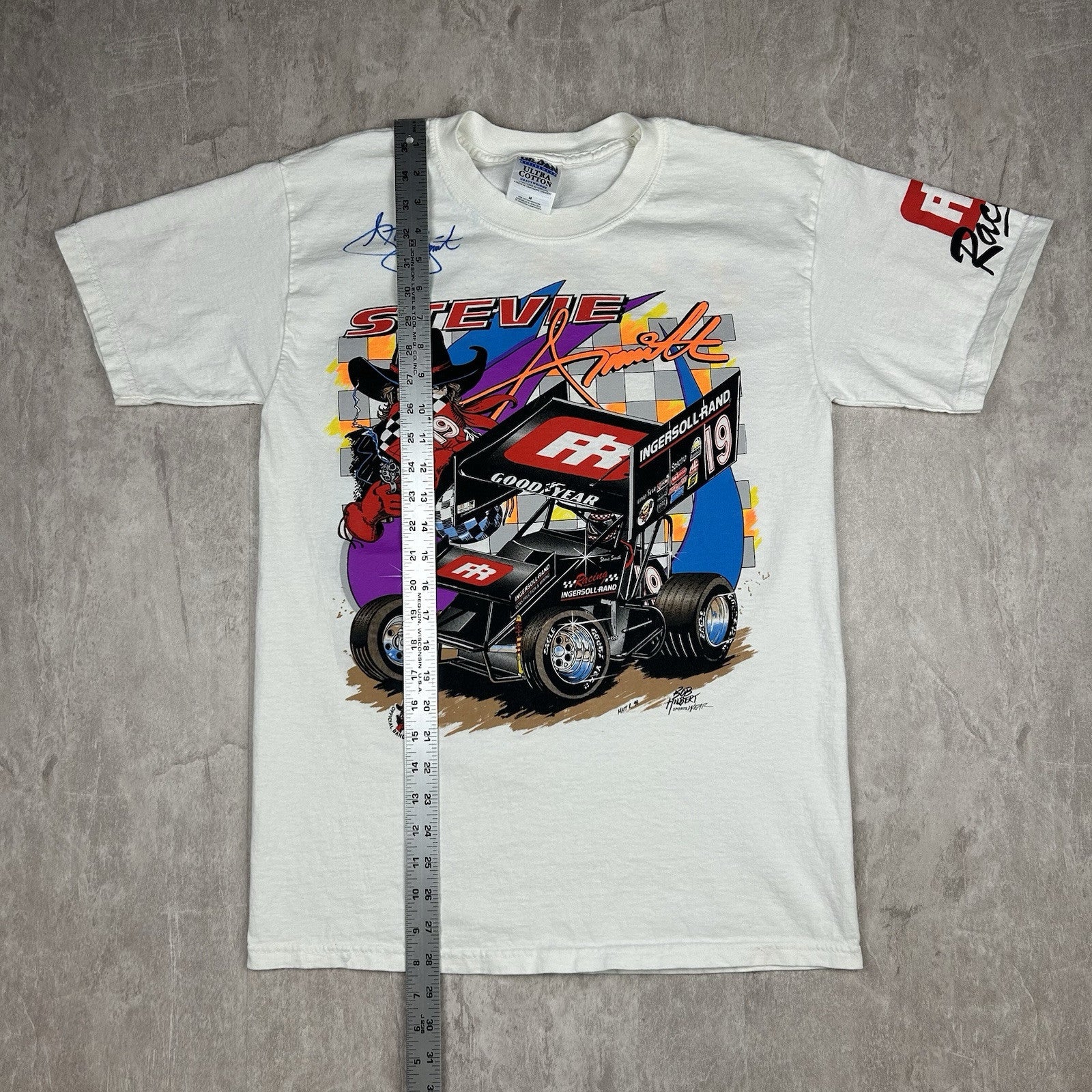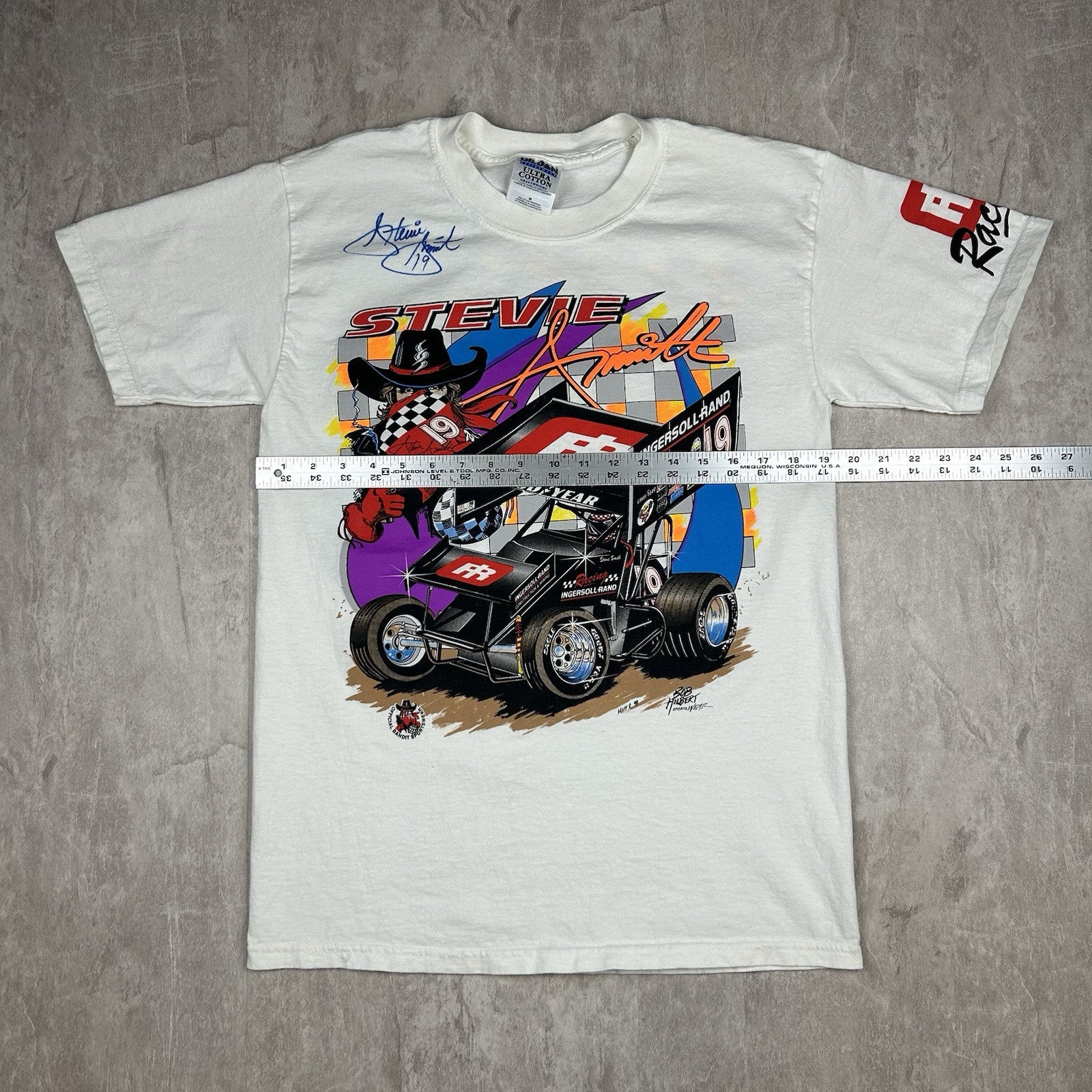 This signed vintage Stevie Smith #19 Ingersoll Rand sprint car T-shirt is a must-have for racing fans. Featuring a classic design, it comes in men's size M and is perfect for collectors of motorsports memorabilia.