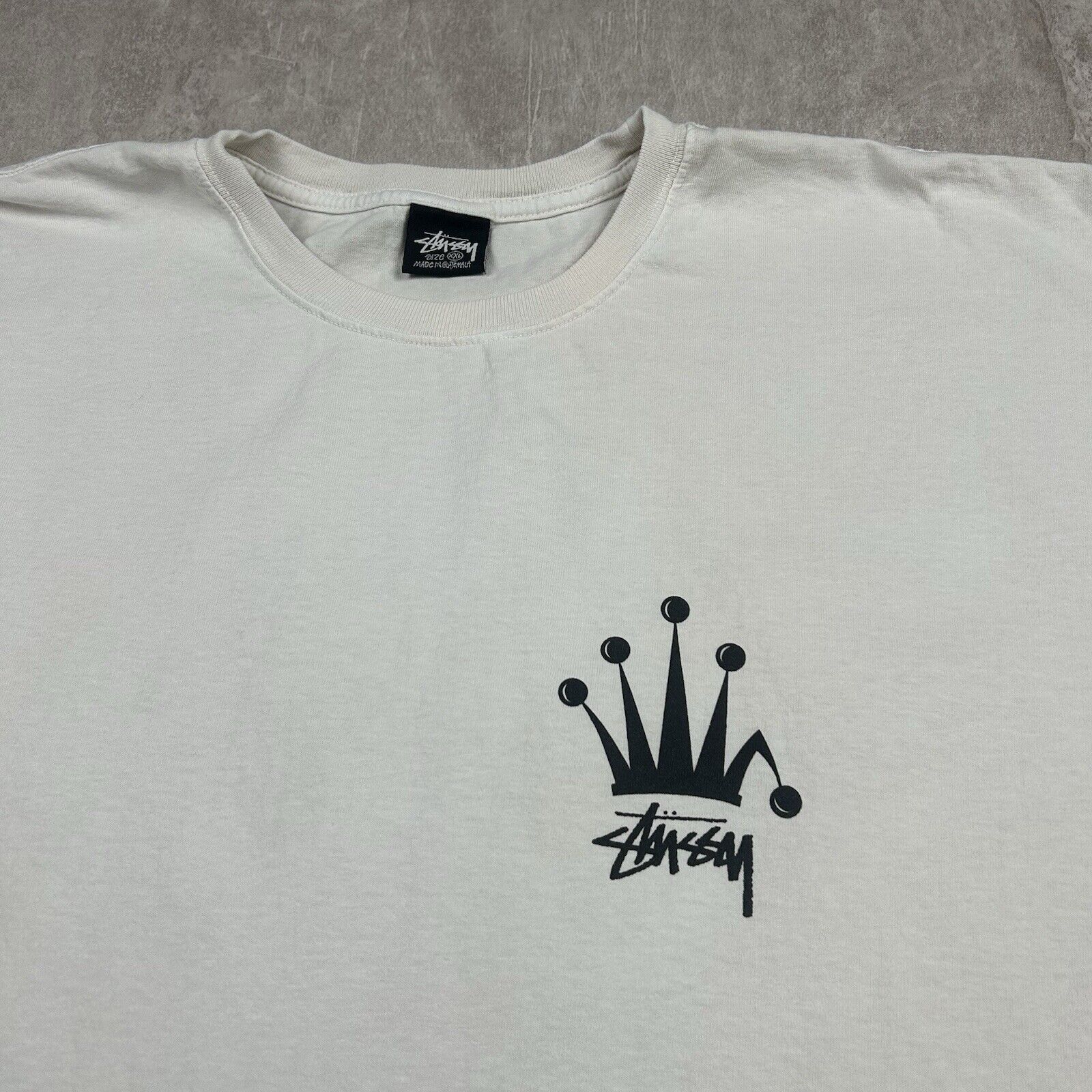 This Stussy Regal Crown White T-Shirt in size 2XL features a bold, double-sided graphic with the iconic Stussy crown logo. The short-sleeve design offers a clean, classic look, perfect for streetwear enthusiasts and collectors of vintage Stussy pieces.