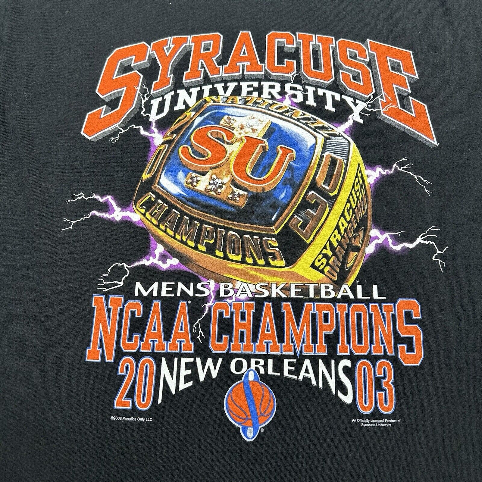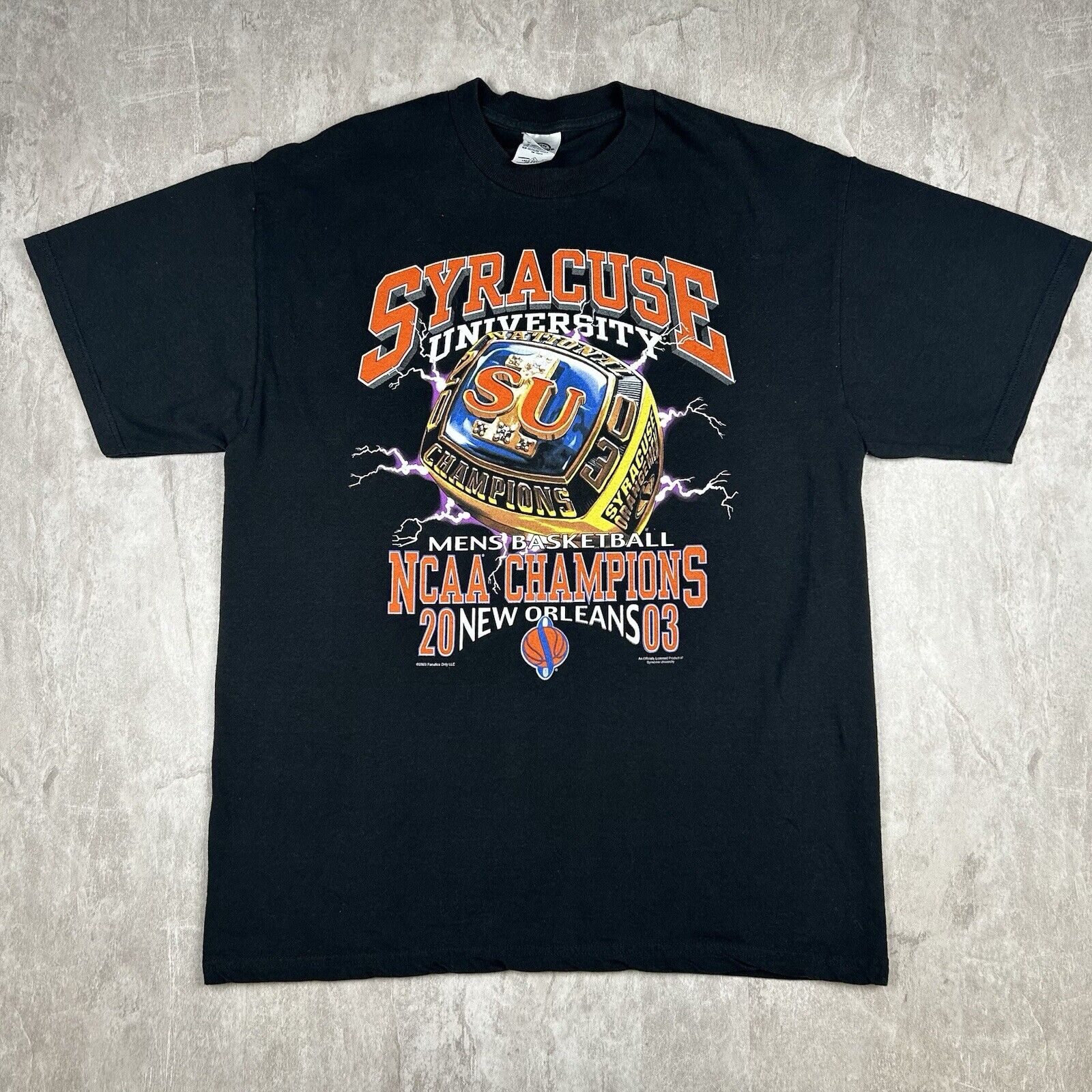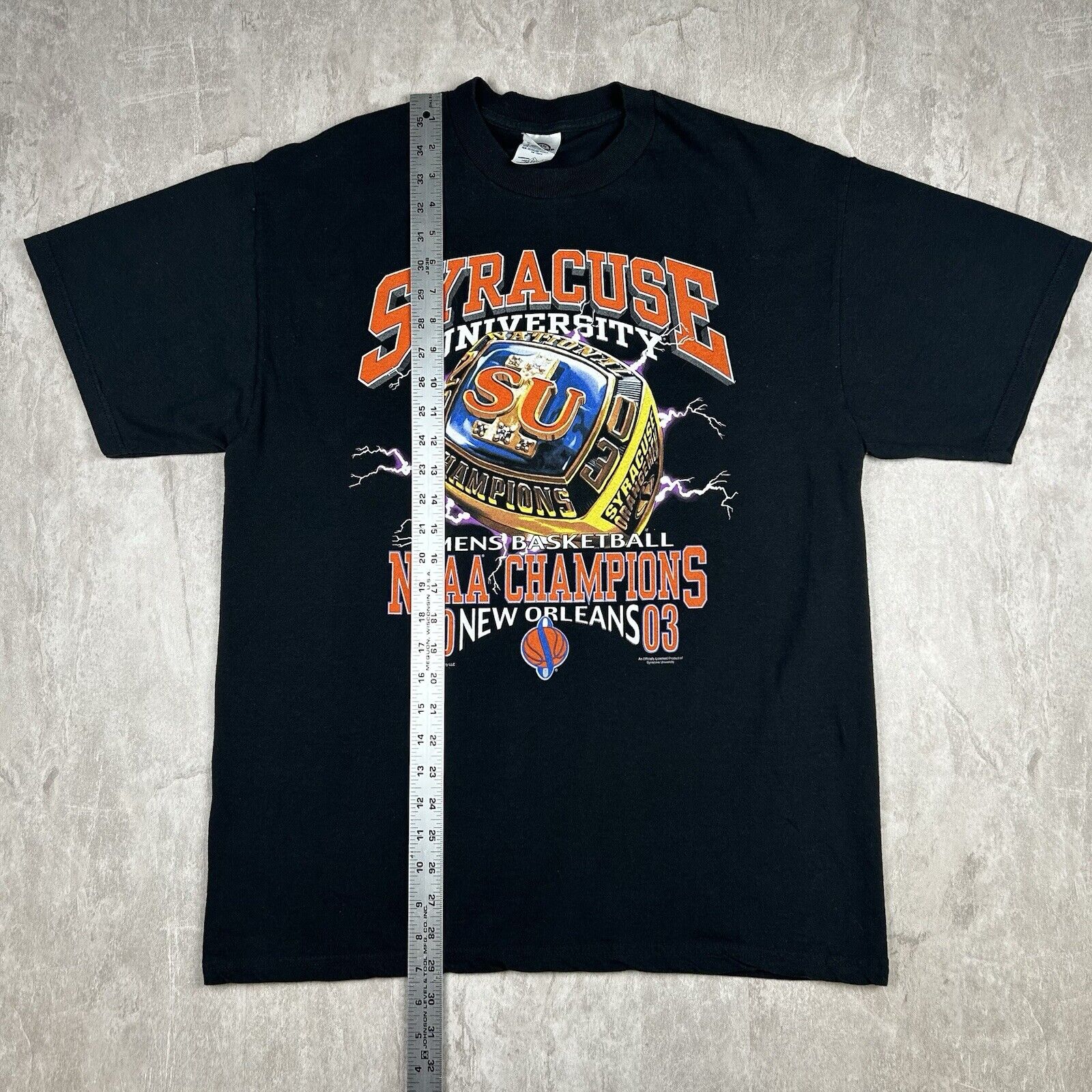 Celebrate history with this Syracuse Orange 2003 NCAA Championship T-Shirt in Men's Size L. Featuring a bold black design with vibrant orange and white graphics, this tee commemorates Syracuse's iconic championship win. Made from soft cotton, it's perfect for any university sports fan or collector of classic collegiate gear. A must-have for Orange supporters and 2000s sportswear enthusiasts!