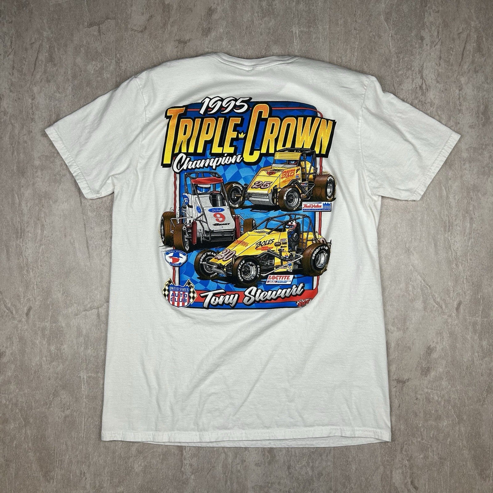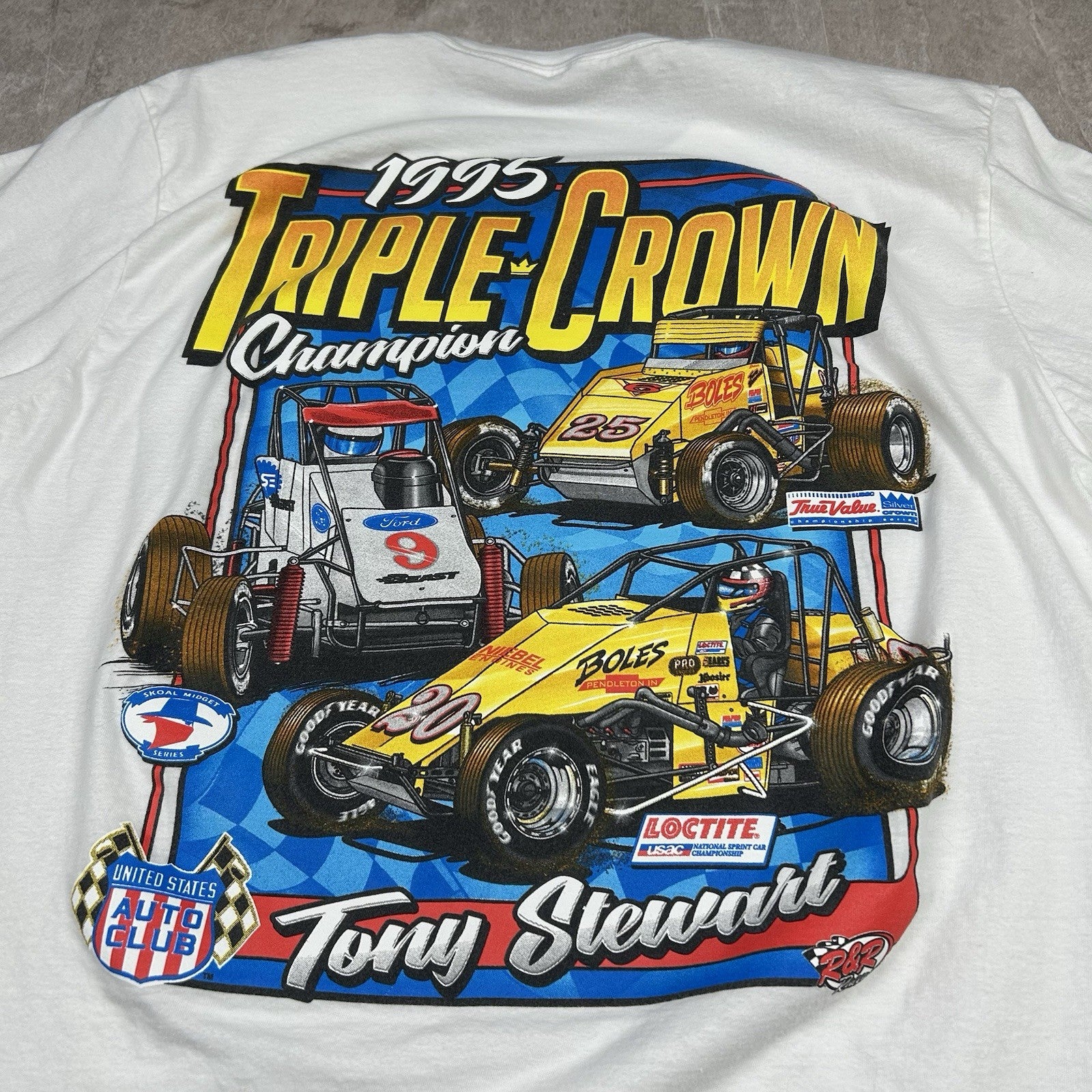 Celebrate a legend with this vintage Tony Stewart NASCAR Triple Crown Champion '95 tee. Bold graphics on a crisp white shirt make it a must-have for racing fans. Men's size unknown—see measurements for fit.