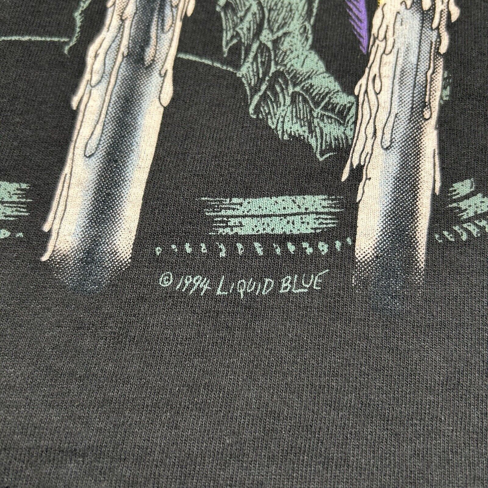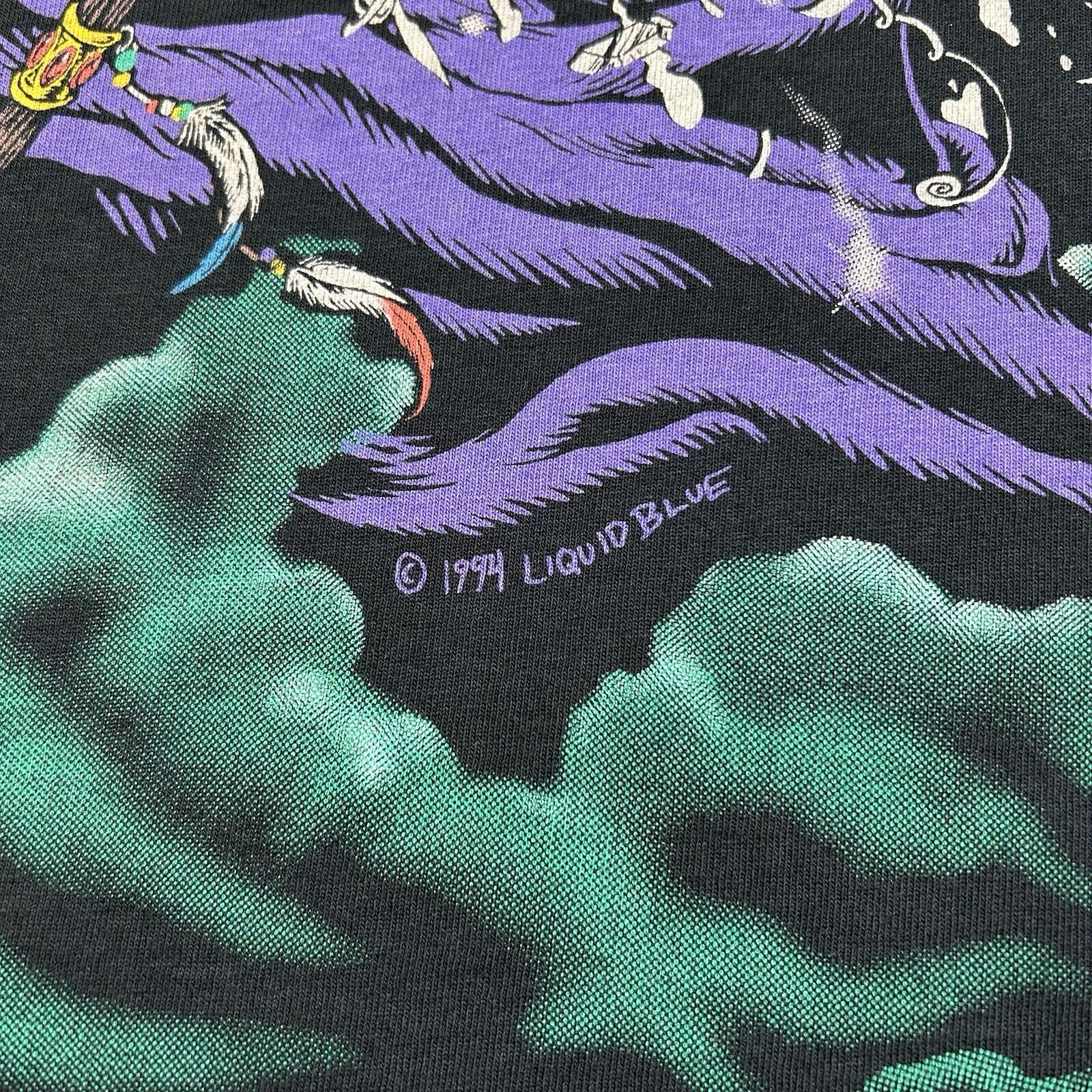 This vintage 1994 Liquid Blue Wizard T-Shirt showcases a stunning all-over print with double-sided graphics, capturing a magical, mystical design. Made in Men's Size XL, it's a standout piece for collectors and fans of unique 90s fashion.