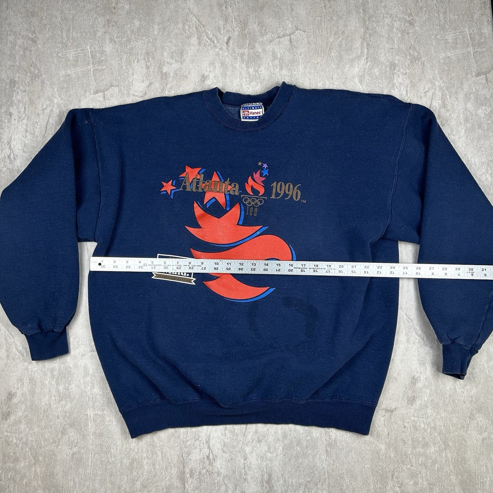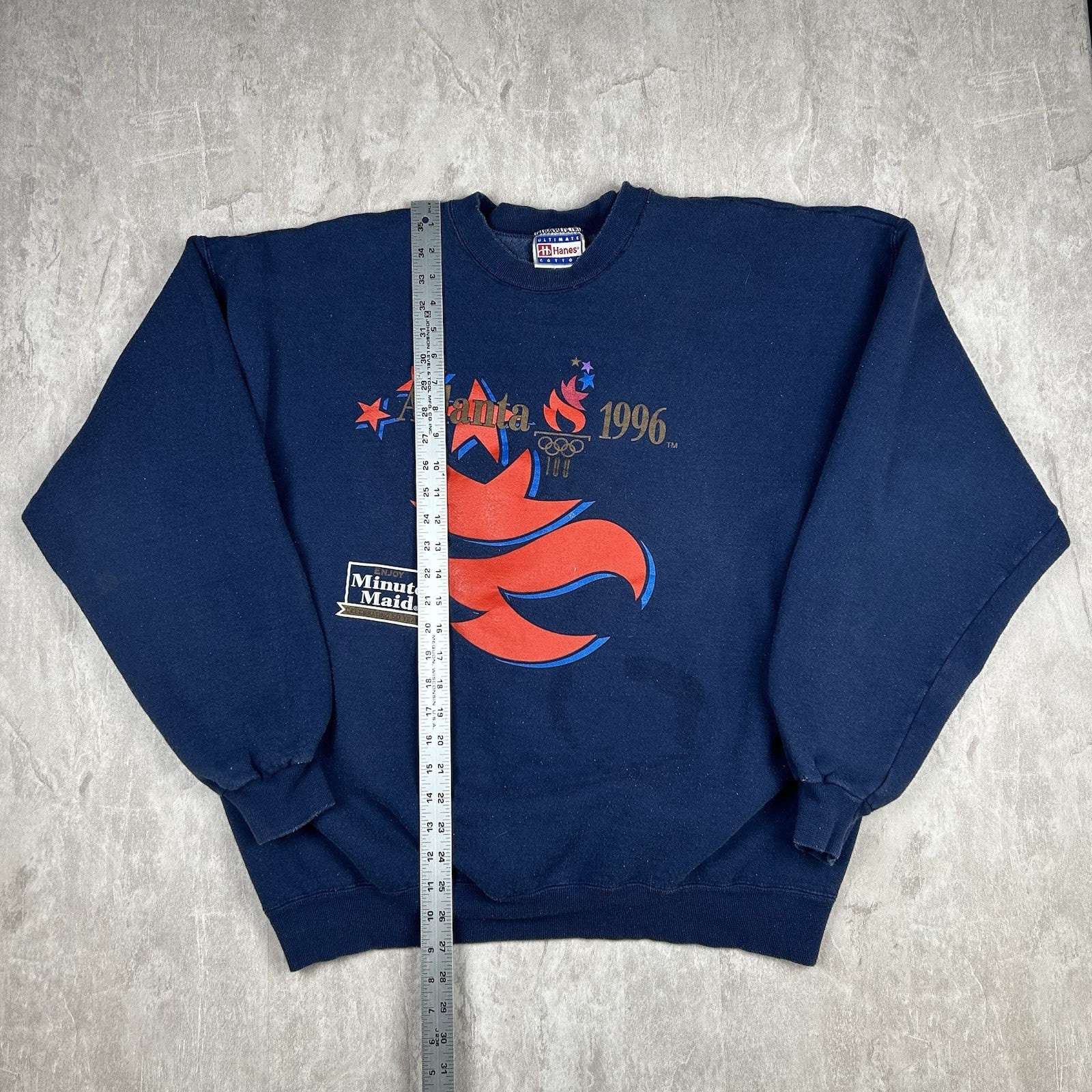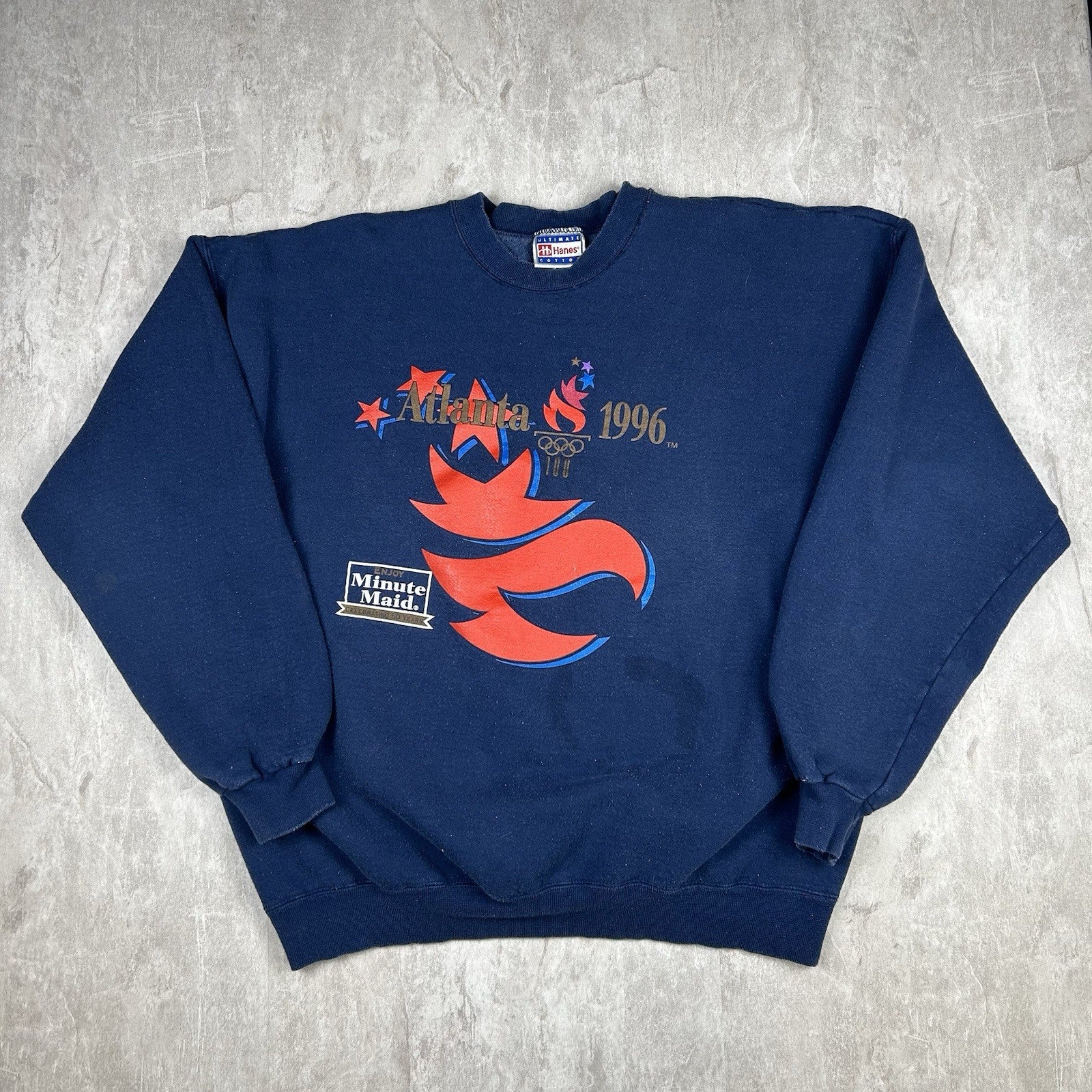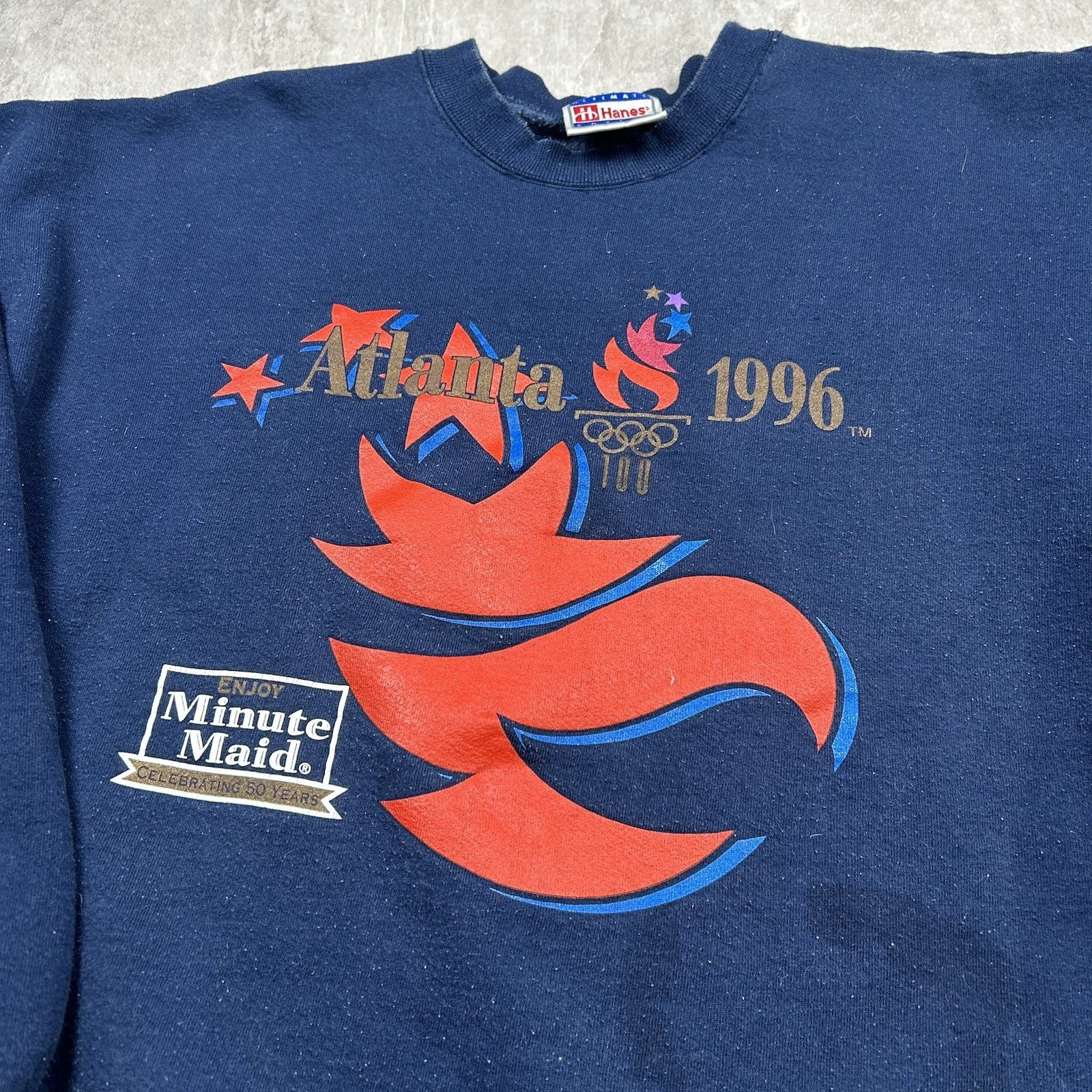 Celebrate the Centennial Olympic Games with this vintage 1996 Atlanta crewneck sweatshirt in classic blue. A staple of 90s sports nostalgia, tagged Men's Size XL — see photos for condition and measurements.