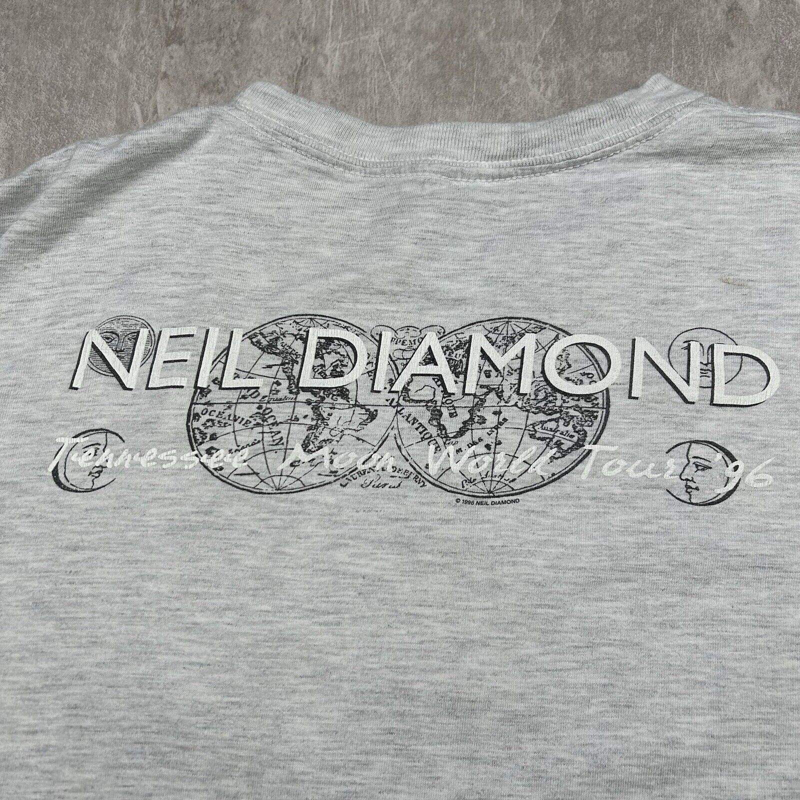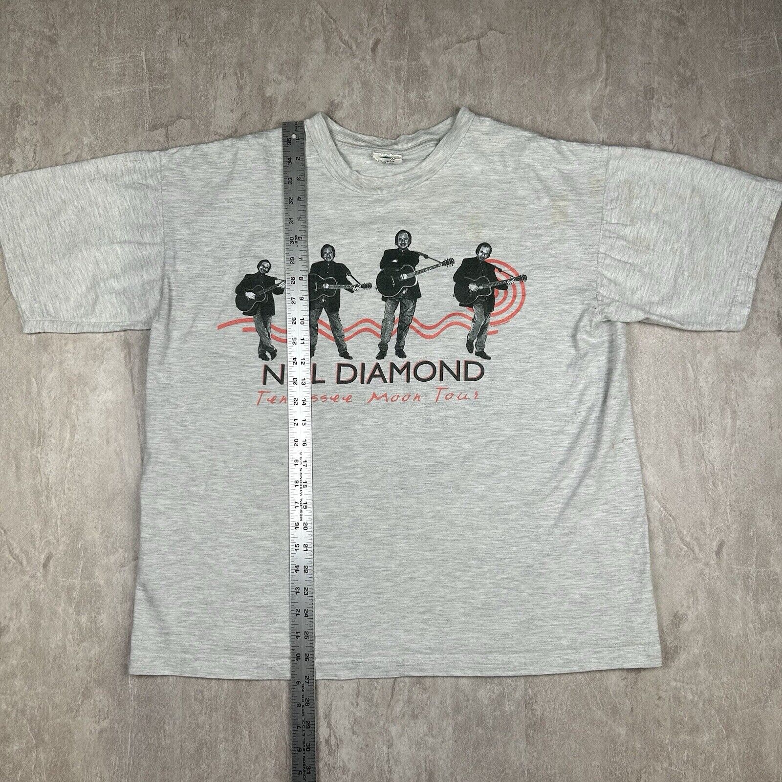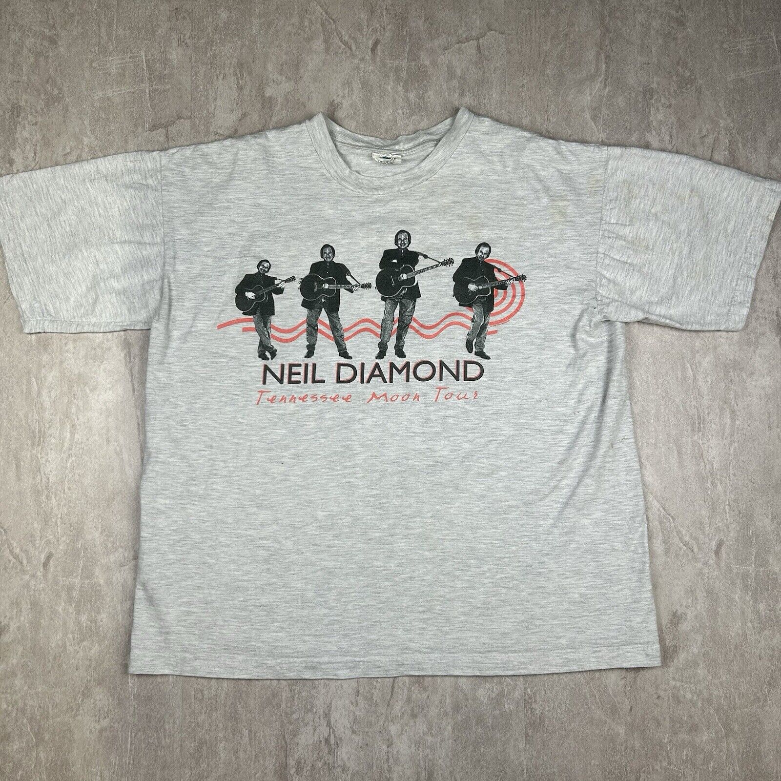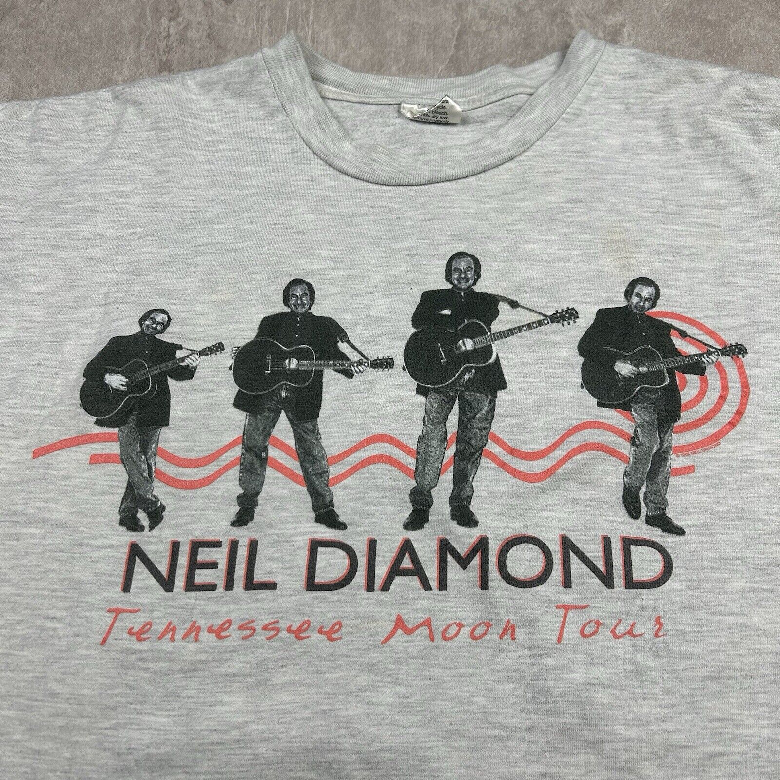 This Vintage 1996 Neil Diamond Tennessee Moon Tour T-Shirt in size XL features a classic gray design celebrating his iconic tour. A must-have for fans of the legendary singer and collectors of vintage concert memorabilia.