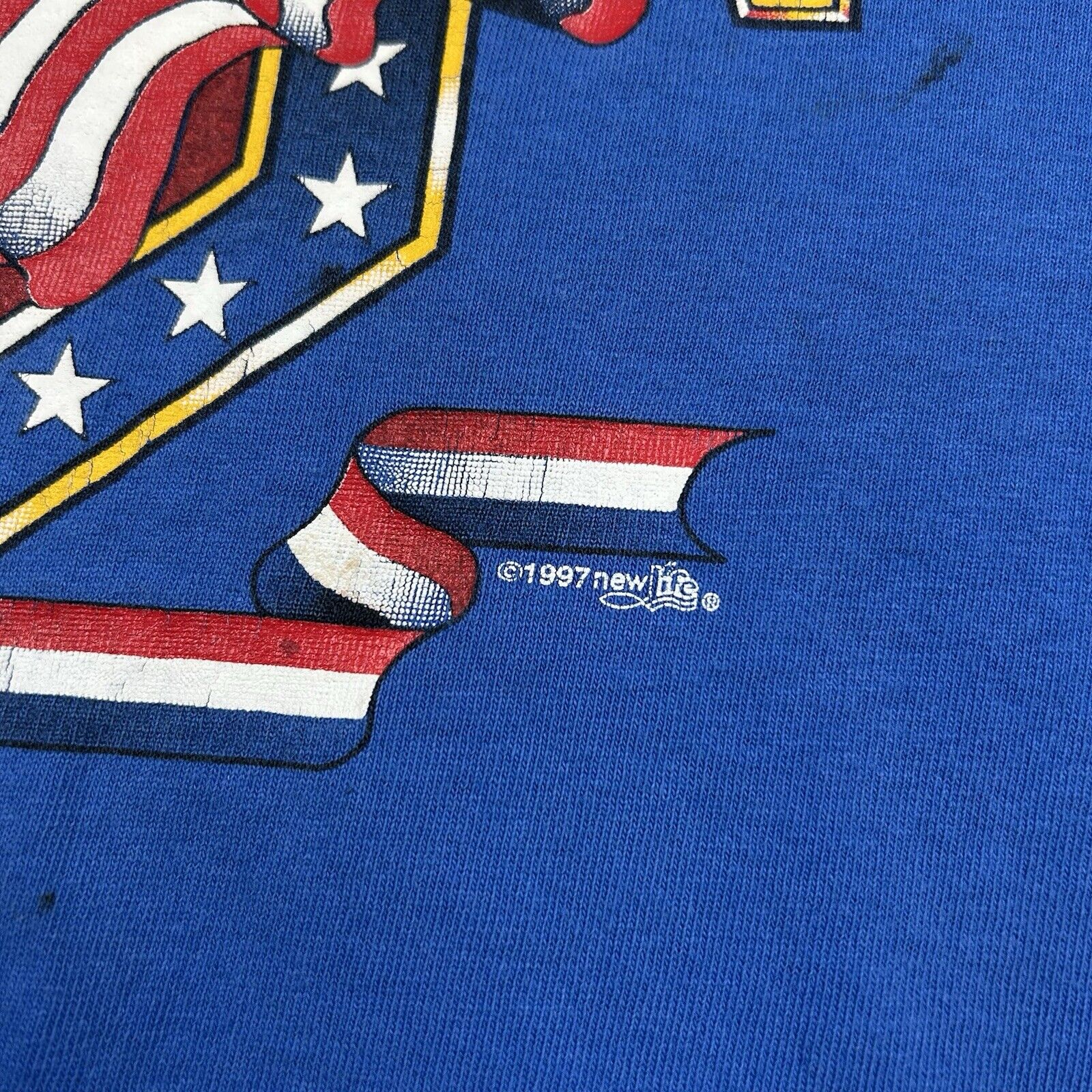 Show your patriotic spirit with this Vintage 1997 Proud to be American T-Shirt. Featuring a bold eagle graphic and flag design on a classic blue background, this tee embodies American pride. Made for comfort and style, it's perfect for casual wear or celebrating national holidays. Size is unknown, making it a versatile addition to any vintage collection.
