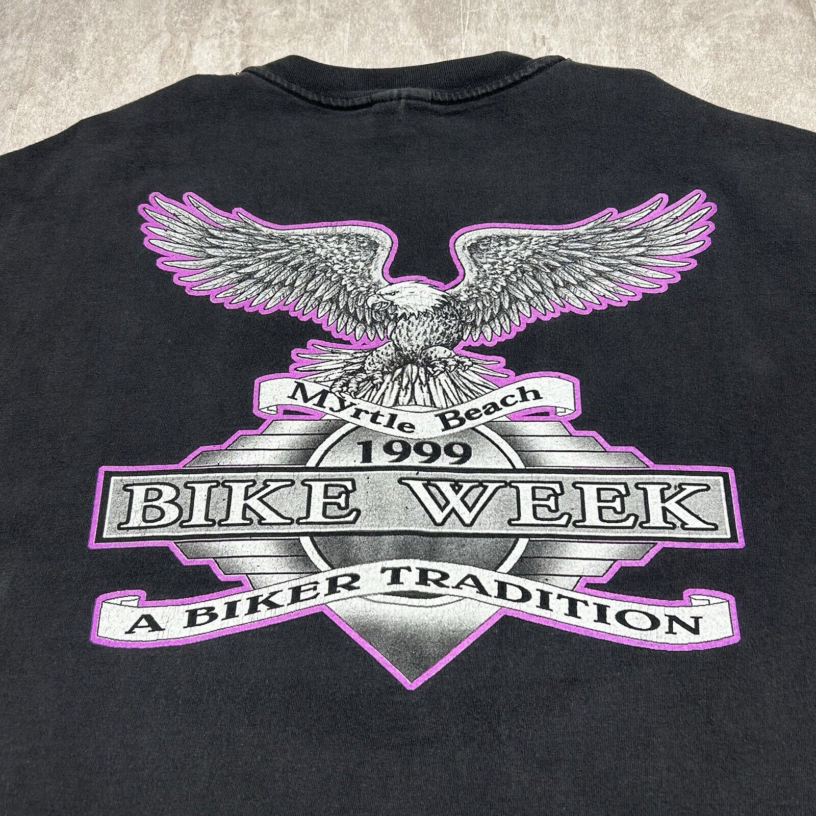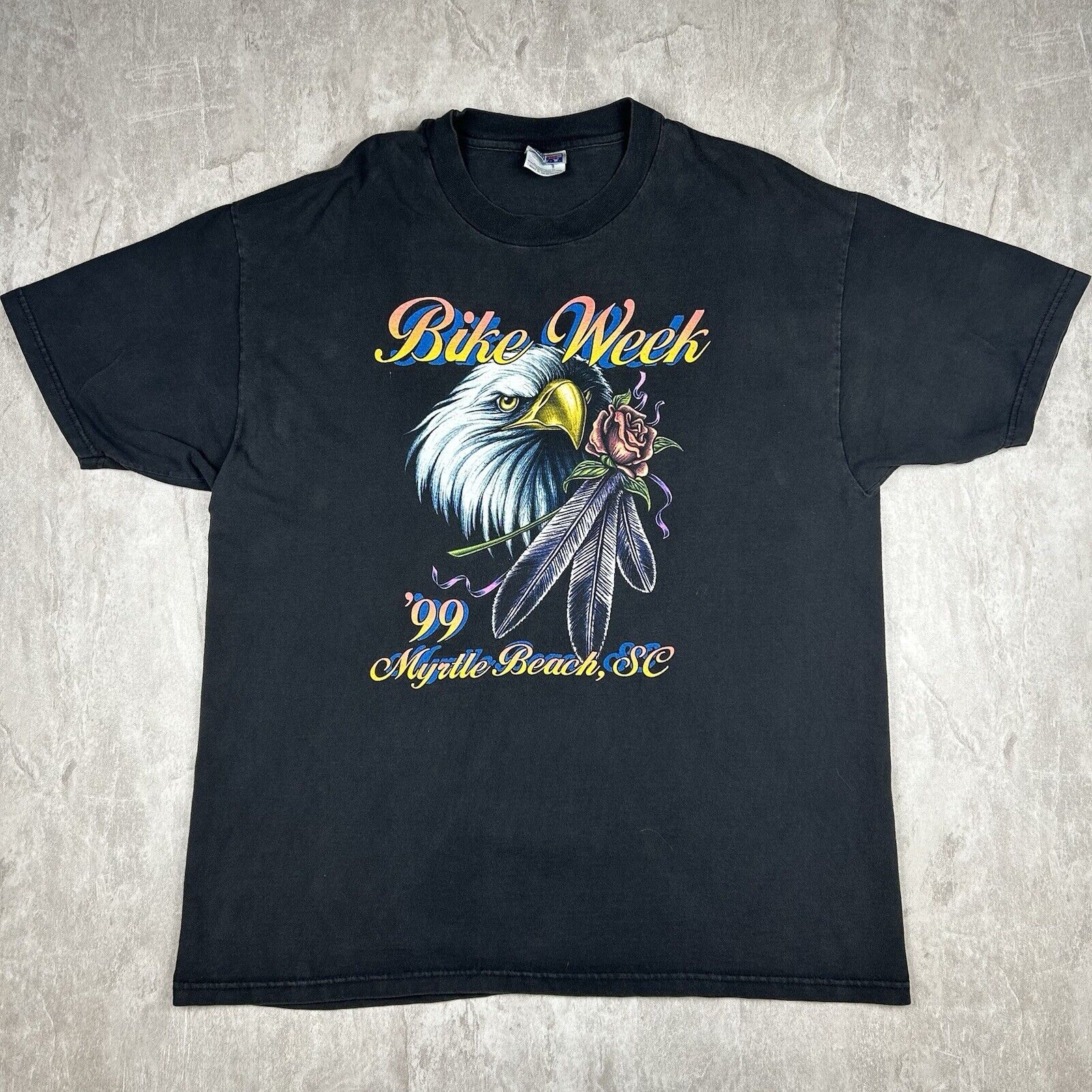 This vintage 1999 Myrtle Beach SC Bike Week T-shirt features a bold black design, celebrating the iconic event. In Men's size XL, it's a perfect find for collectors or motorcycle enthusiasts, offering a classic piece of Myrtle Beach's bike culture.