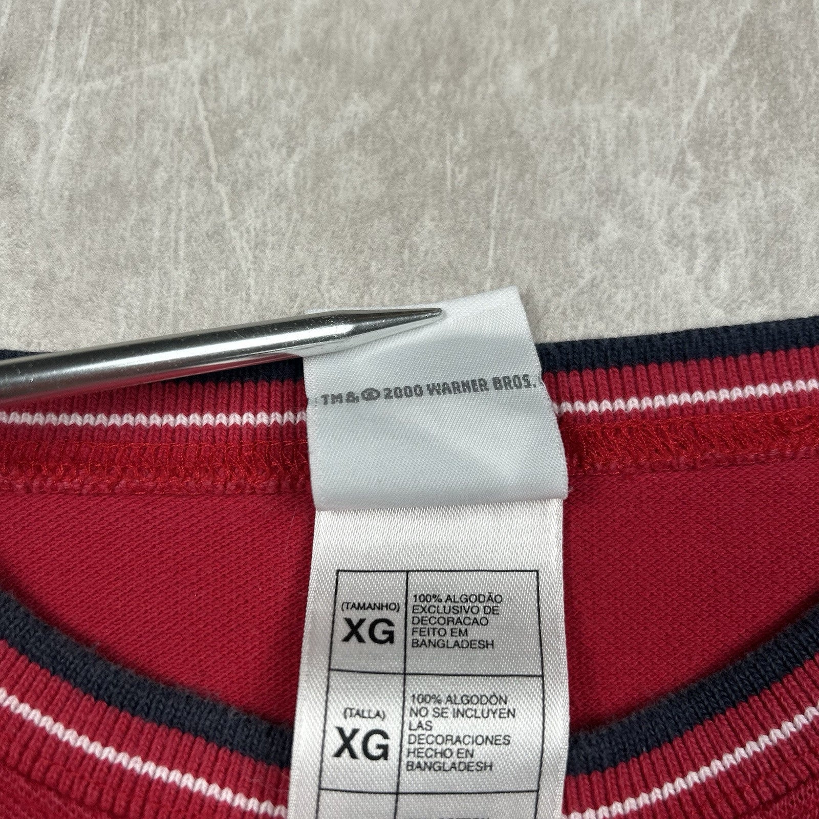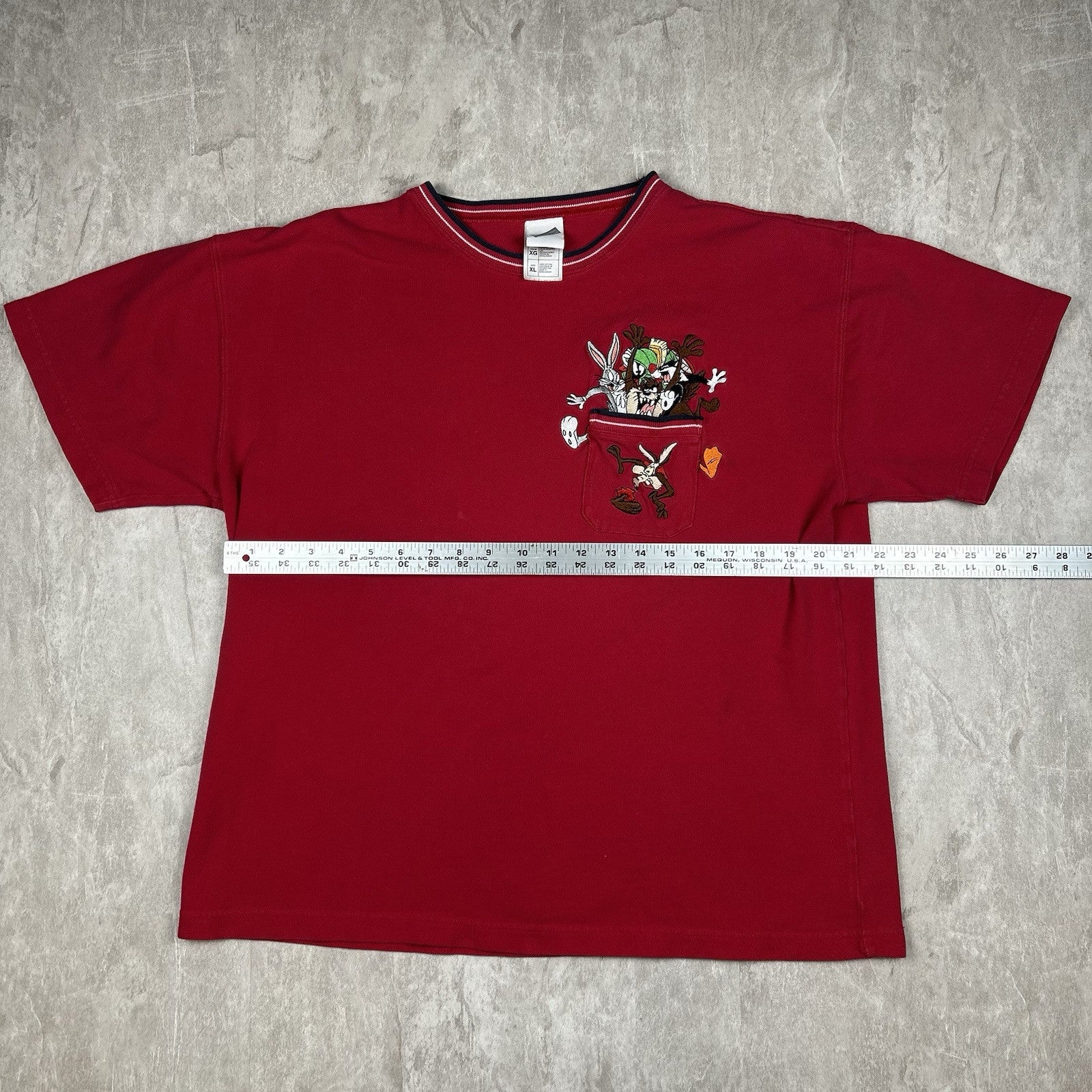 This vintage 2000 Looney Tunes t-shirt features embroidered pocket details with iconic characters like Taz and Bugs Bunny. Made from soft cotton, it's a classic design in a men's size XL, perfect for fans of the beloved cartoon characters.
