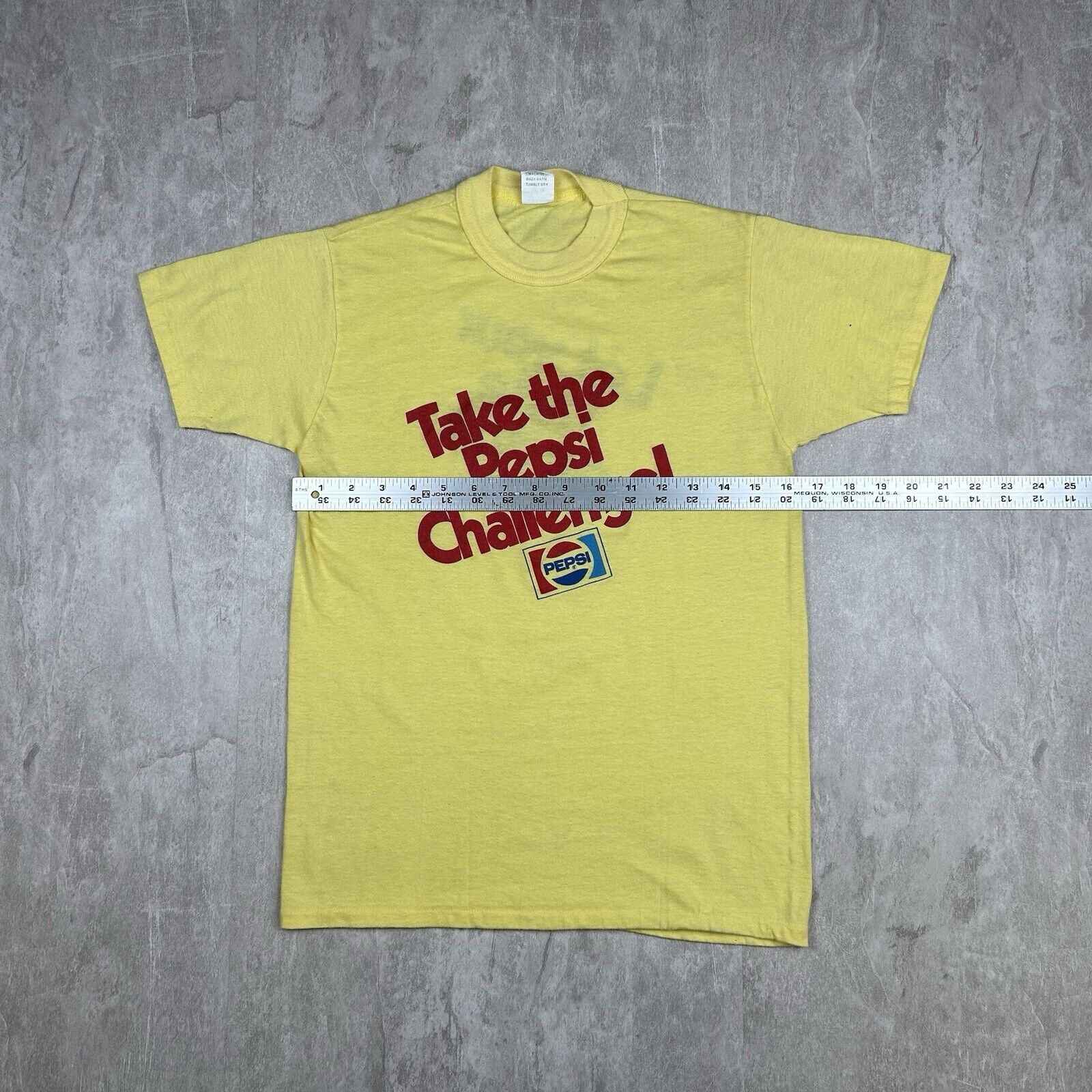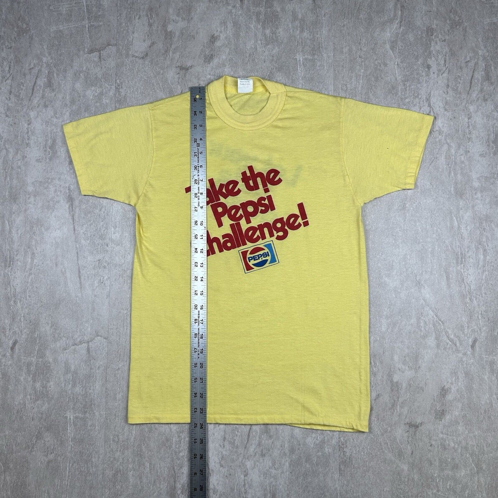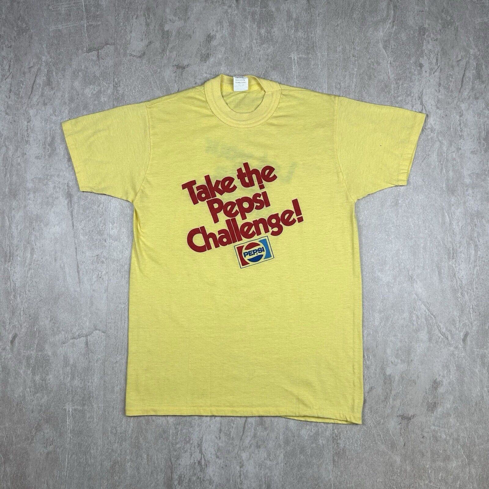 This vintage 70s Pepsi Challenge T-shirt in Men's Size M features a bold yellow design with the classic slogan "Let Your Taste Decide." Capturing the spirit of the iconic marketing campaign, this soft, retro tee is perfect for collectors and fans of nostalgic Pepsi memorabilia. A true classic from the era!