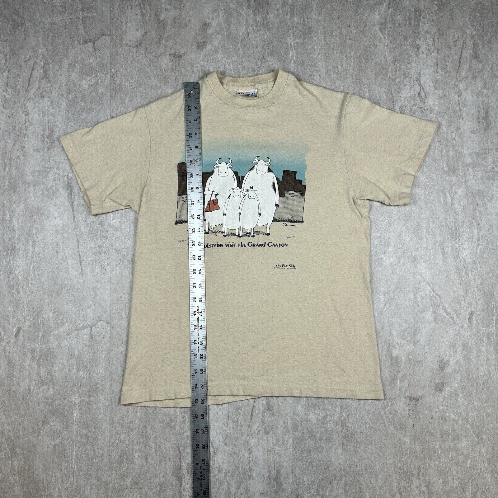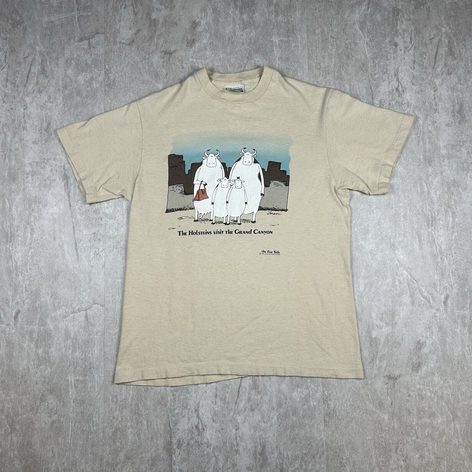 Show off your quirky sense of humor with this Vintage 80s 1985 The Far Side T-Shirt featuring the iconic Holsteins at the Grand Canyon graphic. In men's size M, this tee is perfect for fans of Gary Larson's classic comic strip and lovers of unique, vintage apparel.