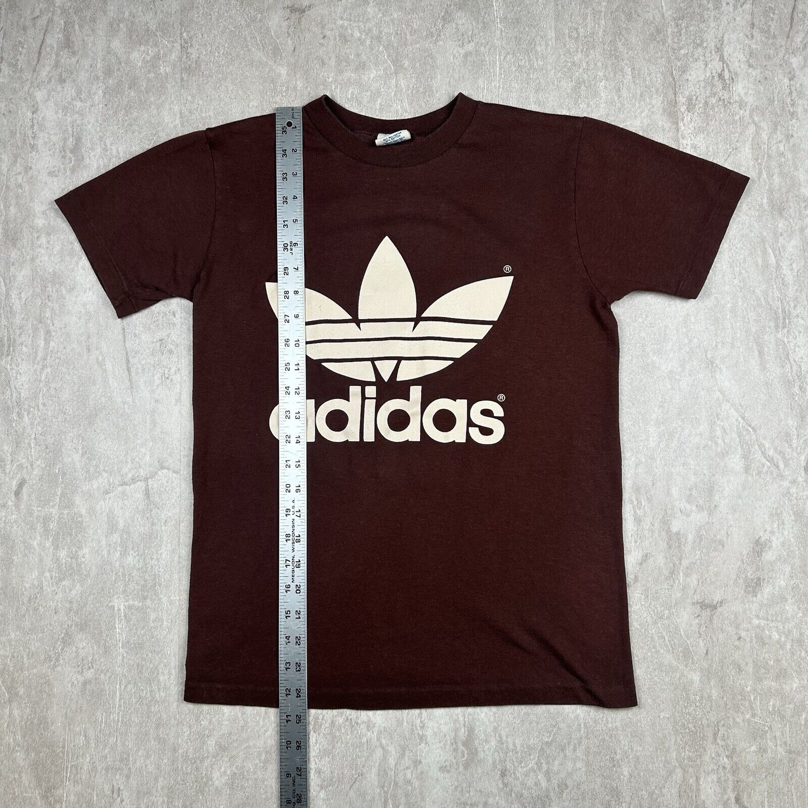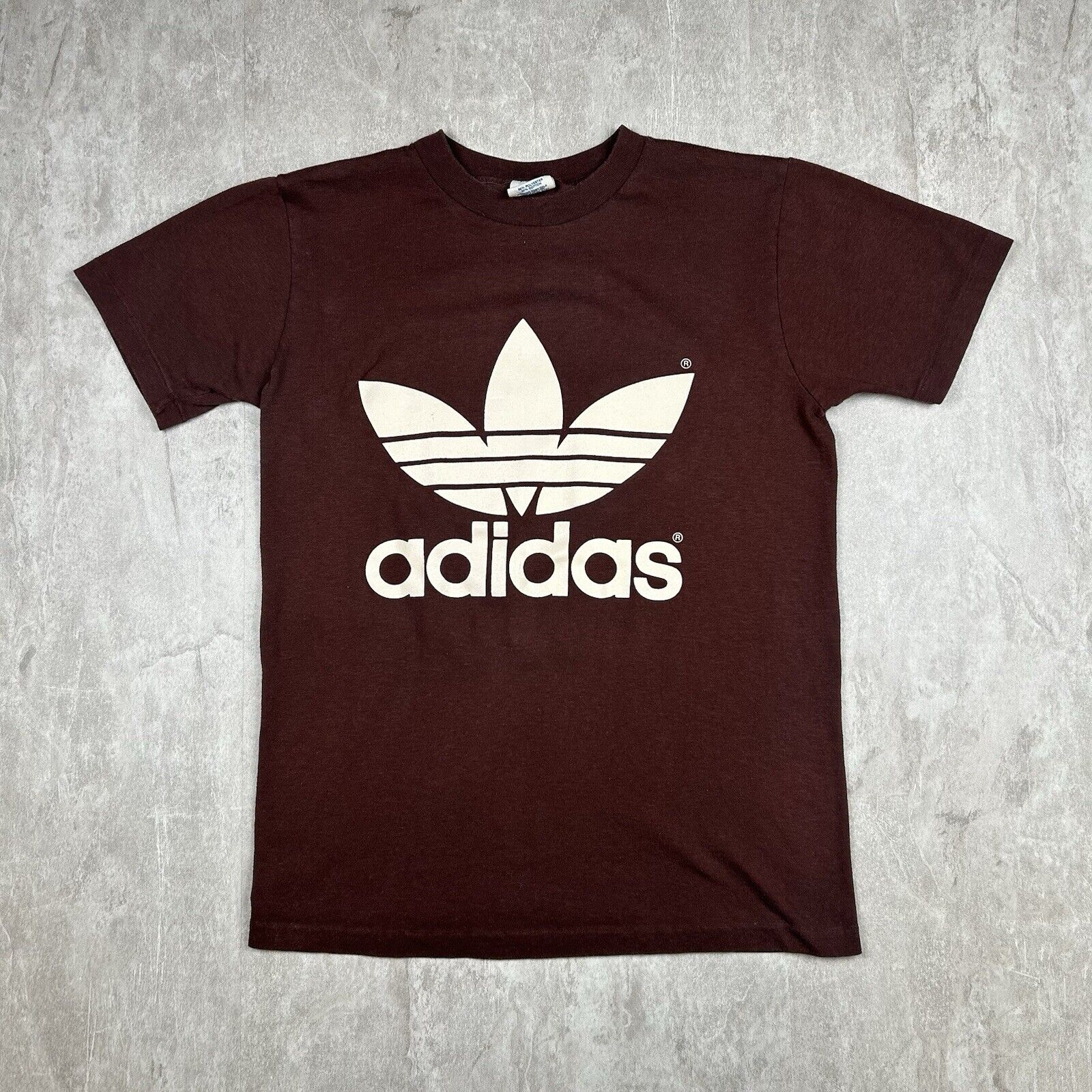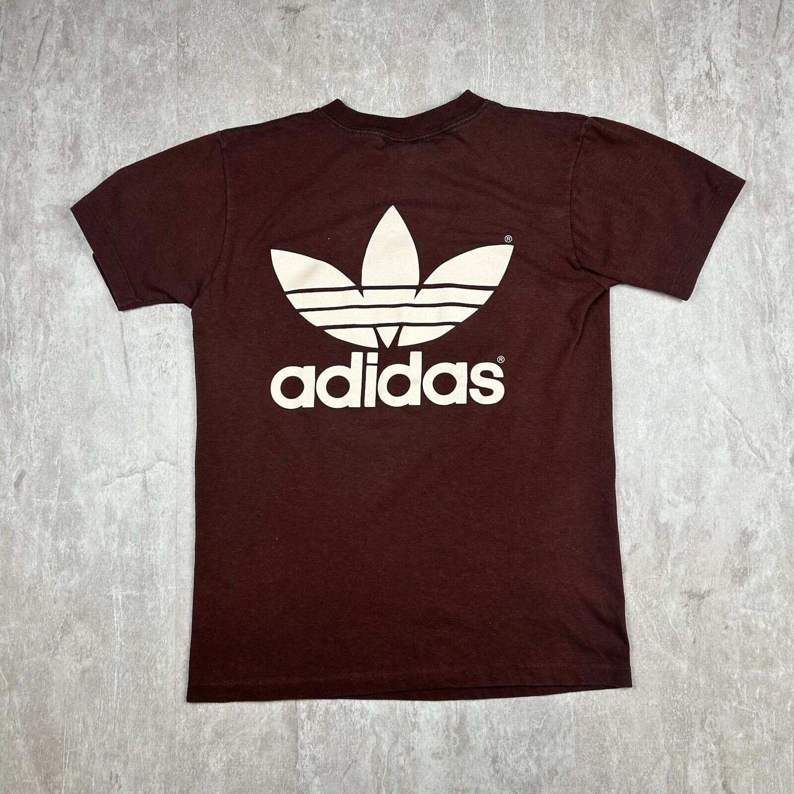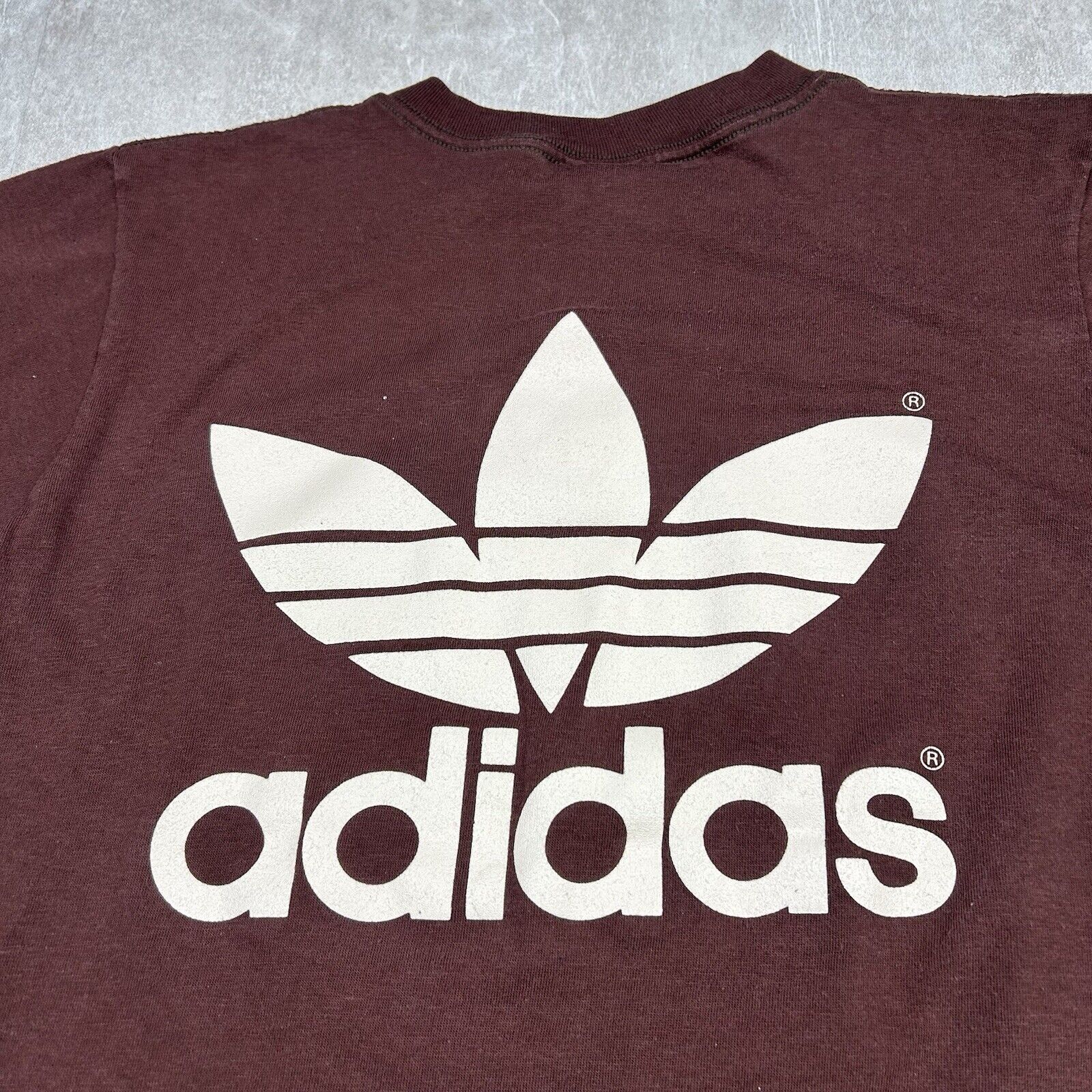 This vintage 80s Adidas T-shirt in maroon features the classic Trefoil logo printed on both the front and back. Made in the USA, this piece captures the retro charm of Adidas from the era. Ideal for any vintage sportswear collector, it's a Men's size S.