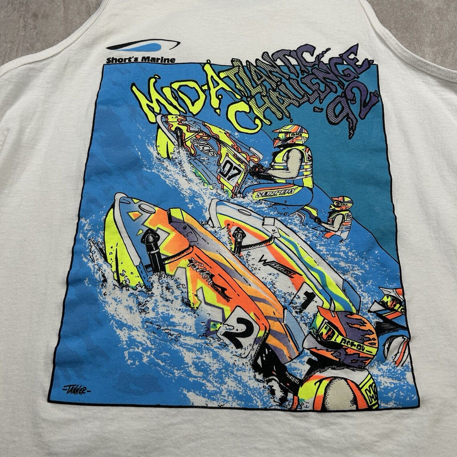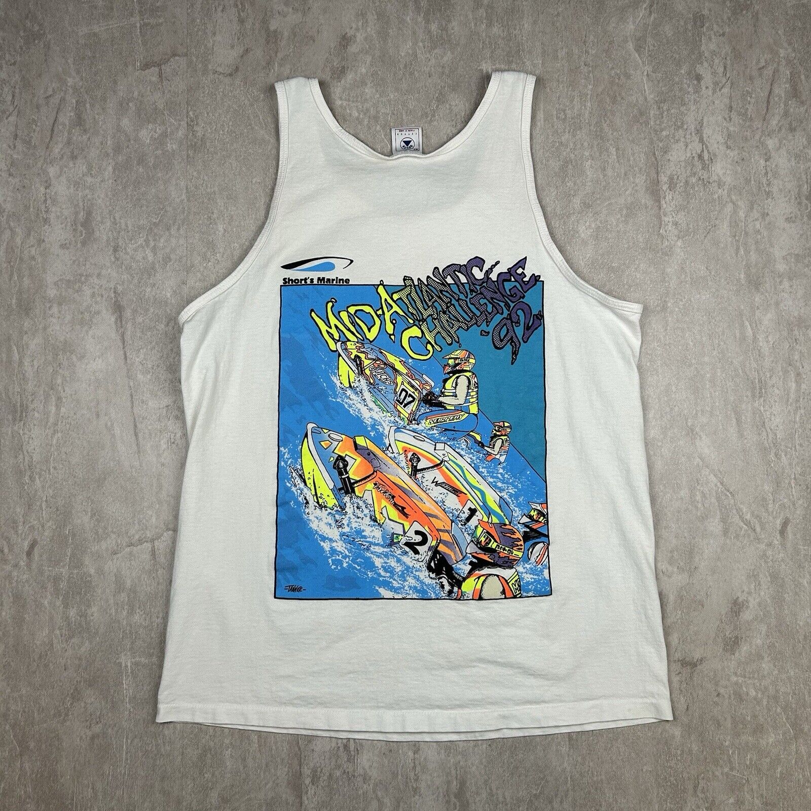 This vintage 90s 1992 Mid Atlantic Challenge tank top in Men's Size XL features bold event graphics from the Maryland race. Made in the USA from soft cotton, this tank offers a relaxed fit with classic motorsport vibes. Perfect for collectors of vintage racing gear or fans of retro athletic apparel!