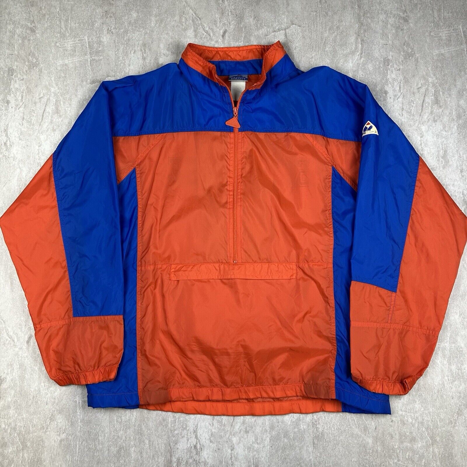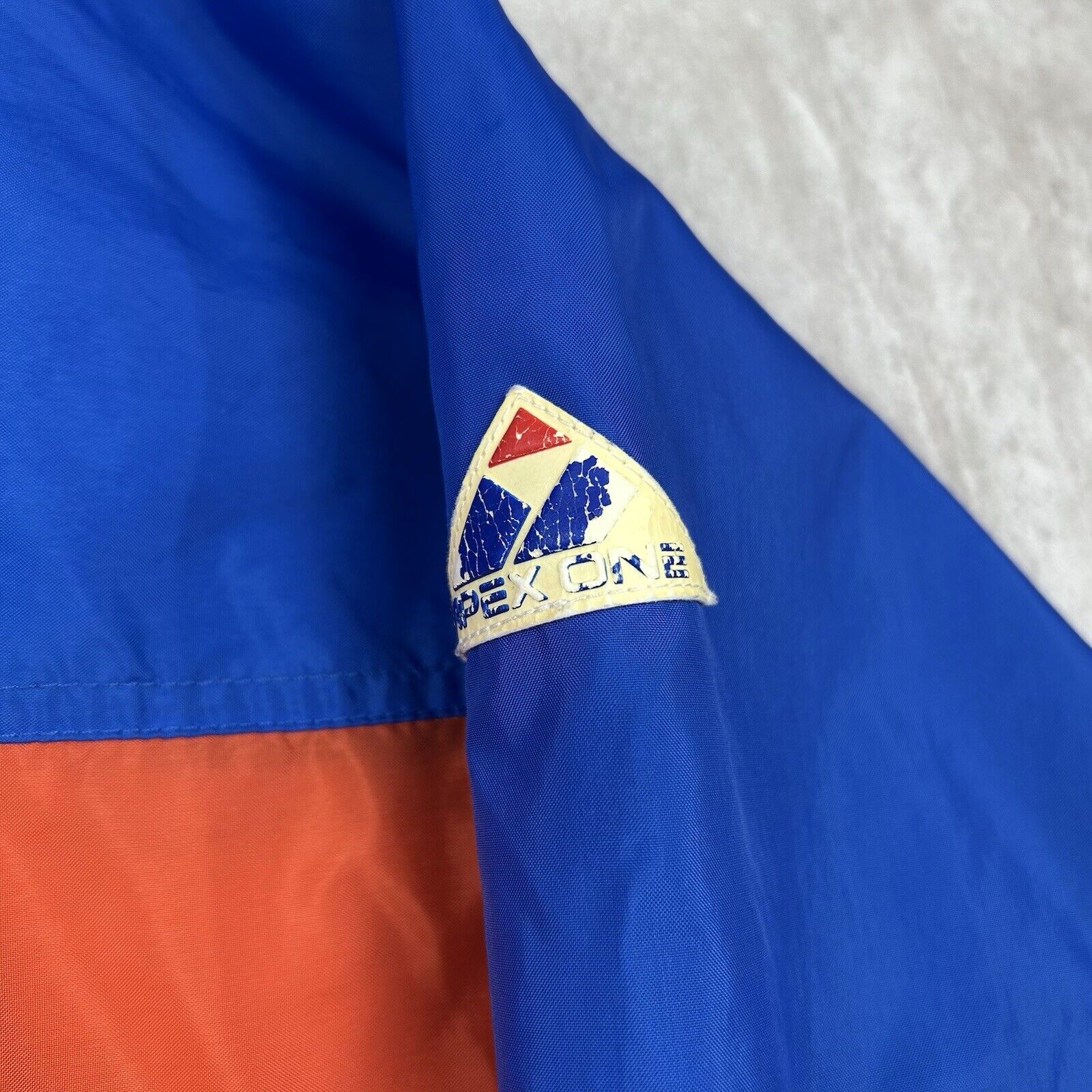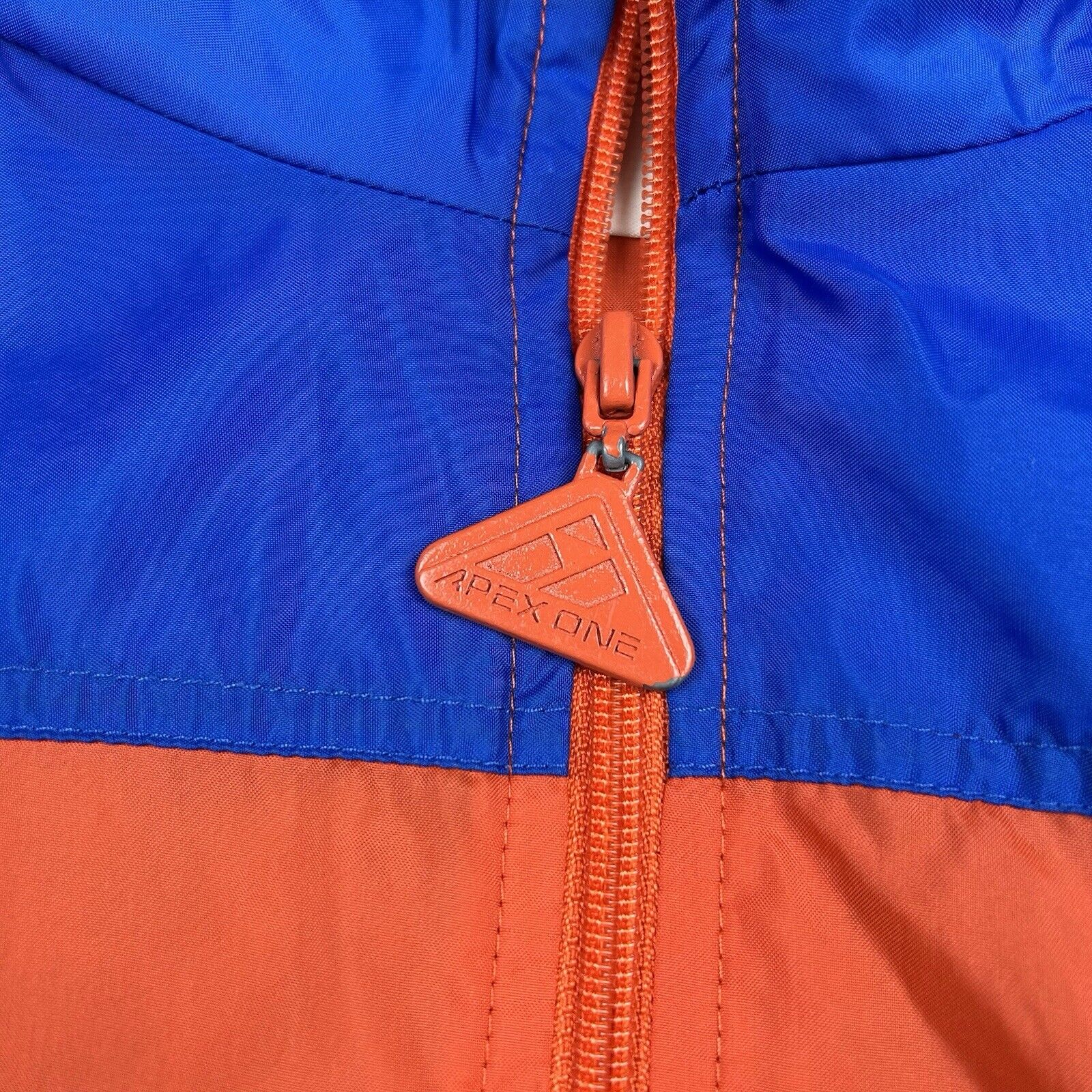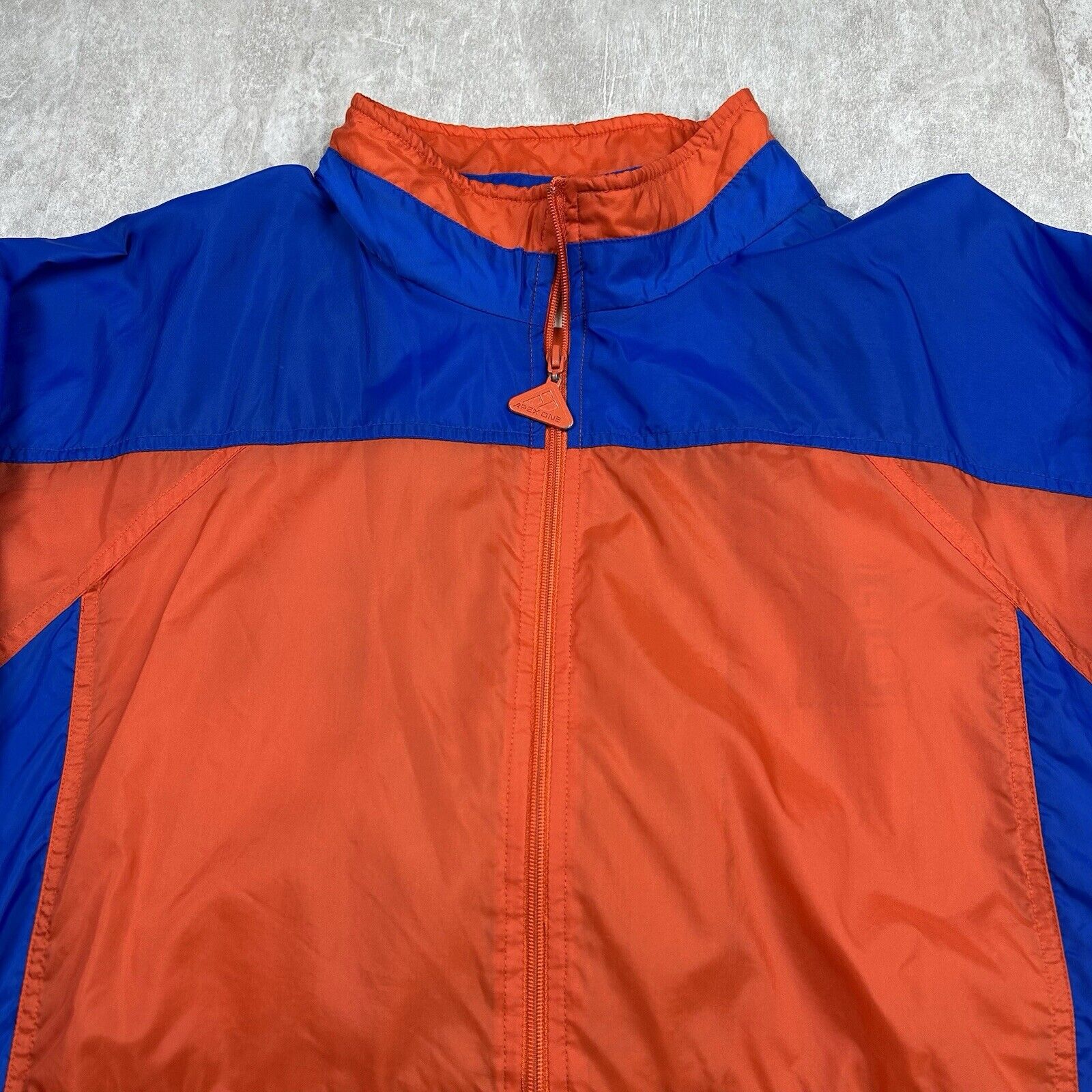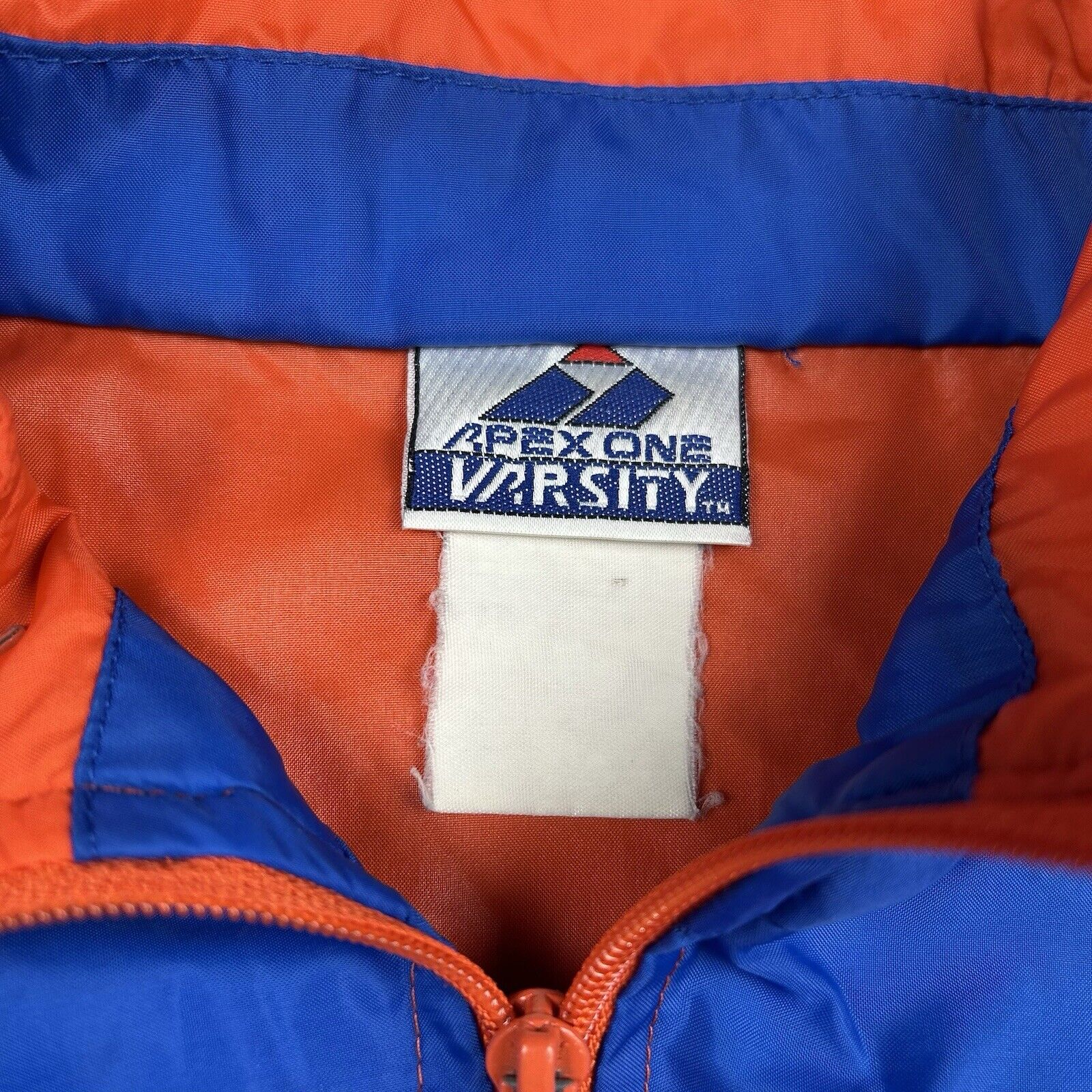 This Vintage 90s Apex One Varsity Syracuse Zip Pull-Over Jacket features the classic Syracuse University colors and design. A retro sports jacket with a stylish zip pull-over style, it's perfect for fans of the school or vintage sportswear. Size is unspecified.