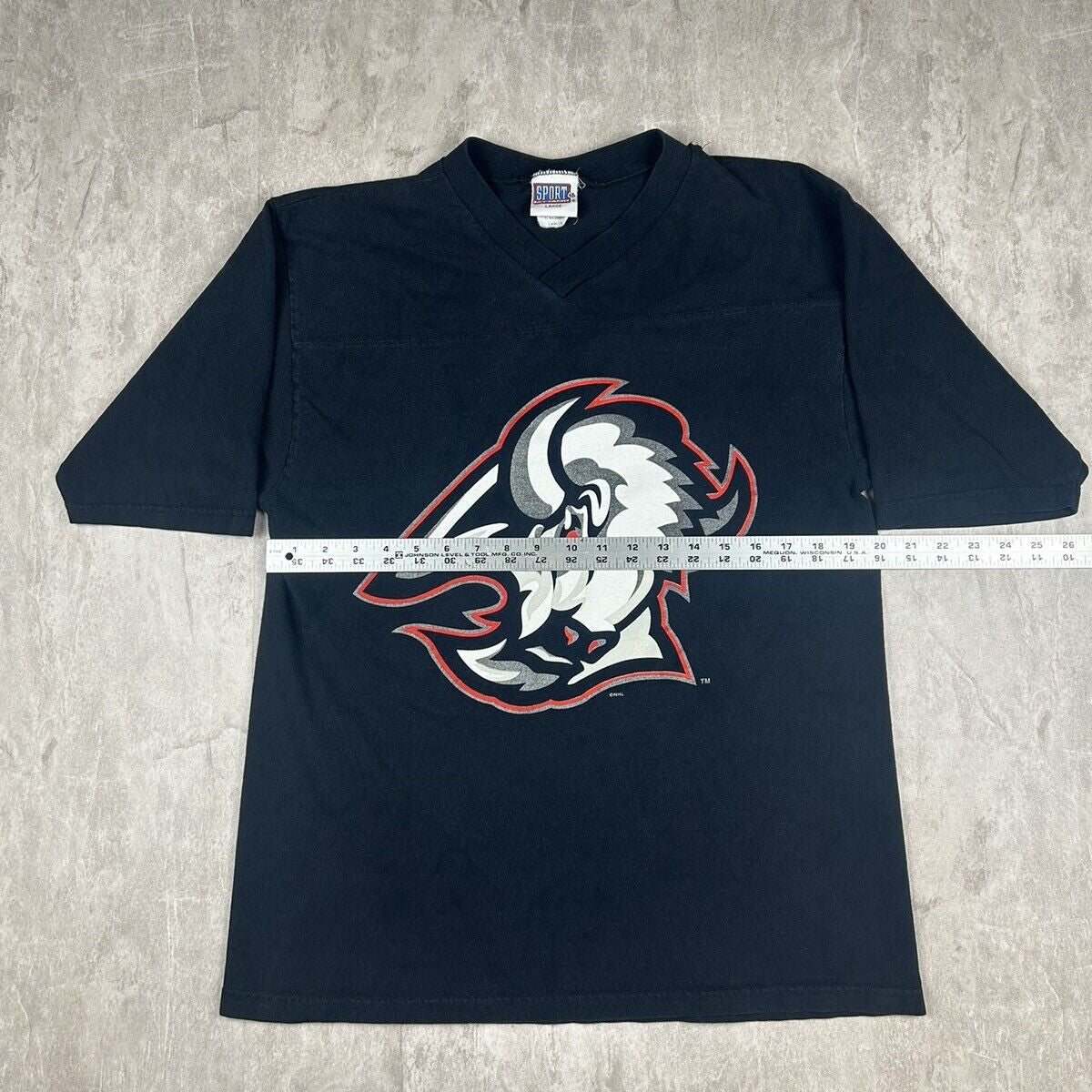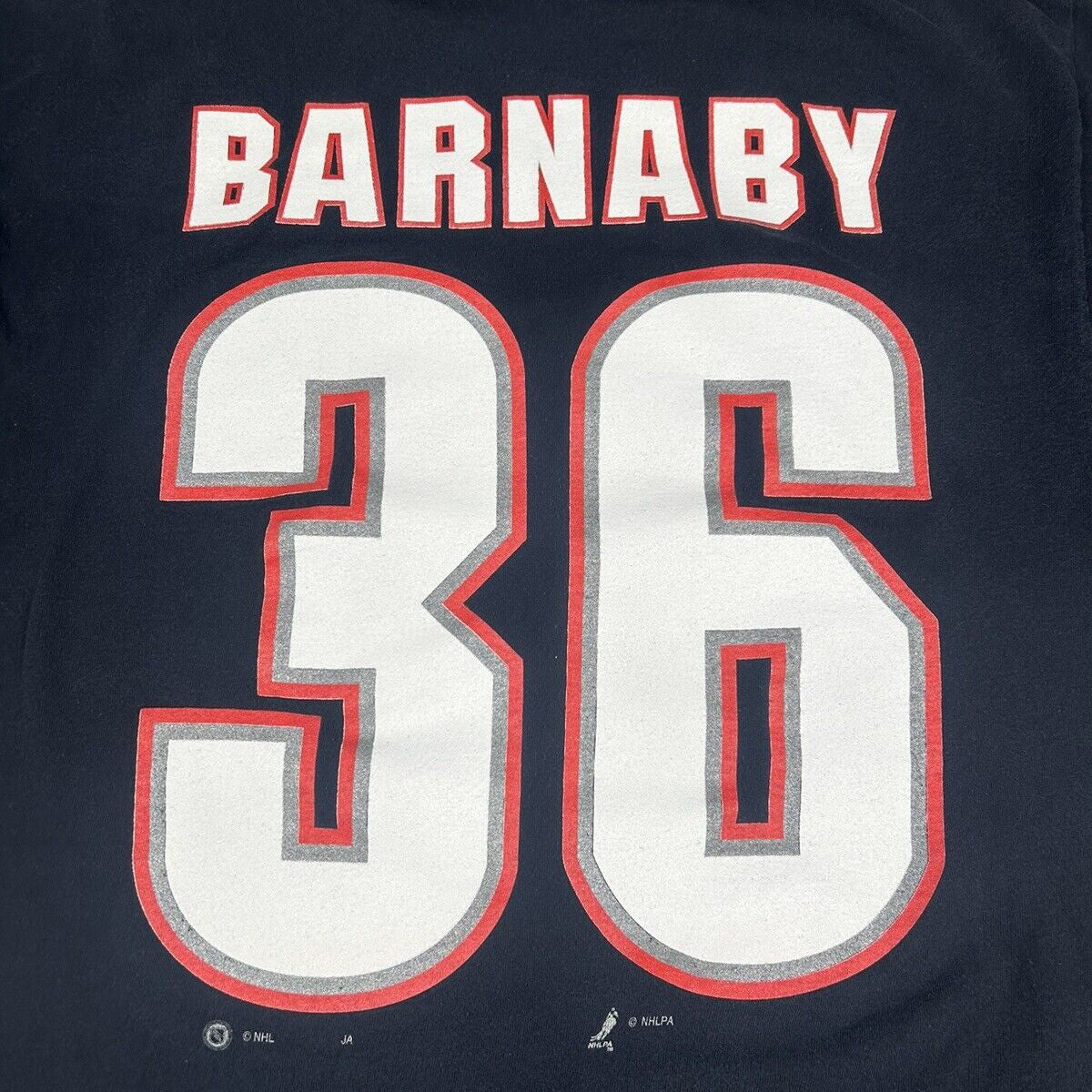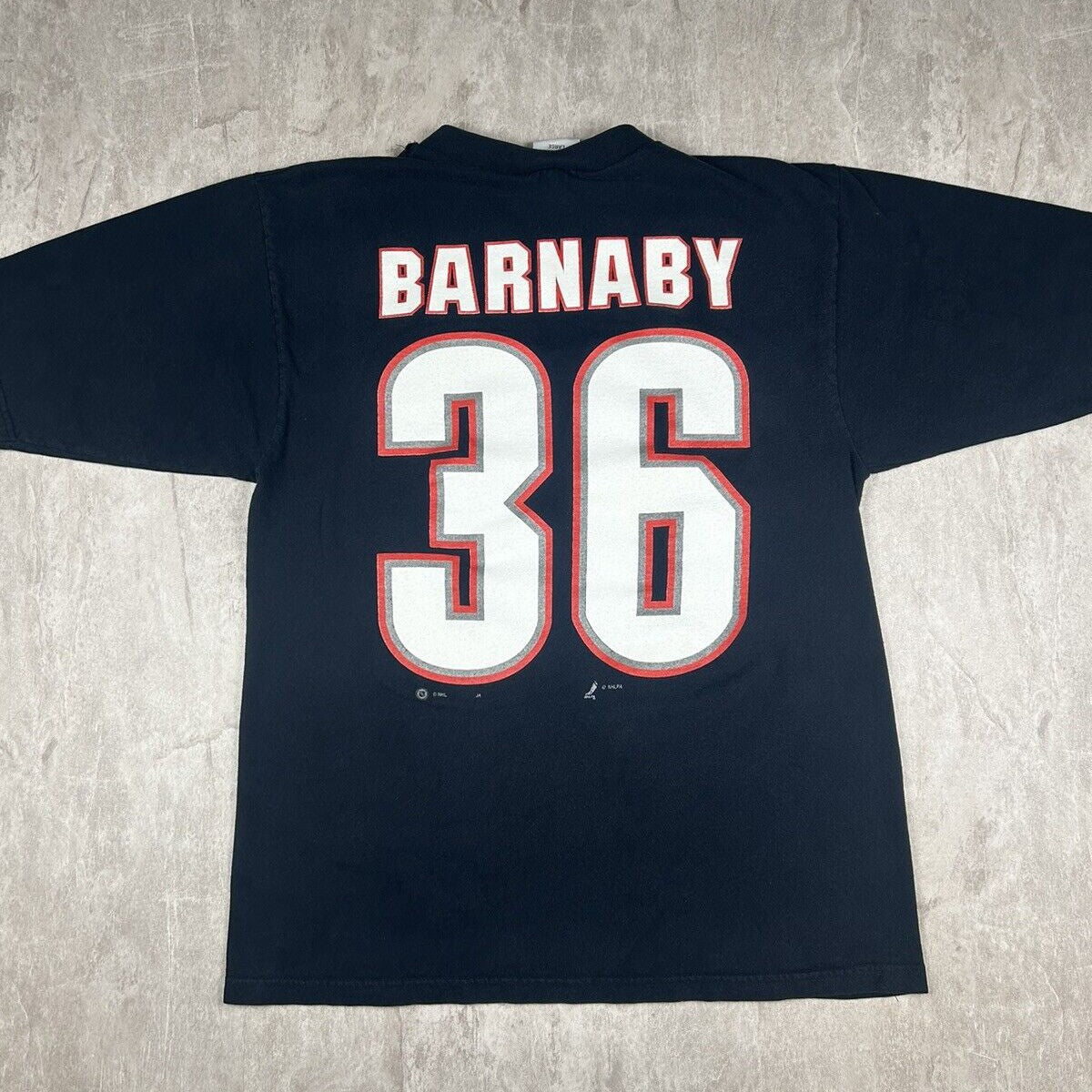 This Vintage 90s Buffalo Sabres Matthew Barnaby T-Shirt, in men's size L, features the iconic Goathead logo on a classic black design. Celebrating one of the team's most memorable eras, it's a must-have for fans and collectors of Sabres memorabilia.