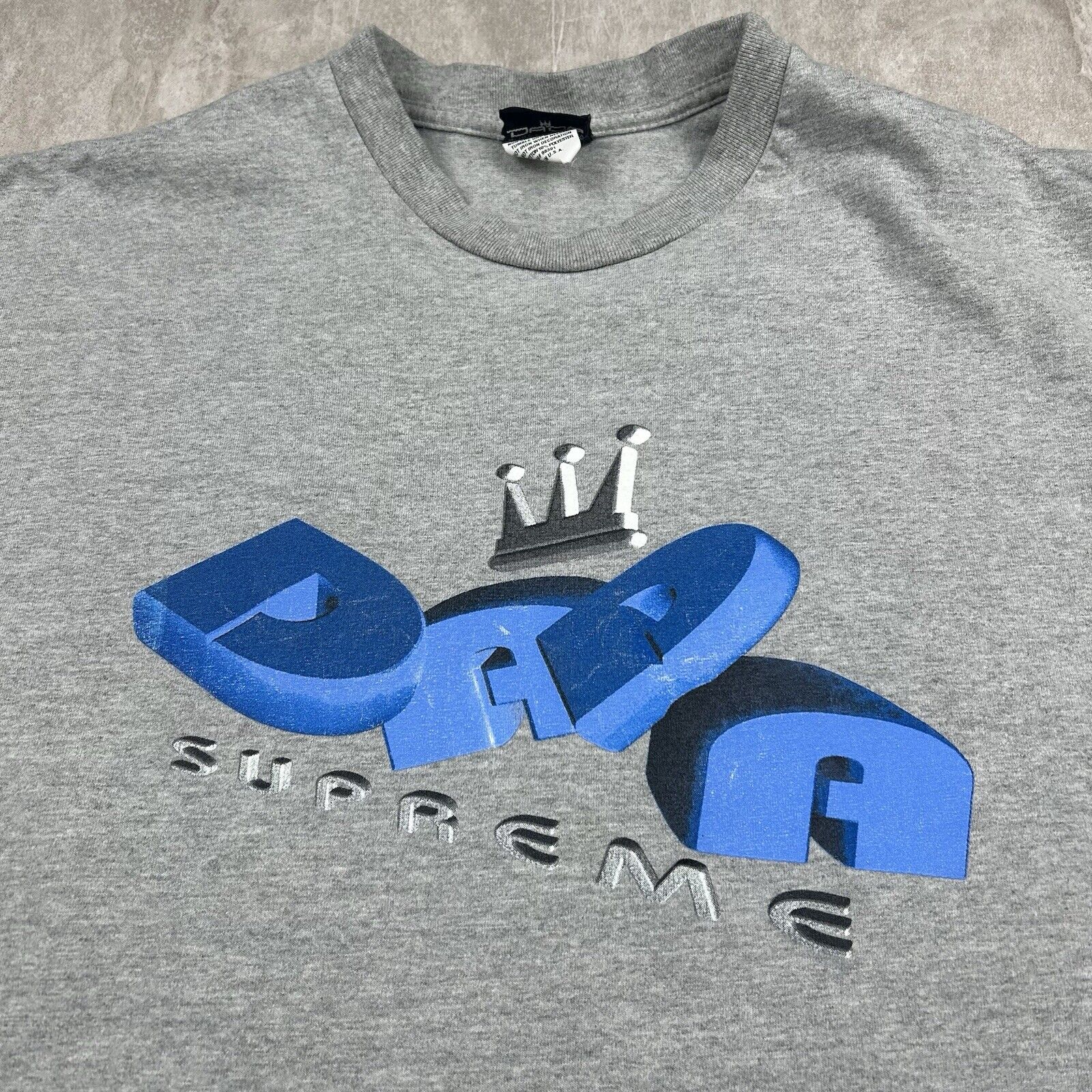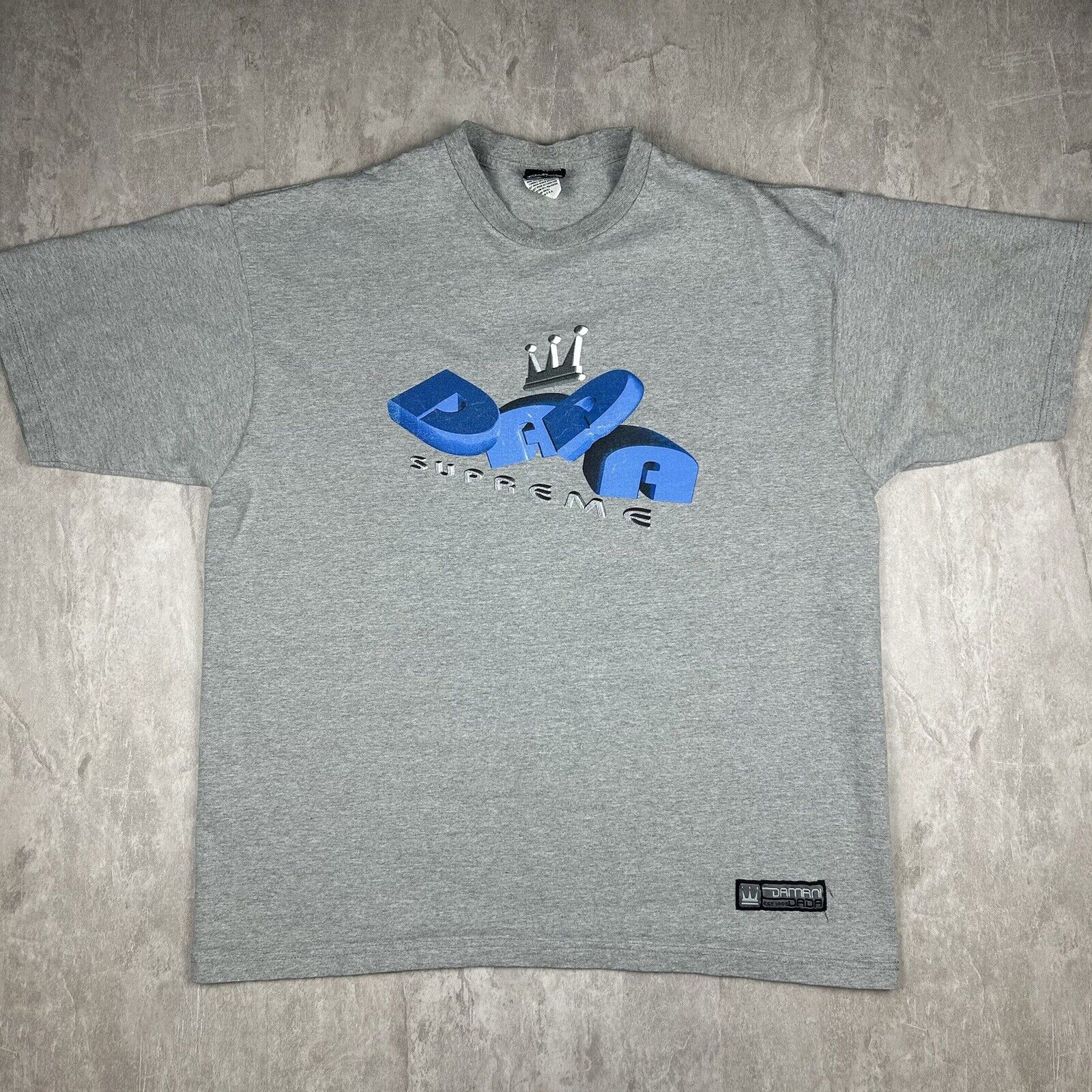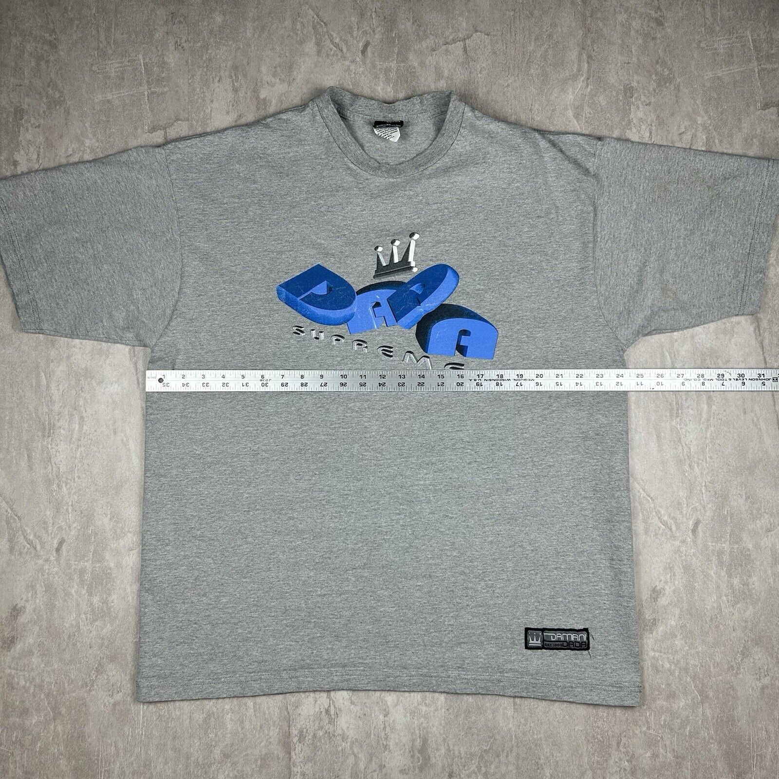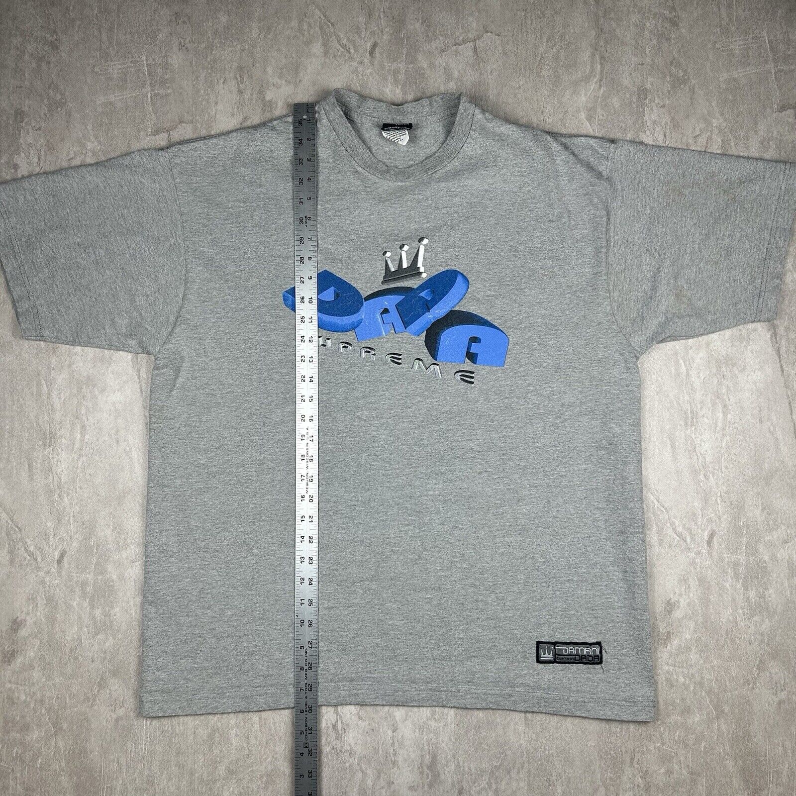 Throw it back to the early 2000s with this vintage 90s Damani Dada Supreme Team T-shirt in gray. A hip-hop staple, this USA-made Men's Size XL tee embodies Y2K style with its bold design and streetwear roots. A must-have for fans of retro urban fashion.
