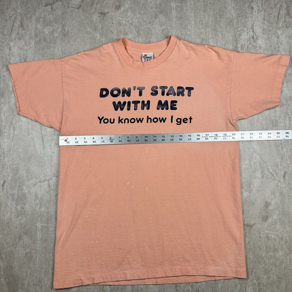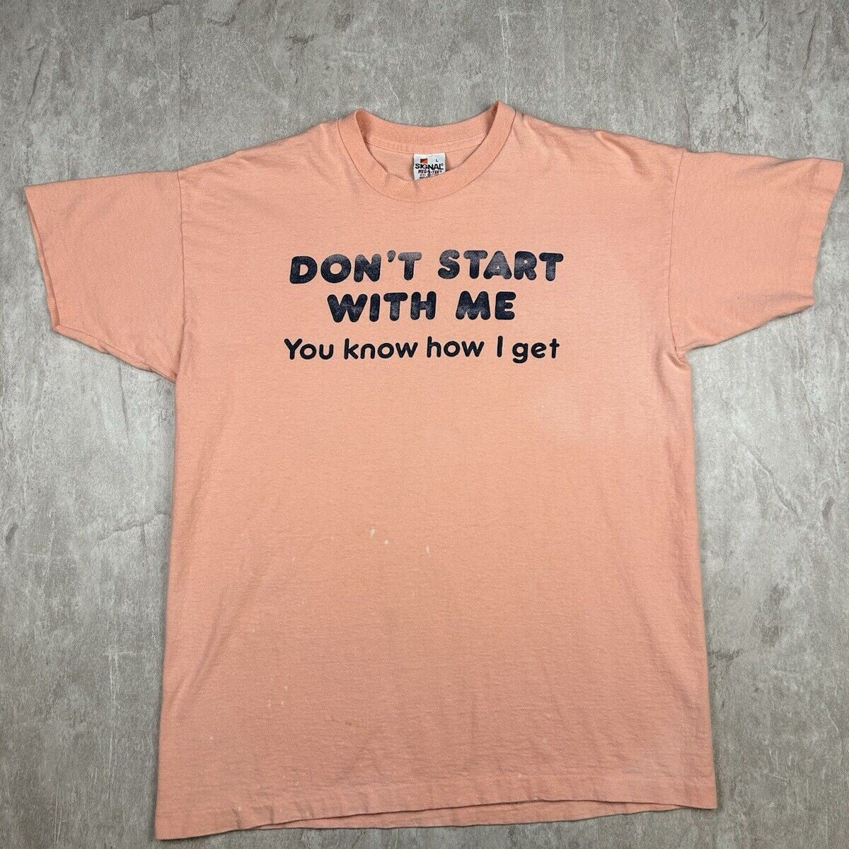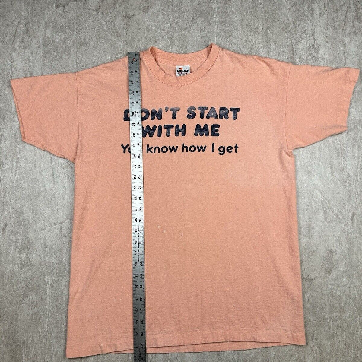 This vintage 90s "Don't Start With Me" pink T-shirt features a humorous graphic and is sized for men in L. It's a fun and quirky piece that adds a touch of humor to any wardrobe.