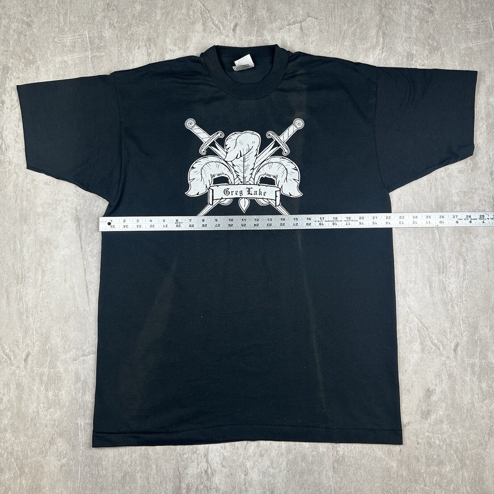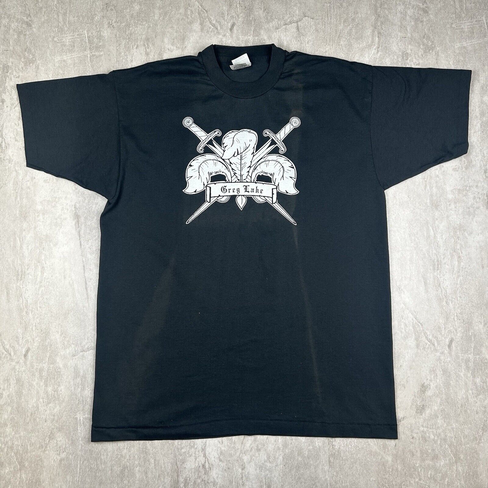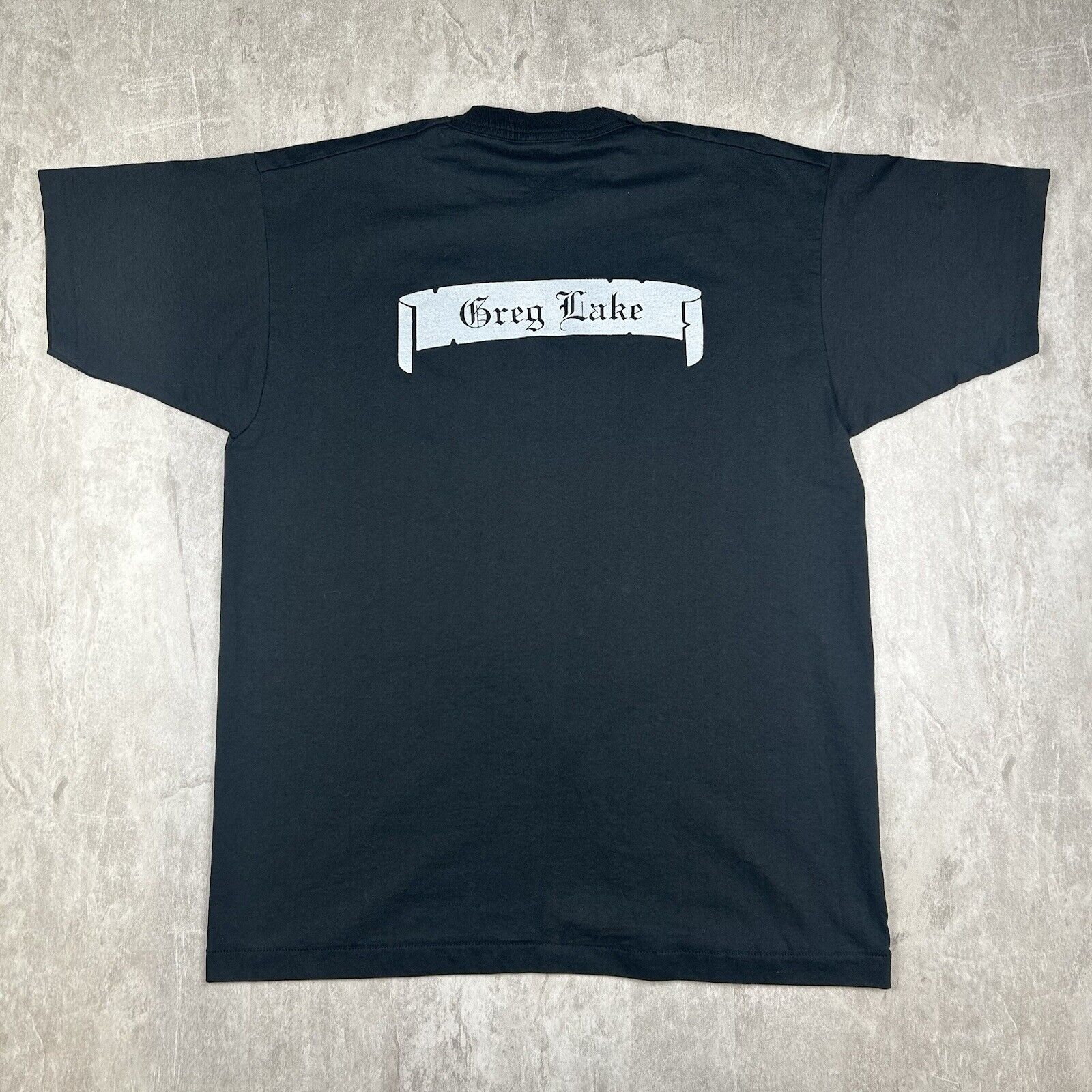 This vintage 90s Greg Lake T-shirt in Men's Size XL is a rare double-sided piece, celebrating the legacy of the iconic musician. With bold graphics on a classic black backdrop, this tee is perfect for fans and collectors of rock history.