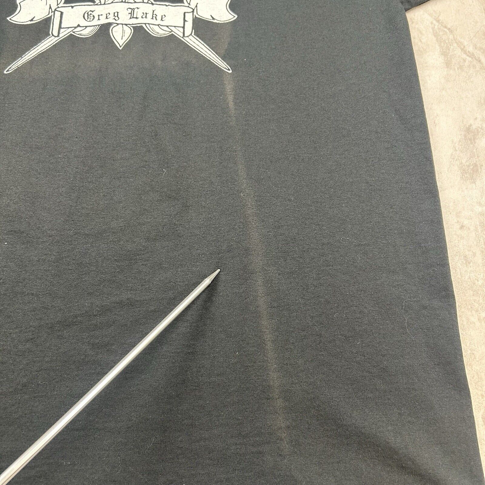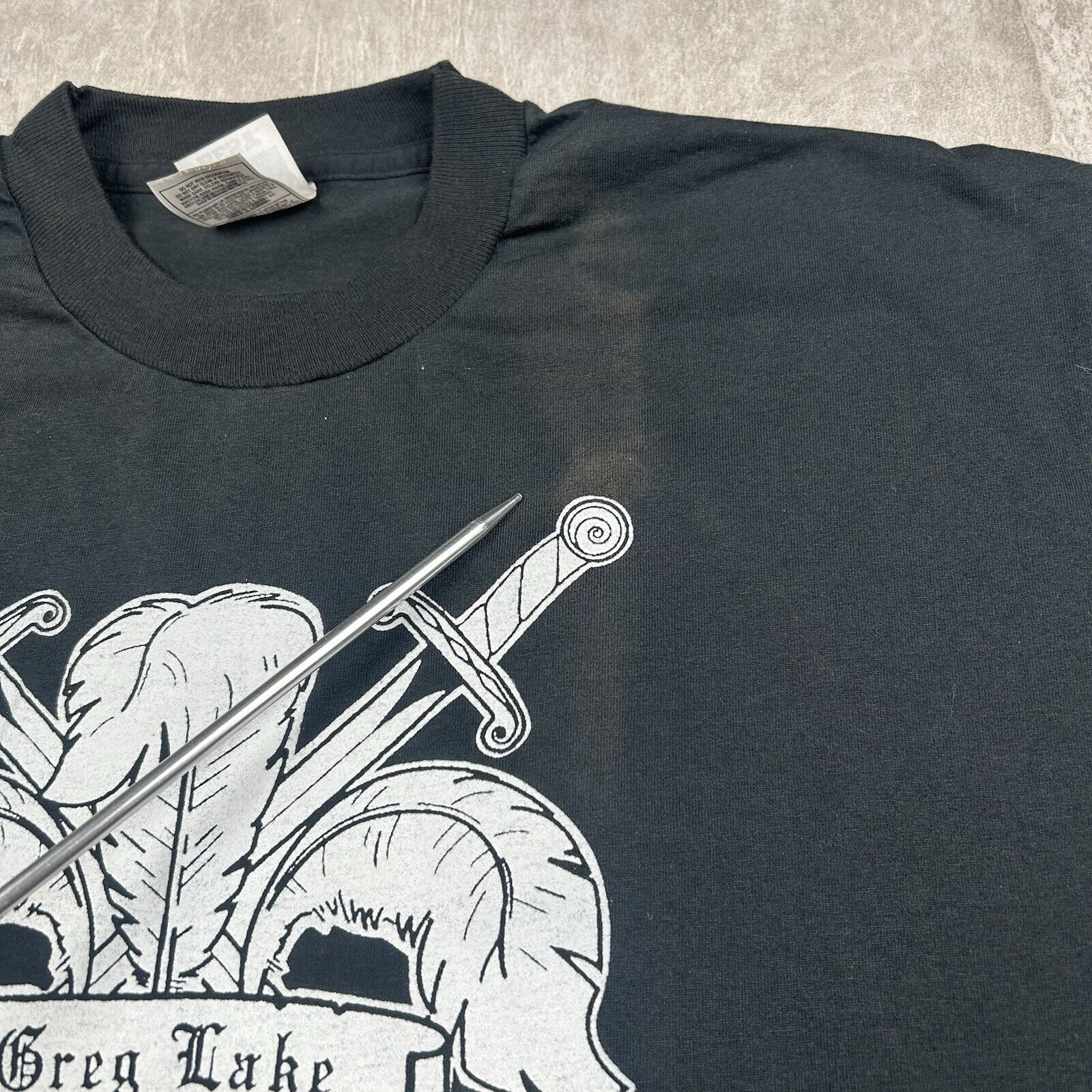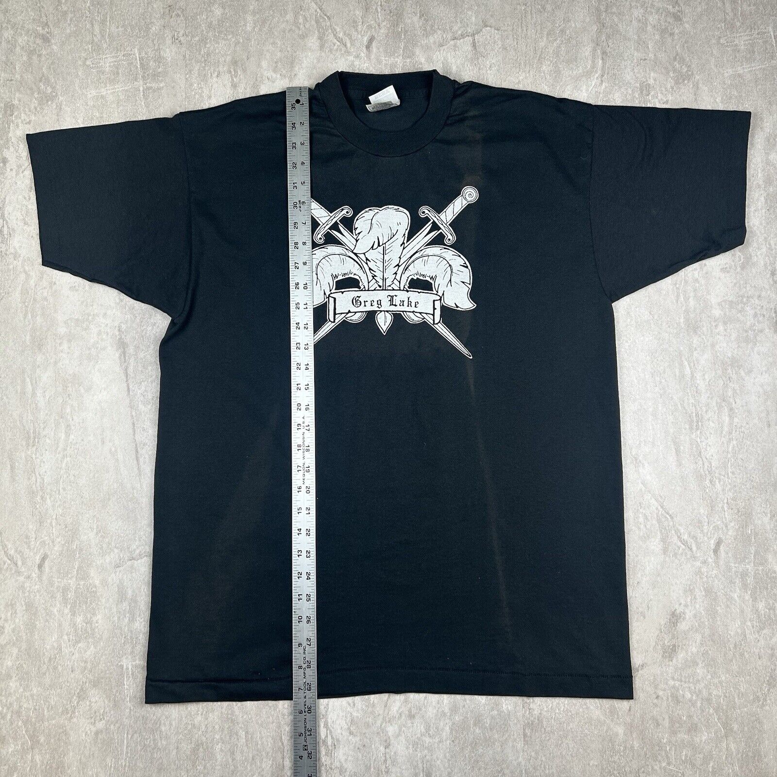 This vintage 90s Greg Lake T-shirt in Men's Size XL is a rare double-sided piece, celebrating the legacy of the iconic musician. With bold graphics on a classic black backdrop, this tee is perfect for fans and collectors of rock history.