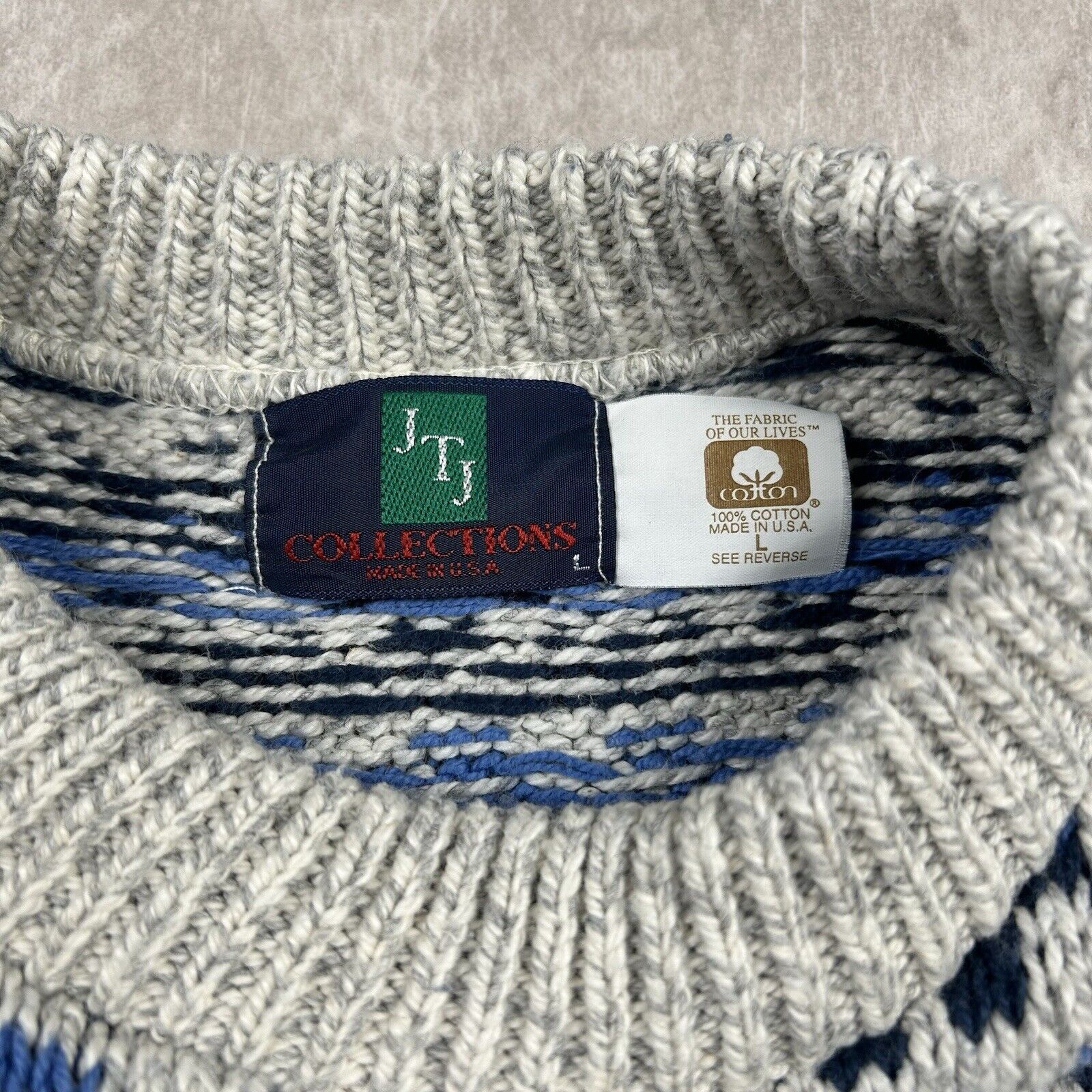 Embrace classic 90s style with this Vintage JTJ Collections Grey Pattern Sweater. Made in the USA, this men's size L crewneck features a distinctive grey pattern that adds a retro touch to your wardrobe. Perfect for layering, it combines vintage charm with cozy comfort.