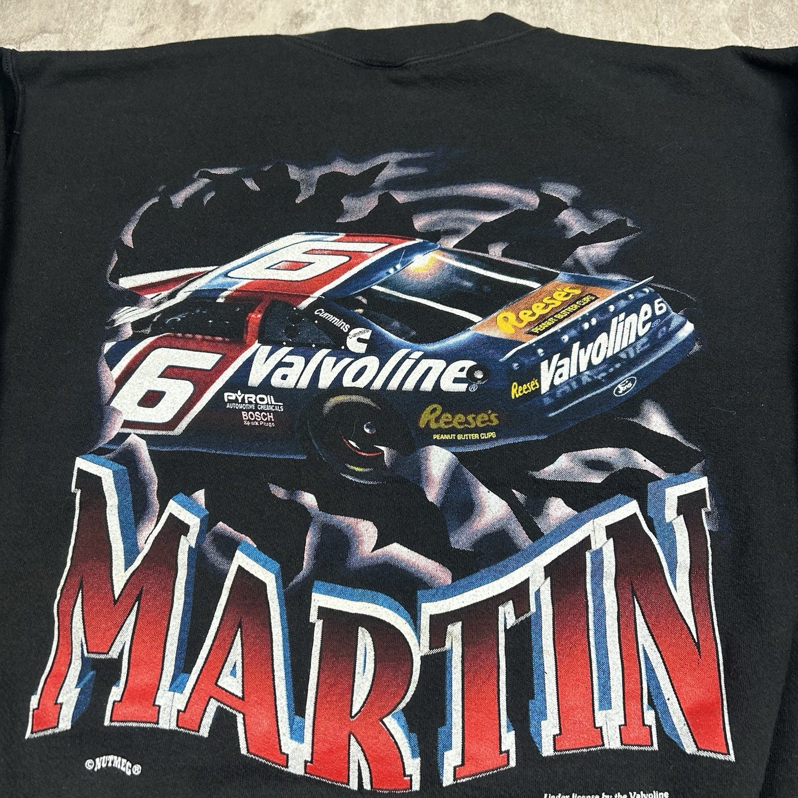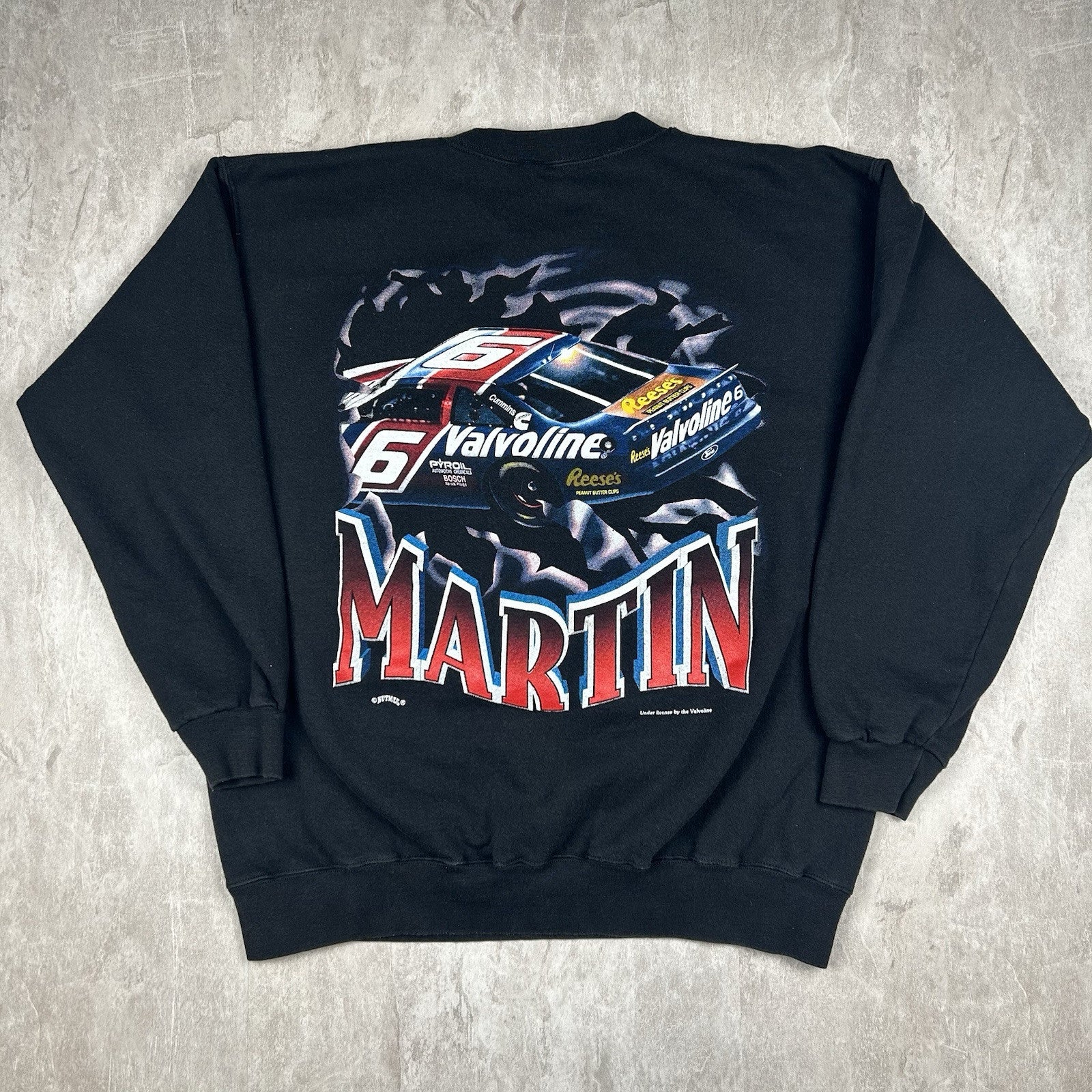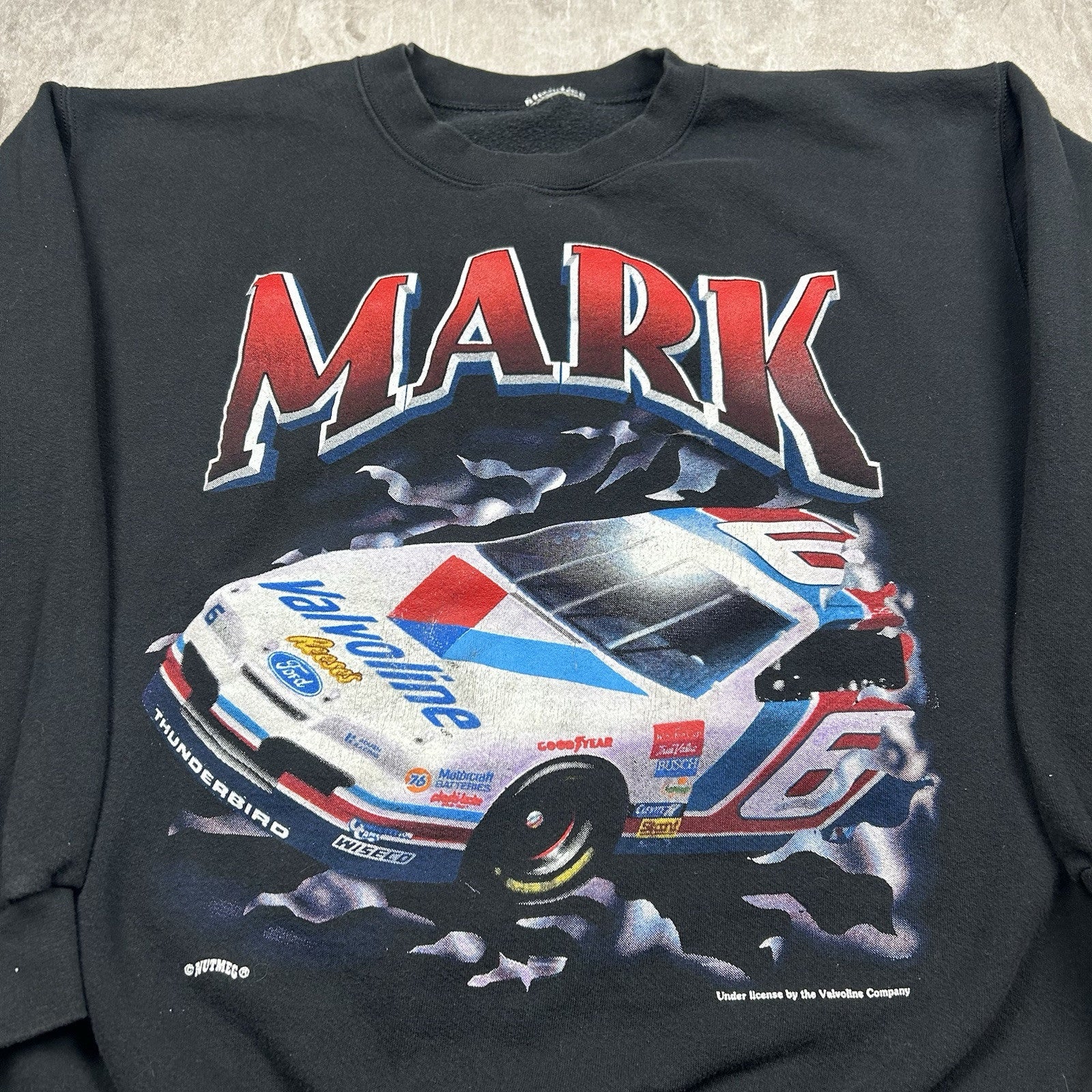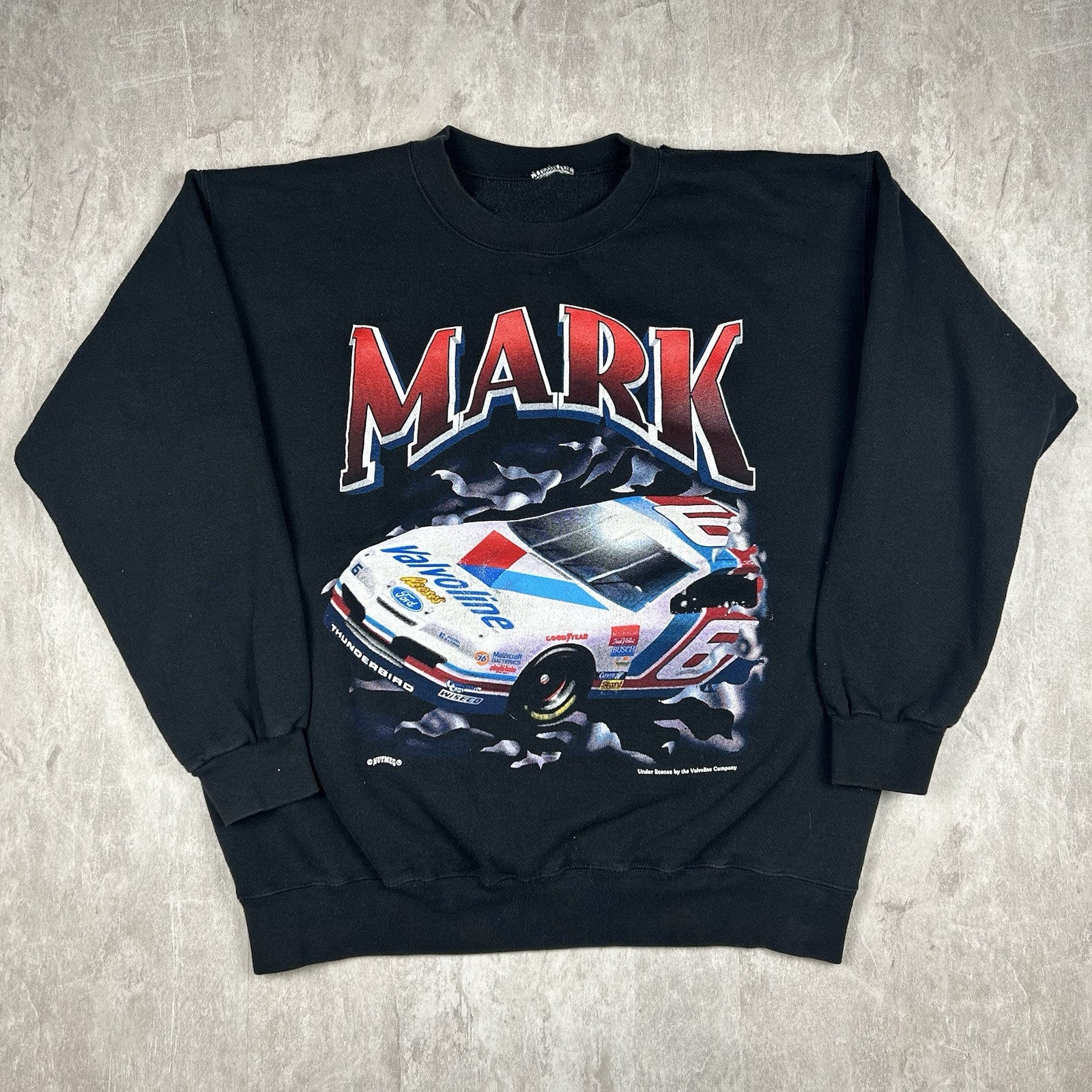 This vintage 90s Mark Martin crewneck sweatshirt by Nutmeg comes in black with classic racing graphics. A must-have for NASCAR fans and vintage collectors alike. Size is unknown.