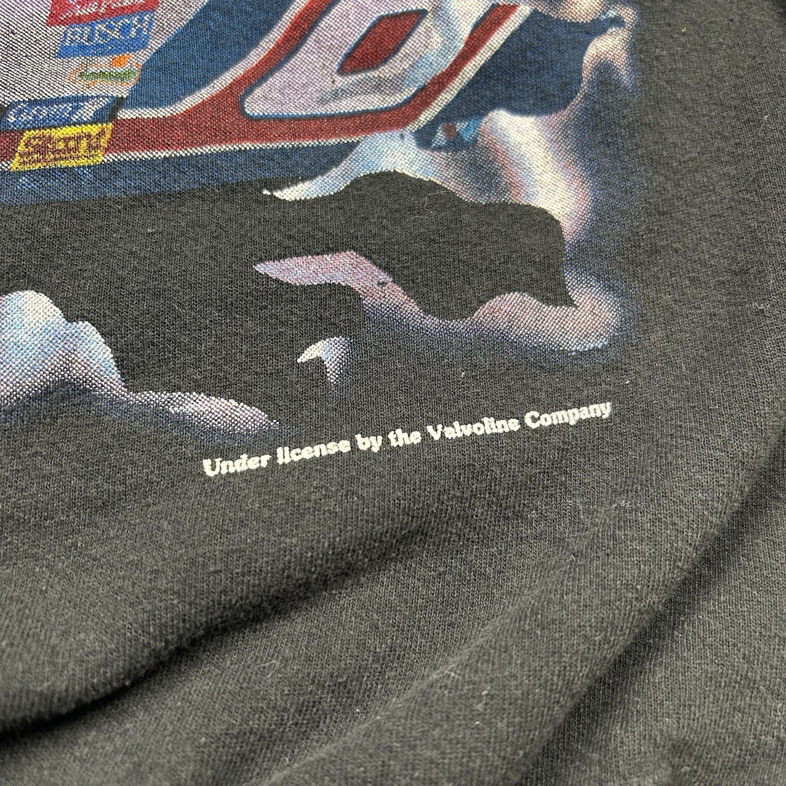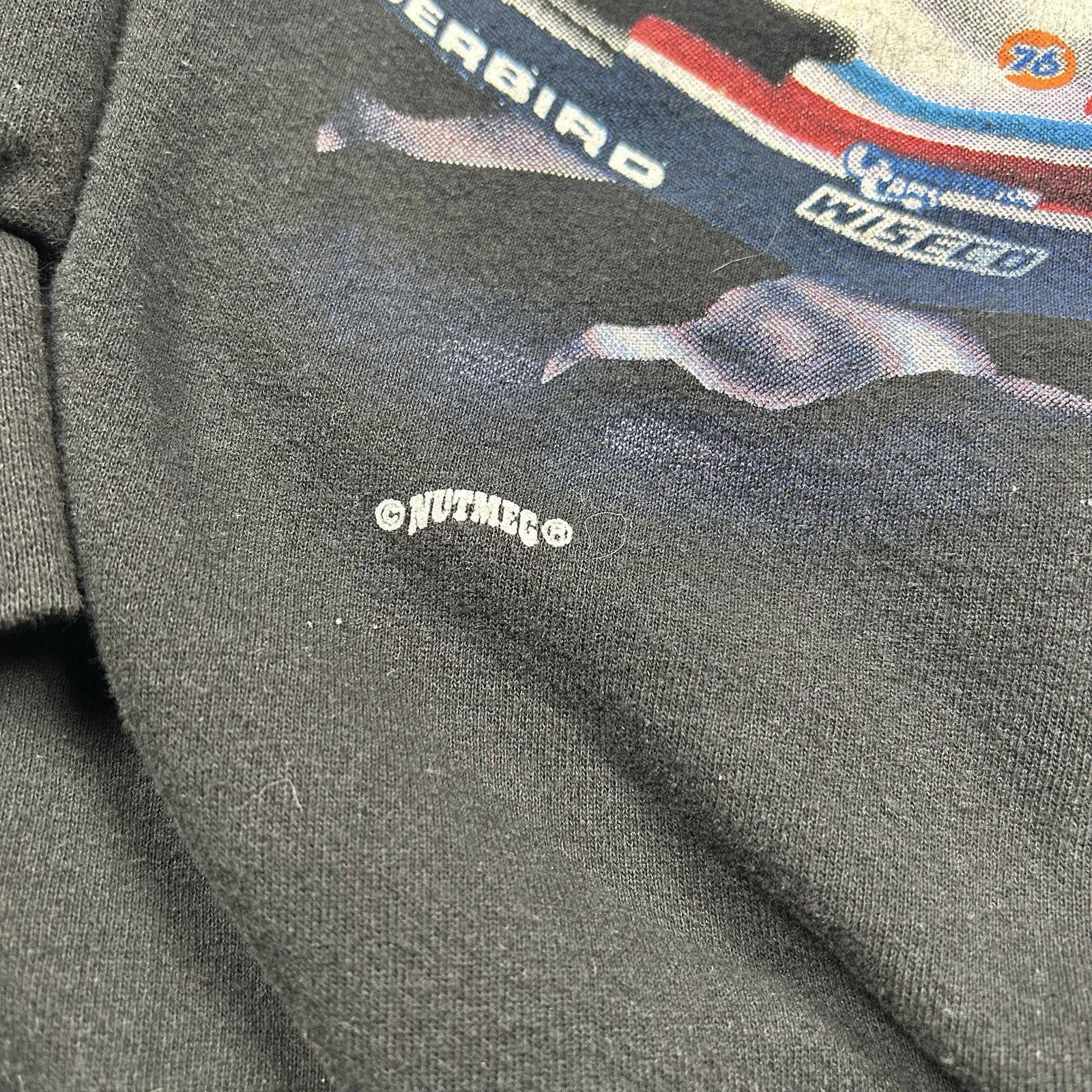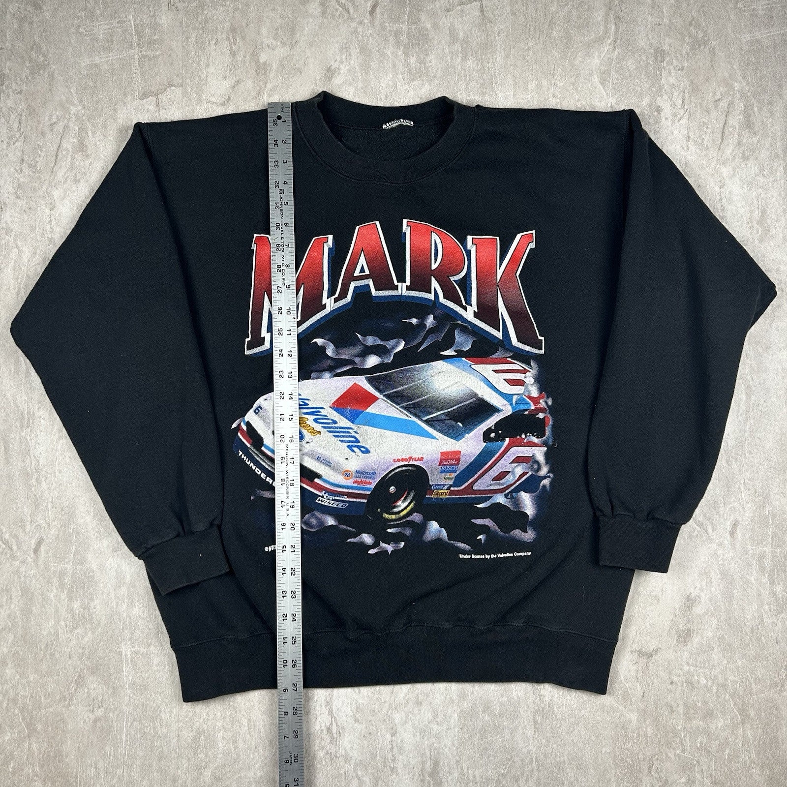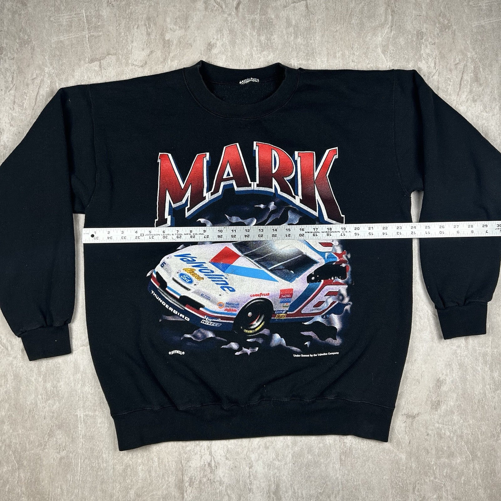 This vintage 90s Mark Martin crewneck sweatshirt by Nutmeg comes in black with classic racing graphics. A must-have for NASCAR fans and vintage collectors alike. Size is unknown.