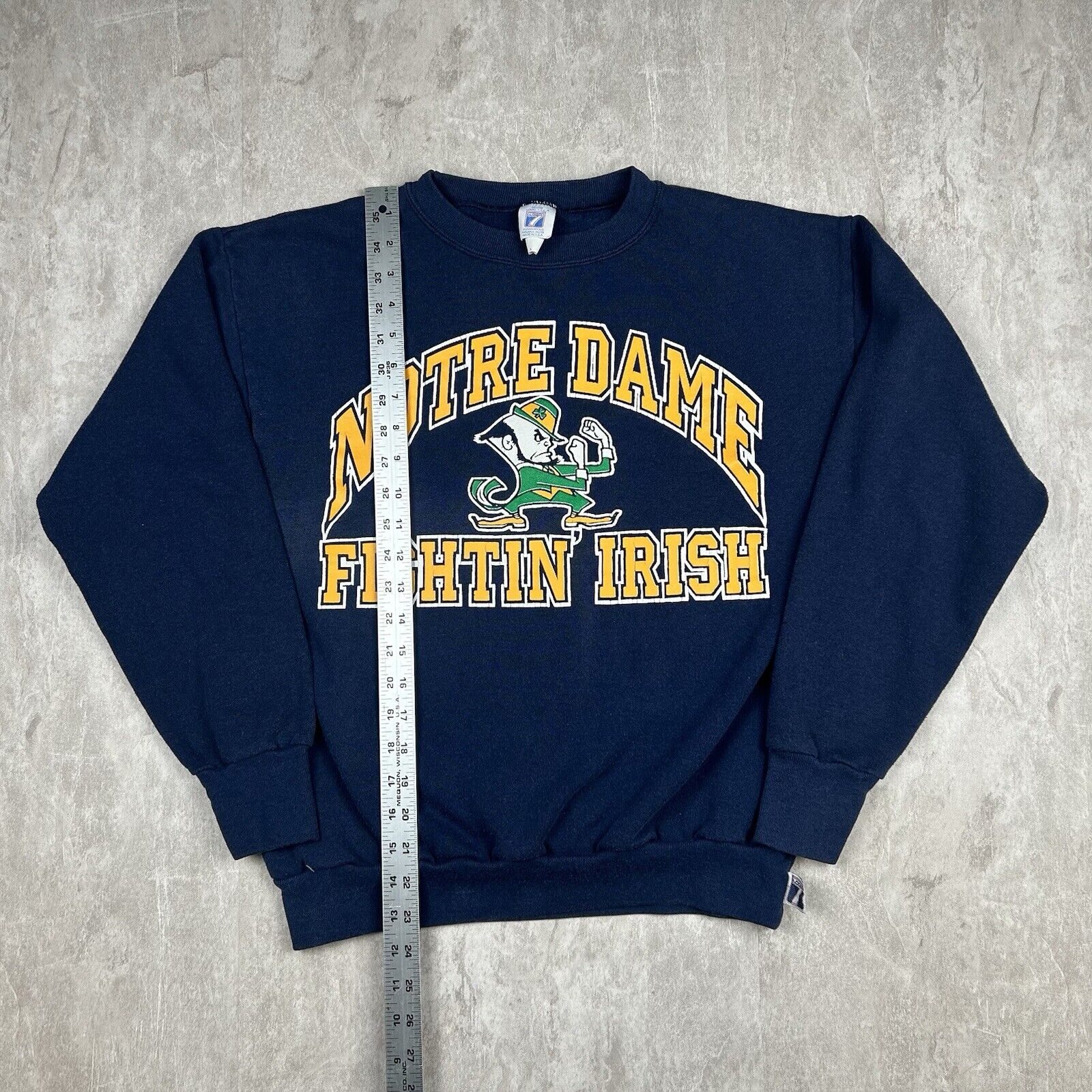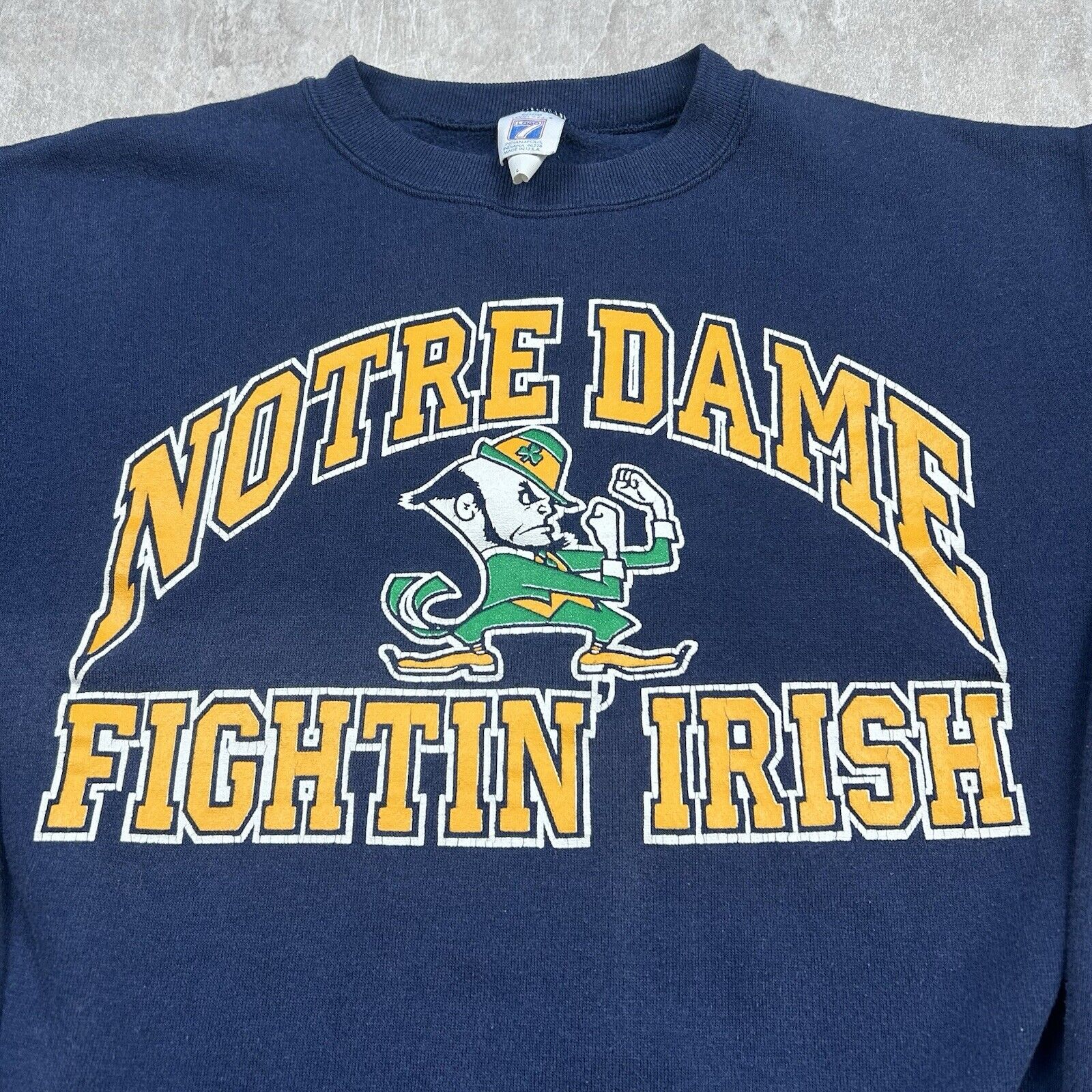 This vintage 90s Notre Dame Fighting Irish crewneck sweatshirt is a must-have for fans of the legendary college team. Made by Logo 7, it offers a classic fit in Men's Size L, perfect for showing school spirit with a nostalgic touch.