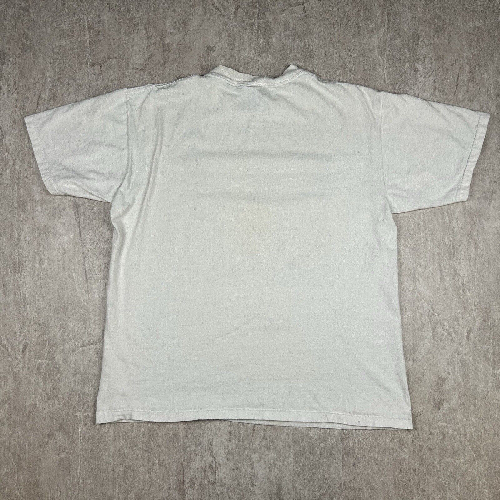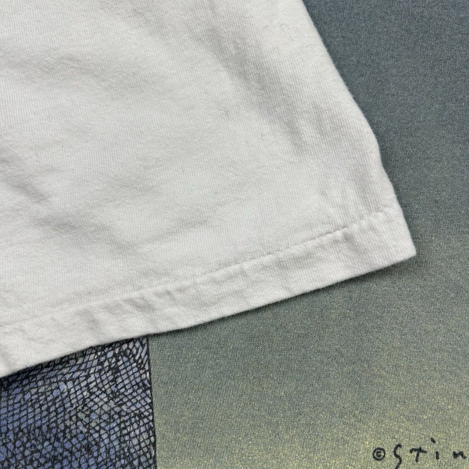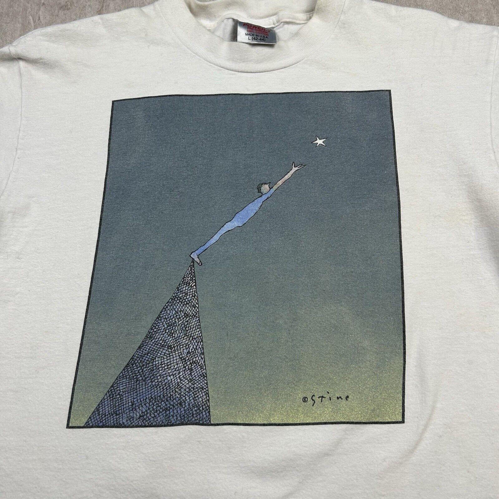 Add some artistic flair to your wardrobe with this Vintage 90s Richard Stine Art T-Shirt featuring the 'Reaching Star' design. In men's size L, this single stitch tee showcases Stine's unique and whimsical artwork, making it a must-have for art enthusiasts and lovers of vintage fashion.