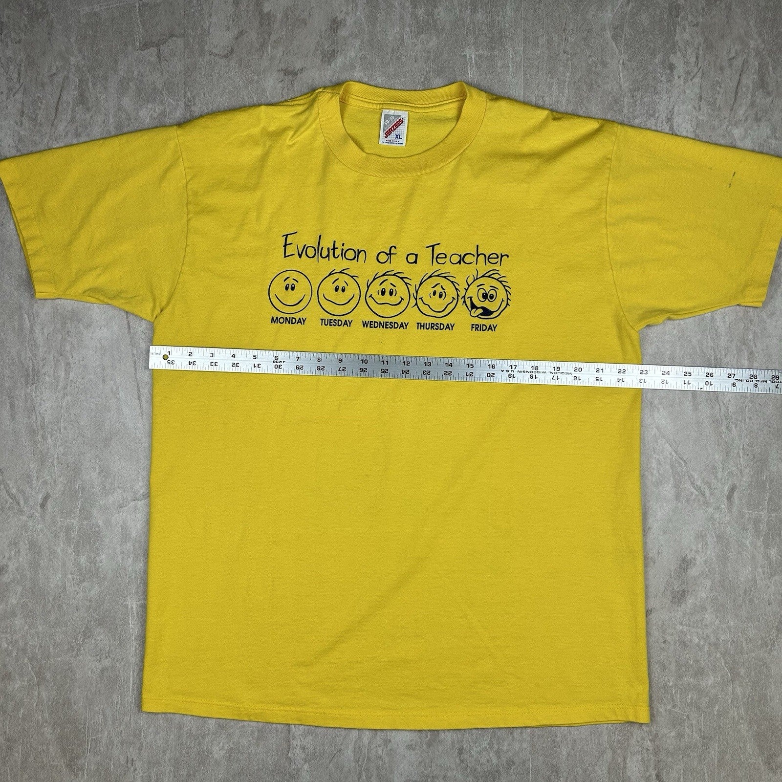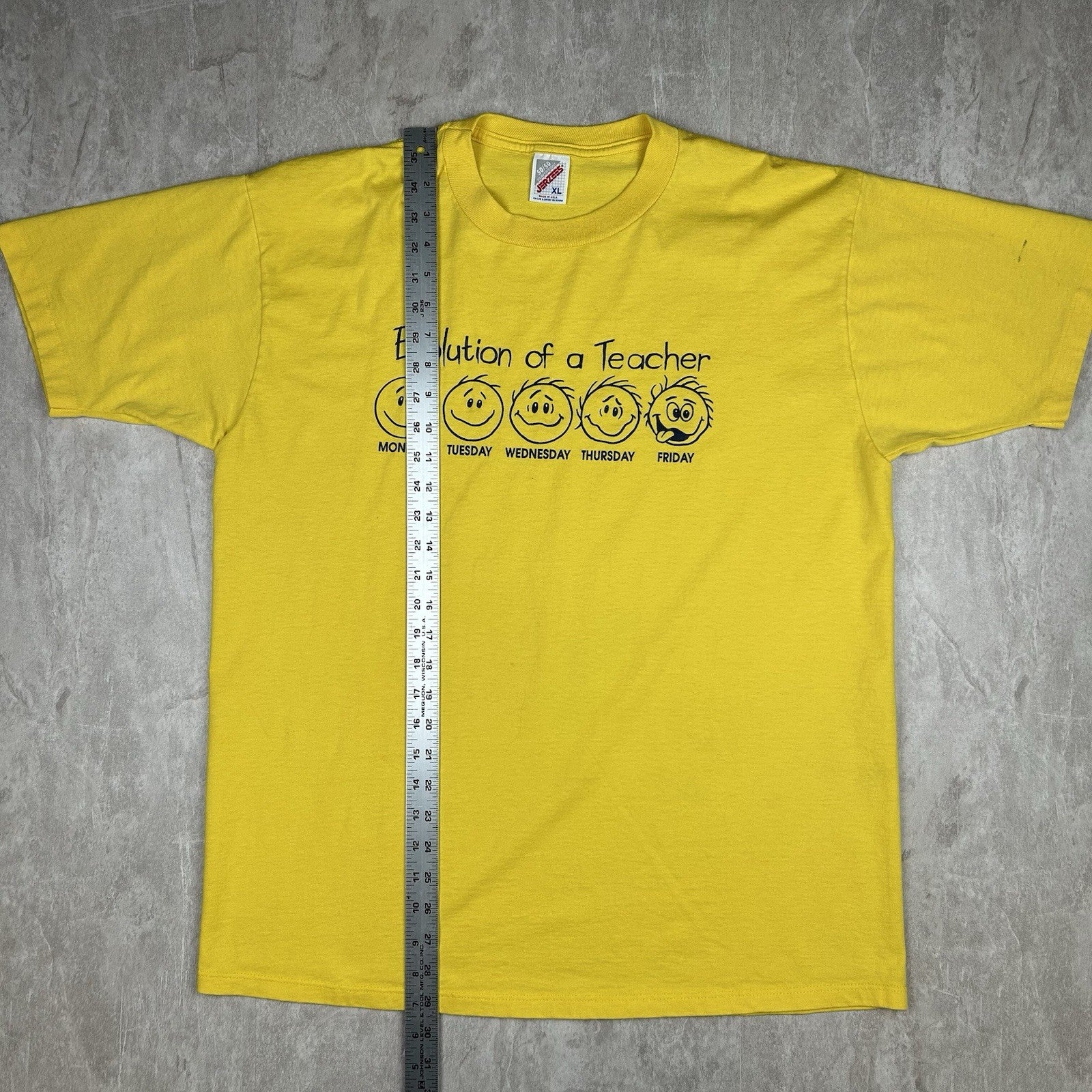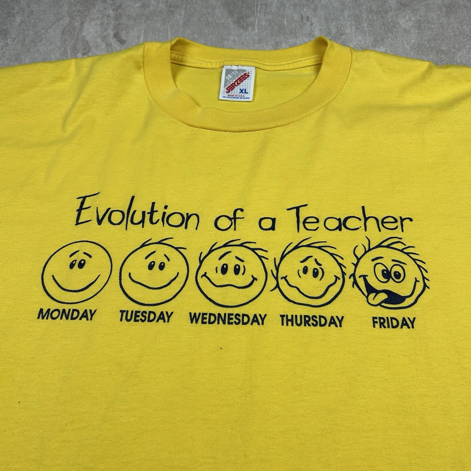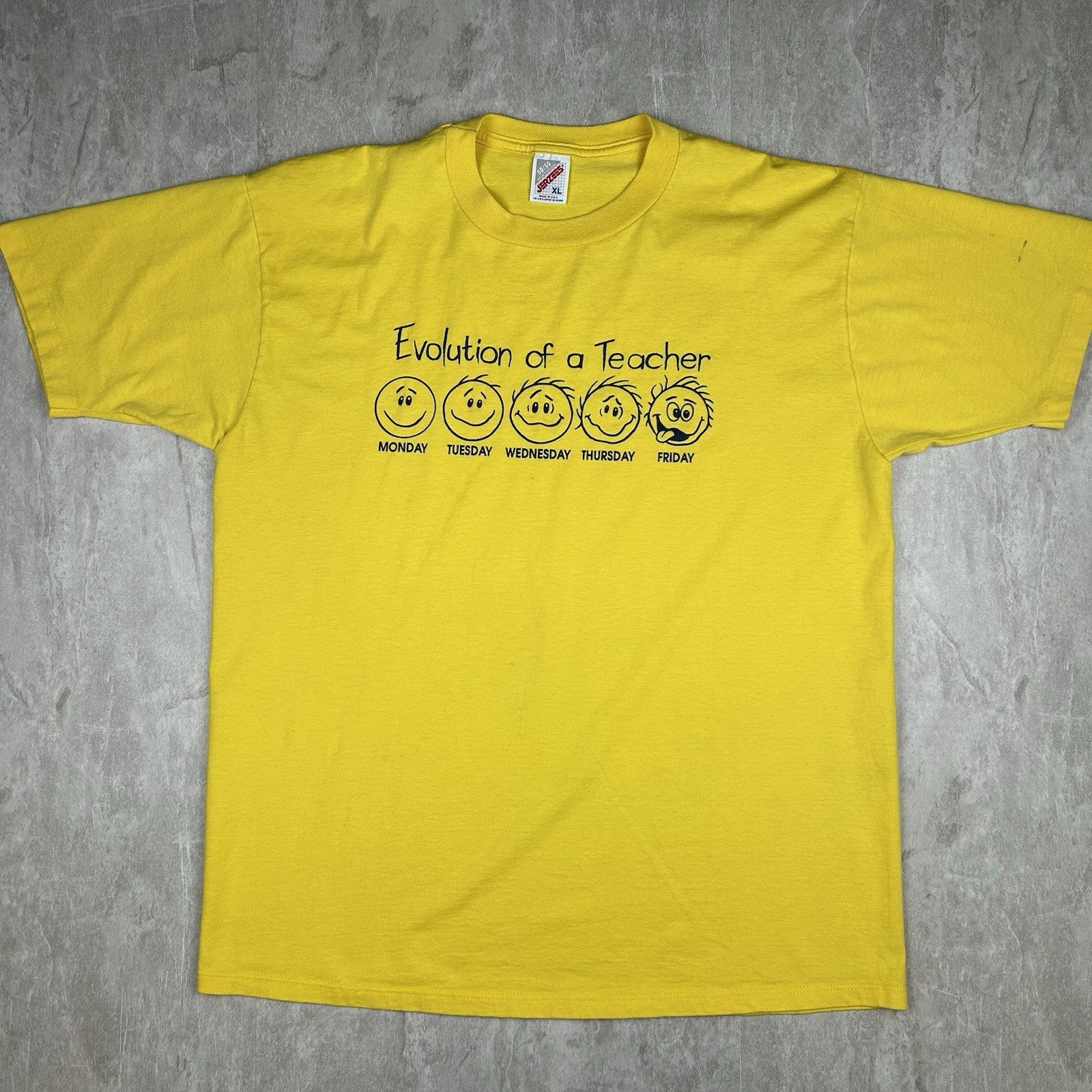 Celebrate educators everywhere with this vintage 90s "The Evolution of a Teacher" yellow T-shirt. Fun graphic, USA made, and full of retro charm. Men's size XL.