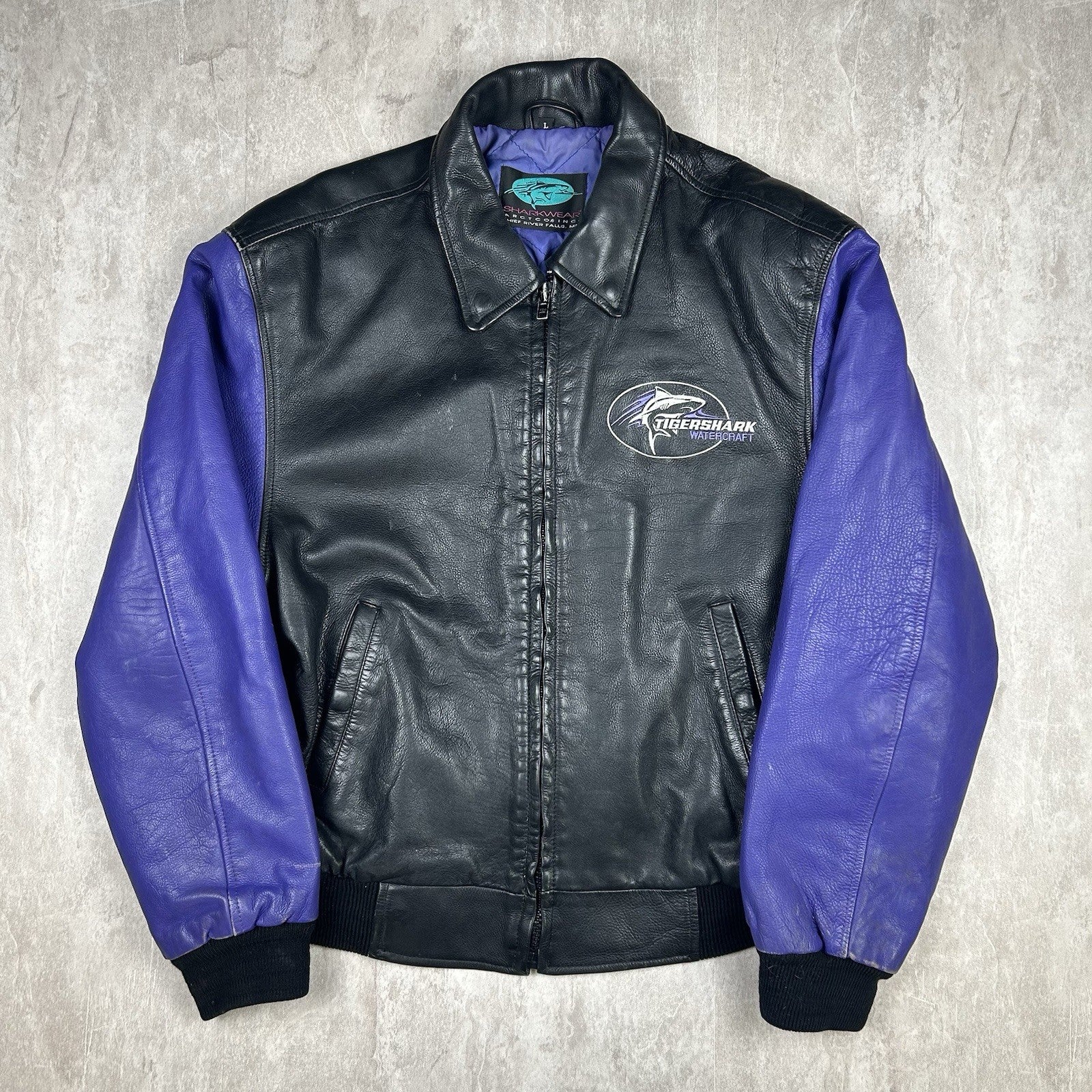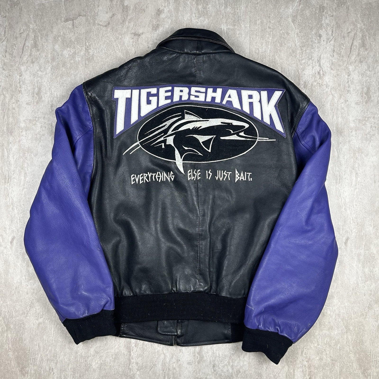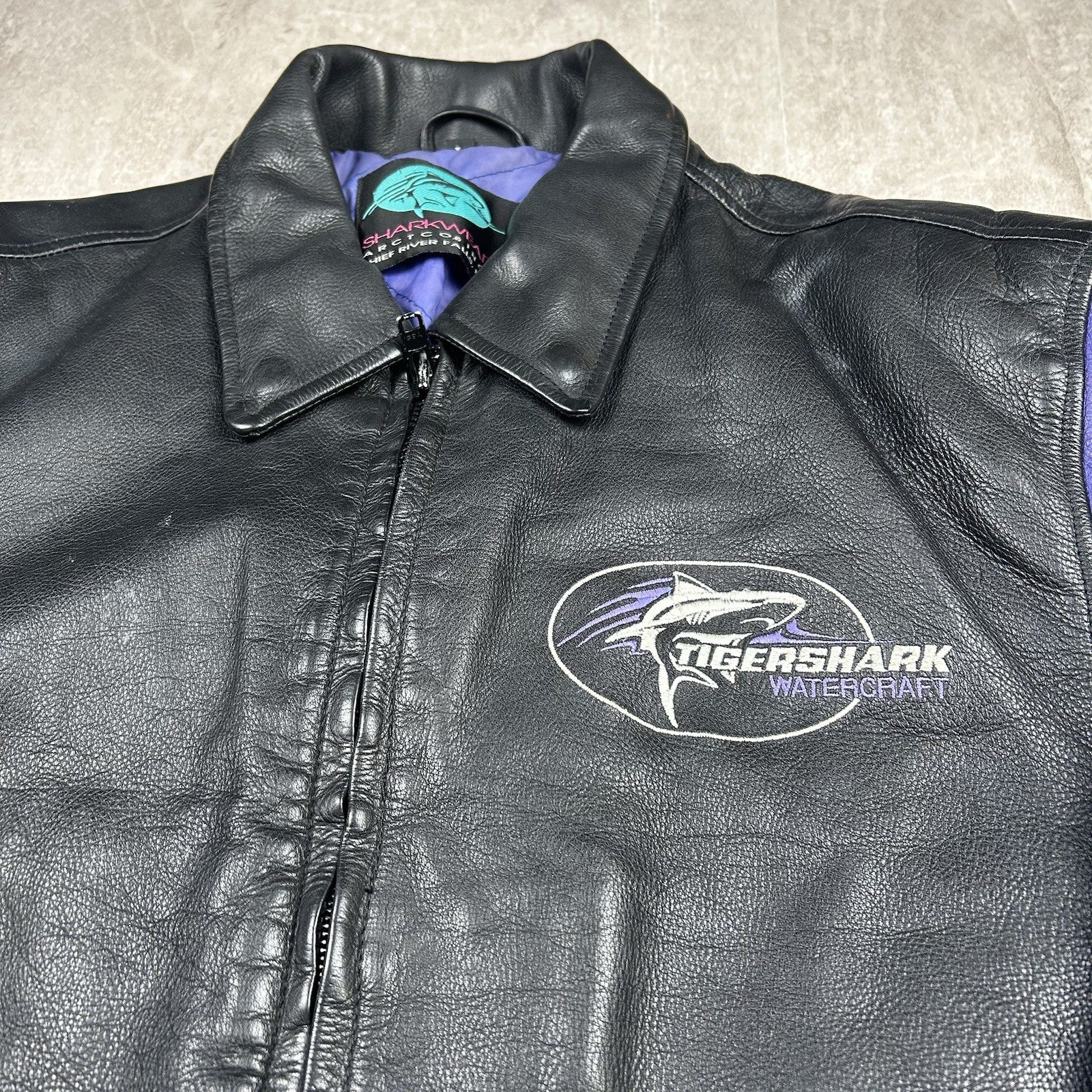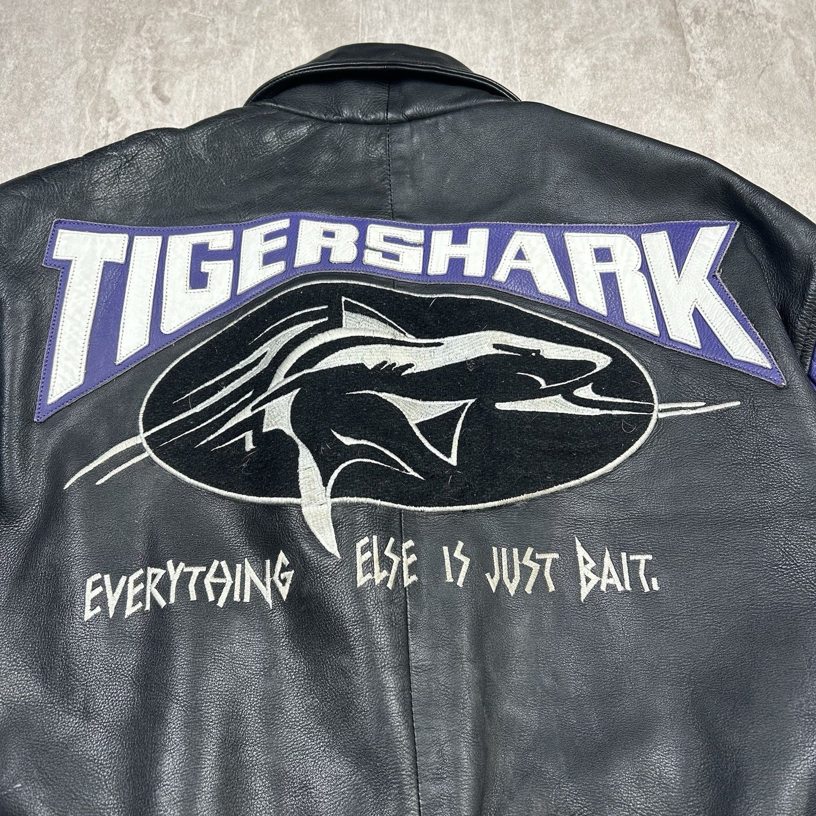 Vintage 90s Tiger Shark Watercraft leather bomber jacket featuring bold embroidered logos and classic racing vibes. Heavyweight build with ribbed cuffs and waistband. Men's size L.