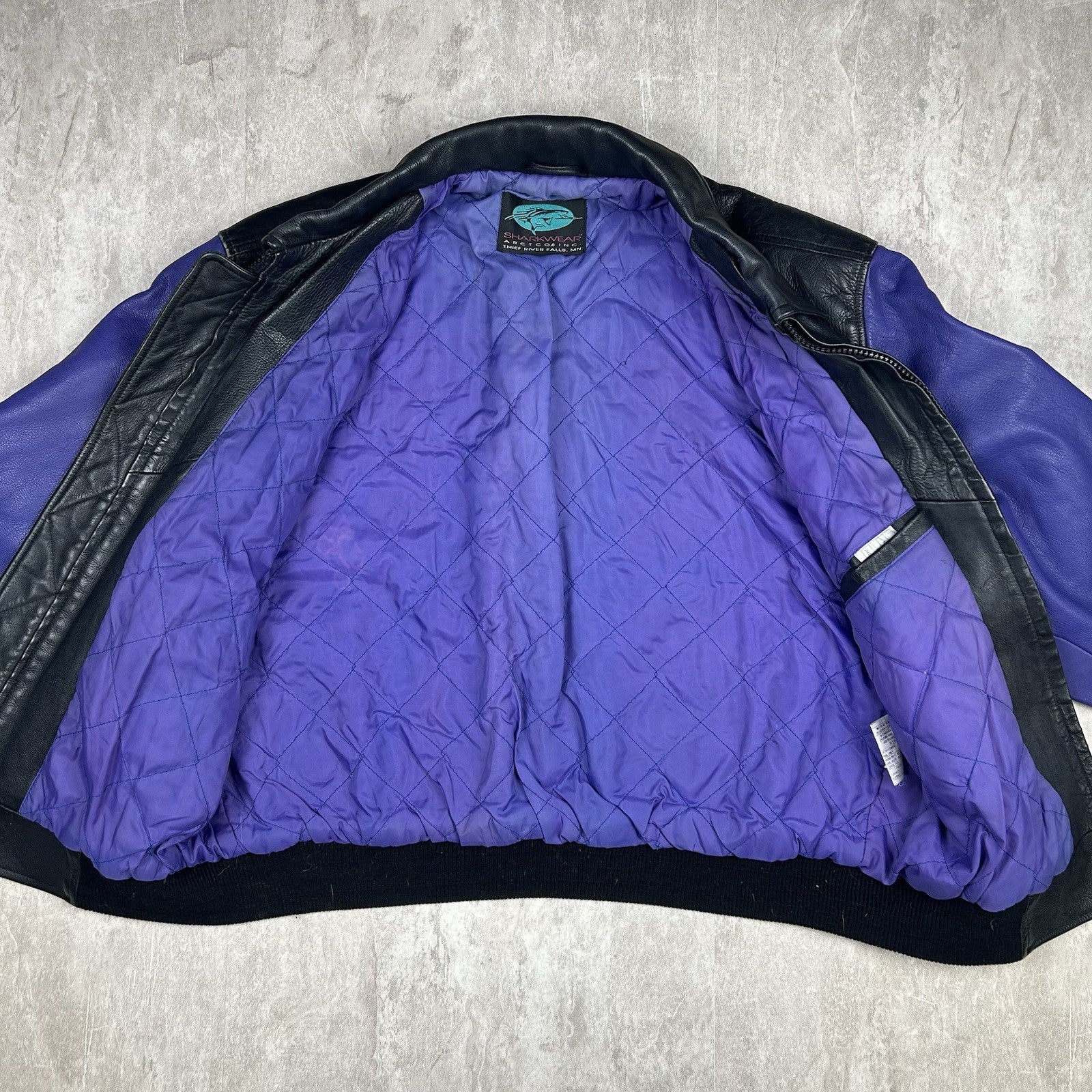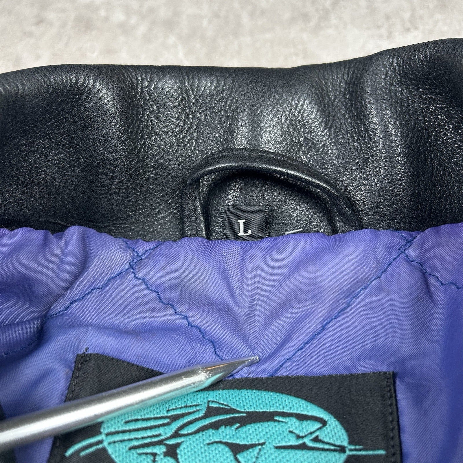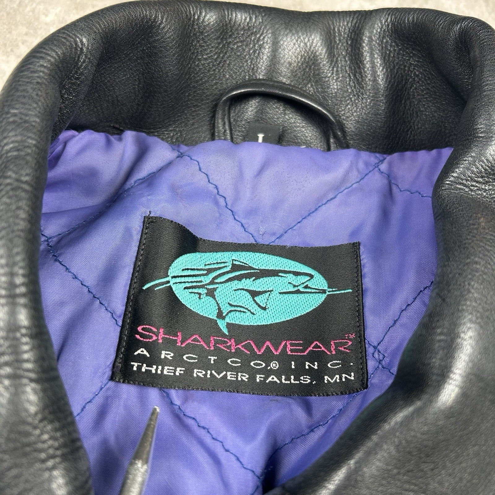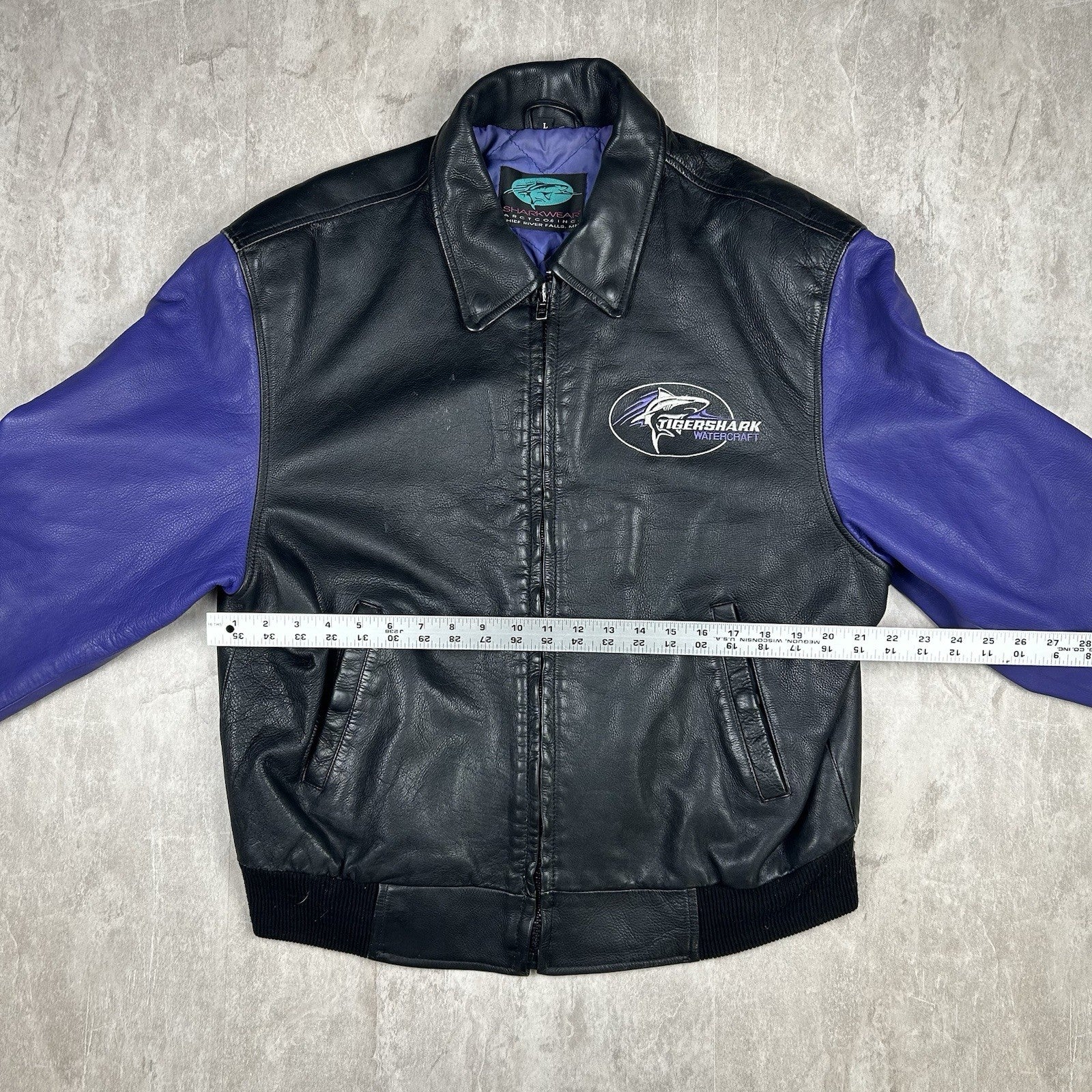 Vintage 90s Tiger Shark Watercraft leather bomber jacket featuring bold embroidered logos and classic racing vibes. Heavyweight build with ribbed cuffs and waistband. Men's size L.