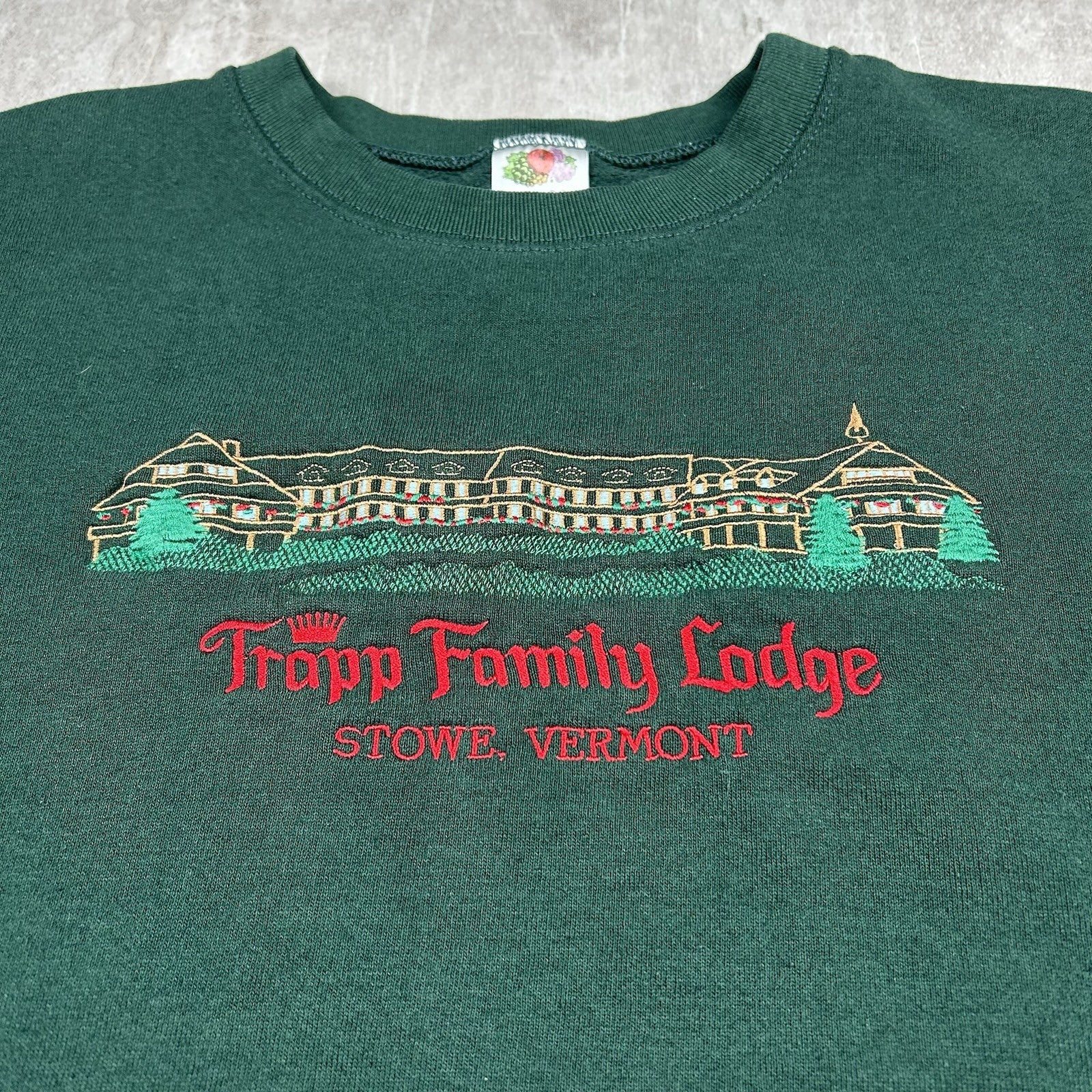 Classic 90s comfort meets alpine charm in this Trapp Family Lodge crewneck sweatshirt. Made in the USA and featuring a bold Stowe, Vermont graphic. Men's size 2XL.