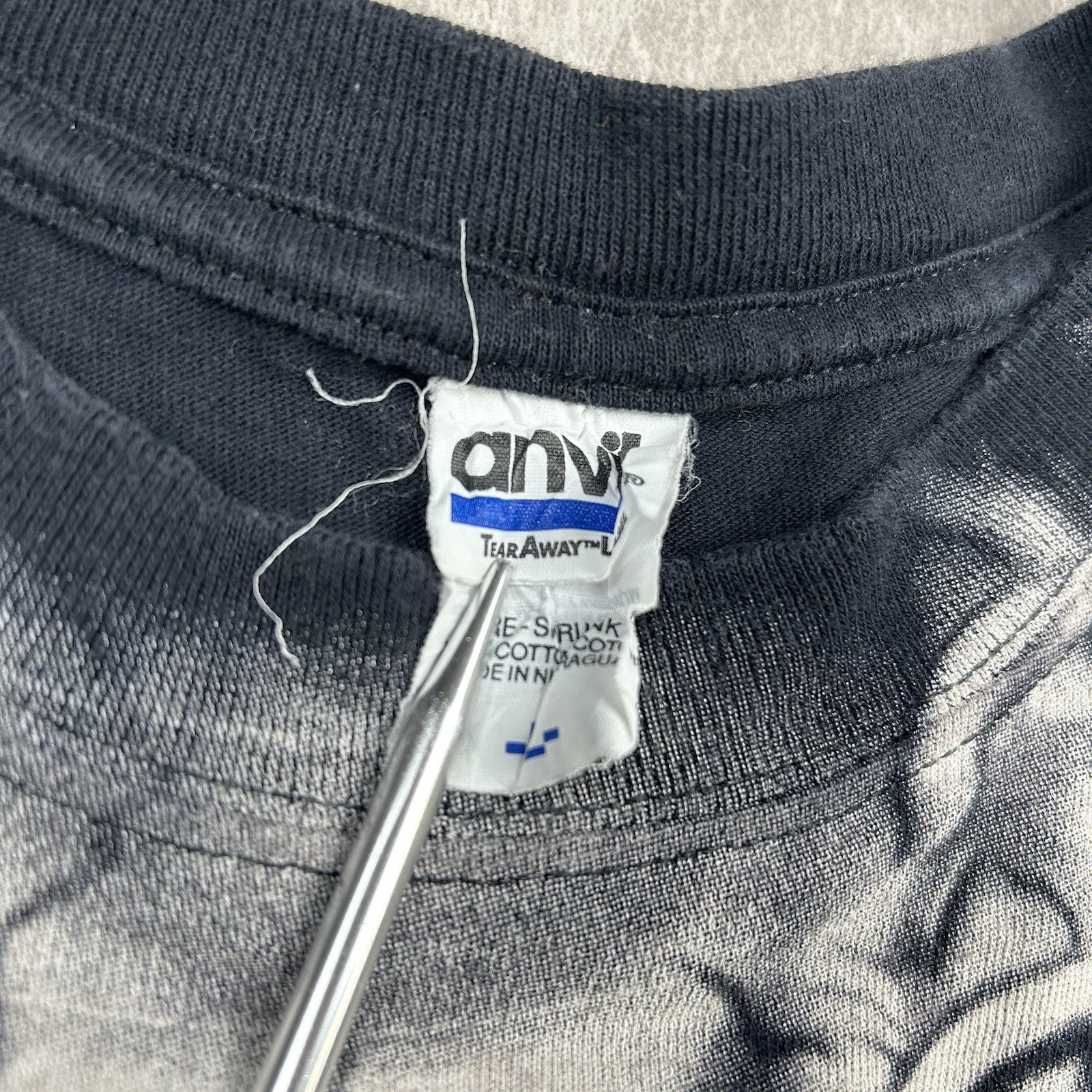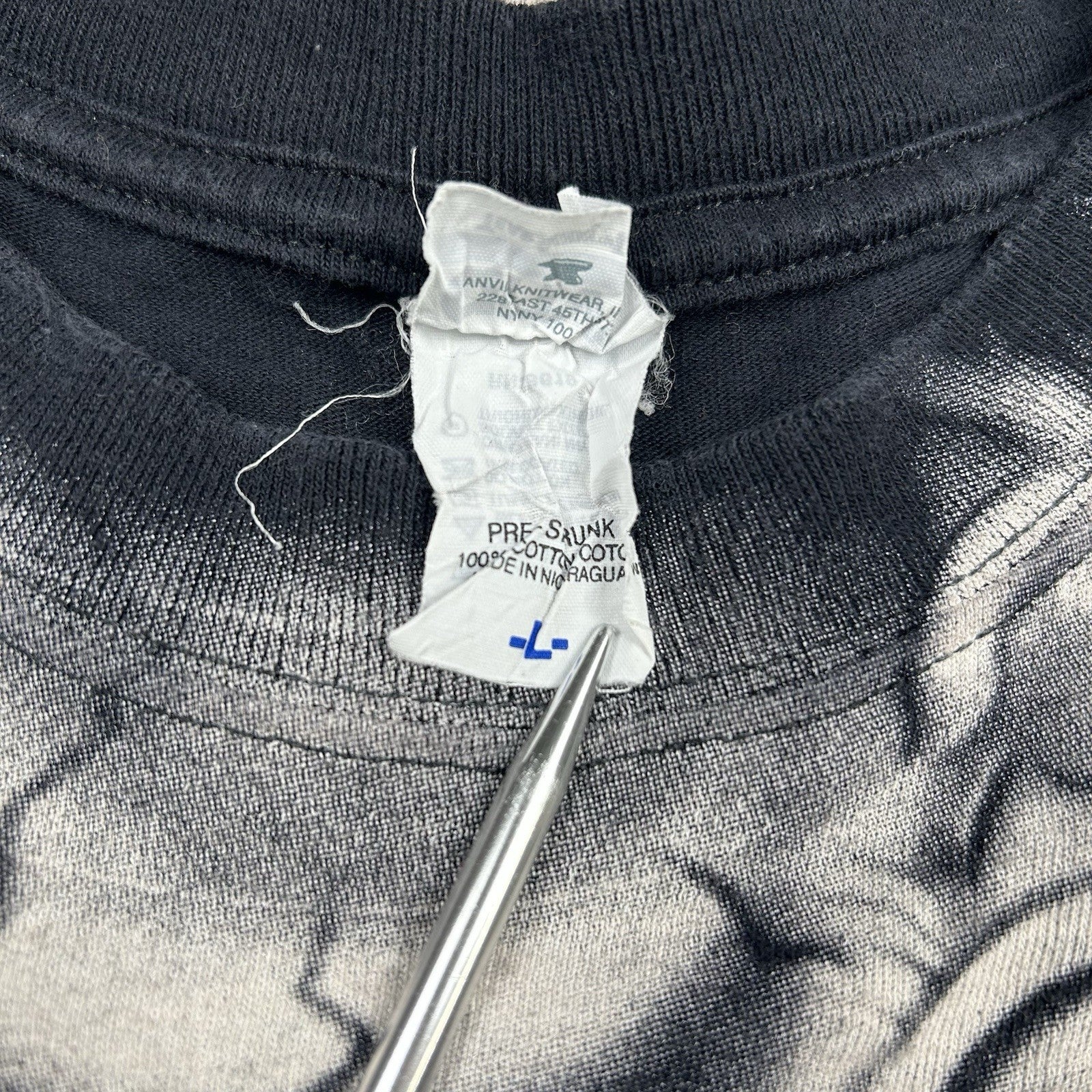 This vintage 90s/Y2K Liquid Blue-style T-shirt features an all-over psycho skull print, delivering bold, edgy energy perfect for fans of dark streetwear. Men's size L. A standout piece for any vintage or alt-style collection.