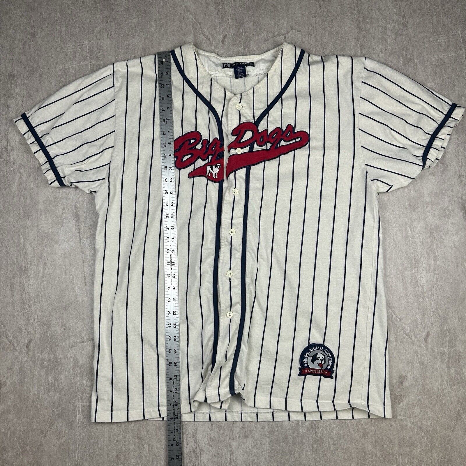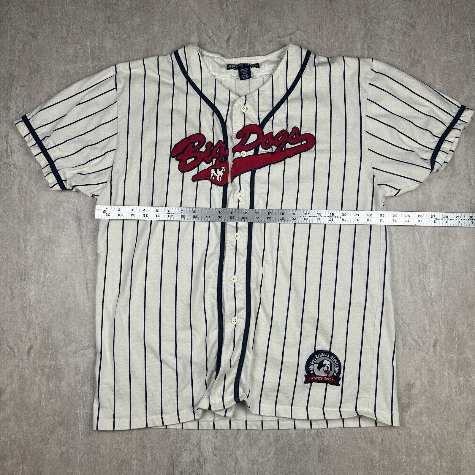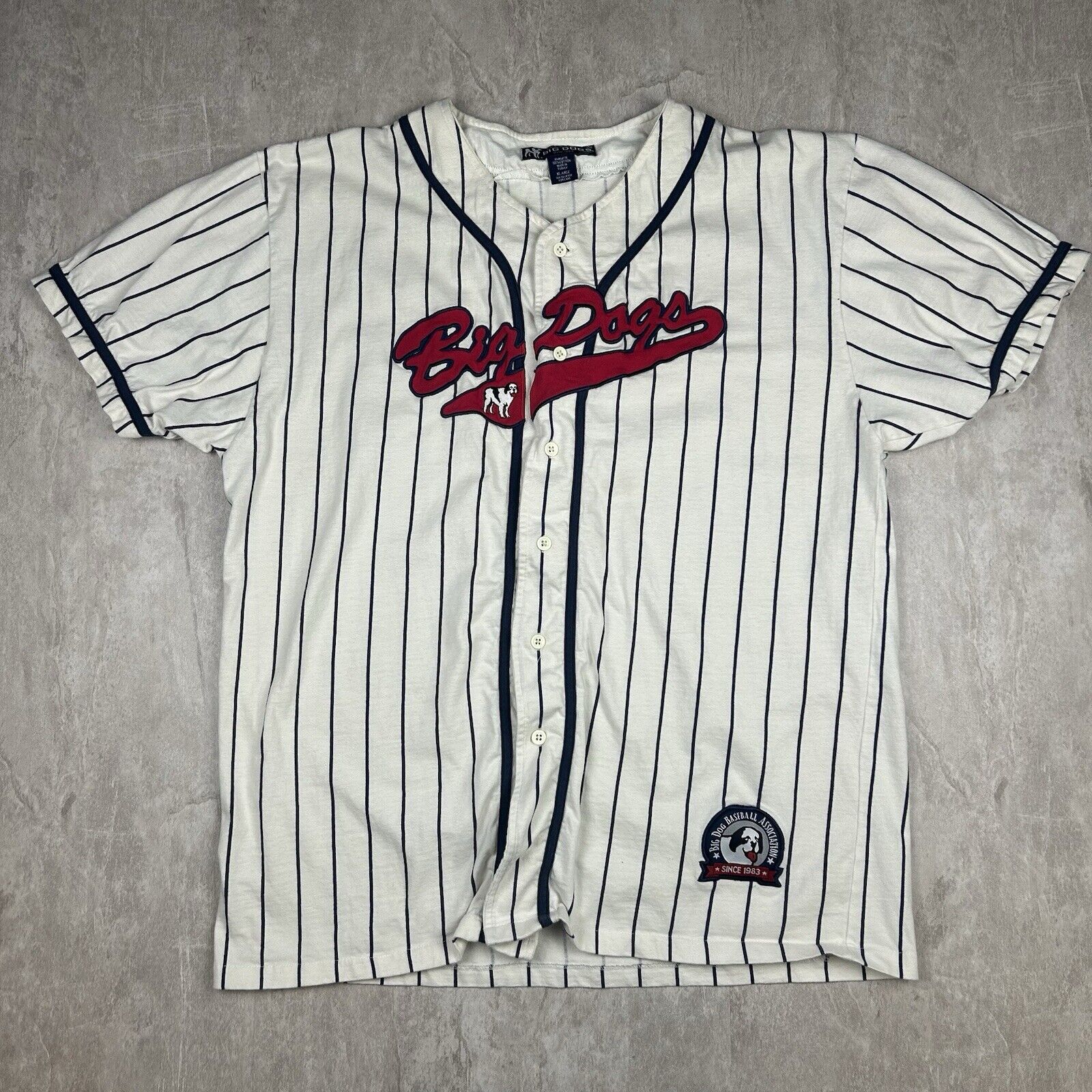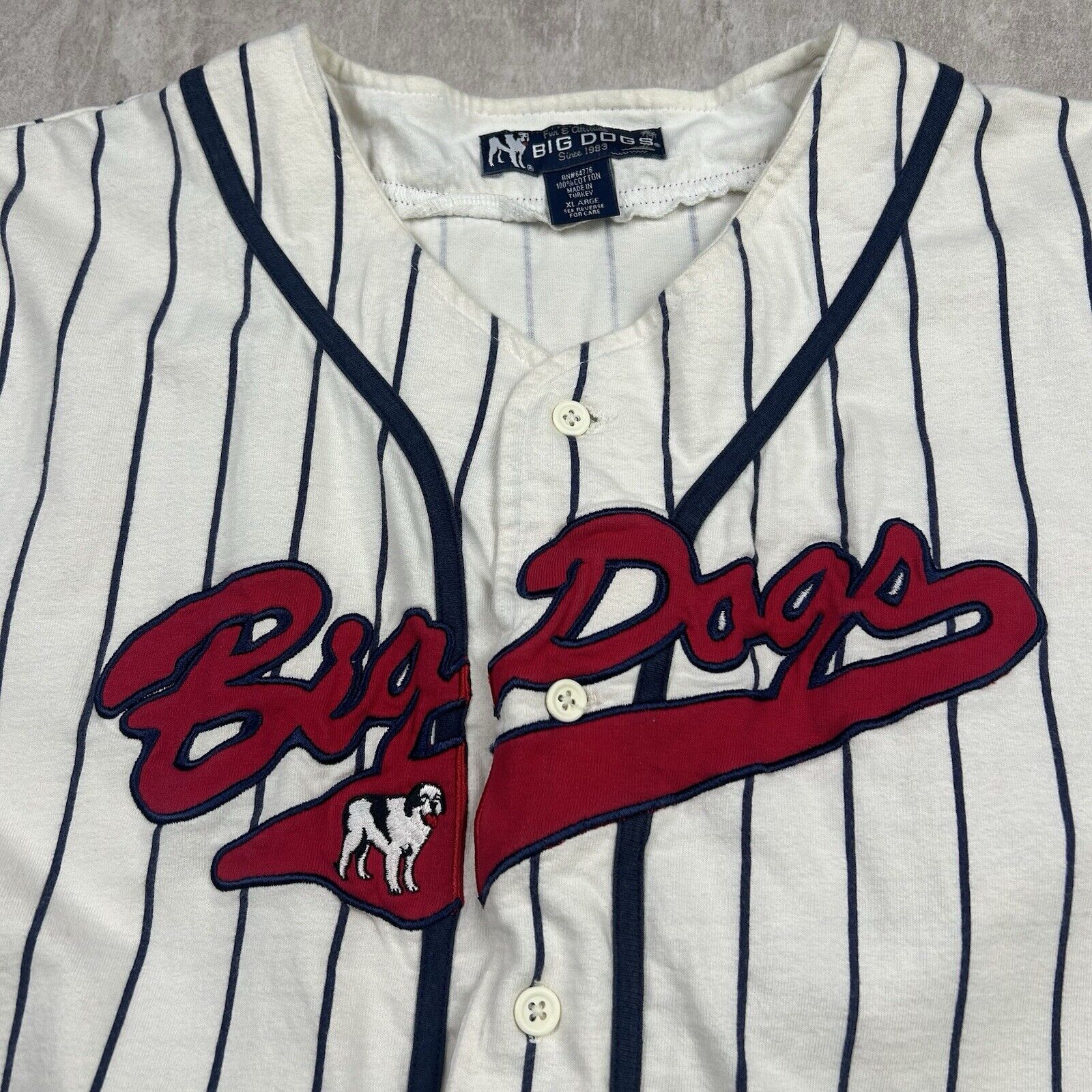 Step up your style with this vintage BIG DOGS baseball jersey shirt. Featuring a classic button-down design with bold pinstripes in crisp white, this men's size XL jersey captures the spirit of America's pastime. Perfect for casual outings or a sporty look, it combines nostalgia with comfort, making it a must-have for baseball fans and vintage lovers alike!