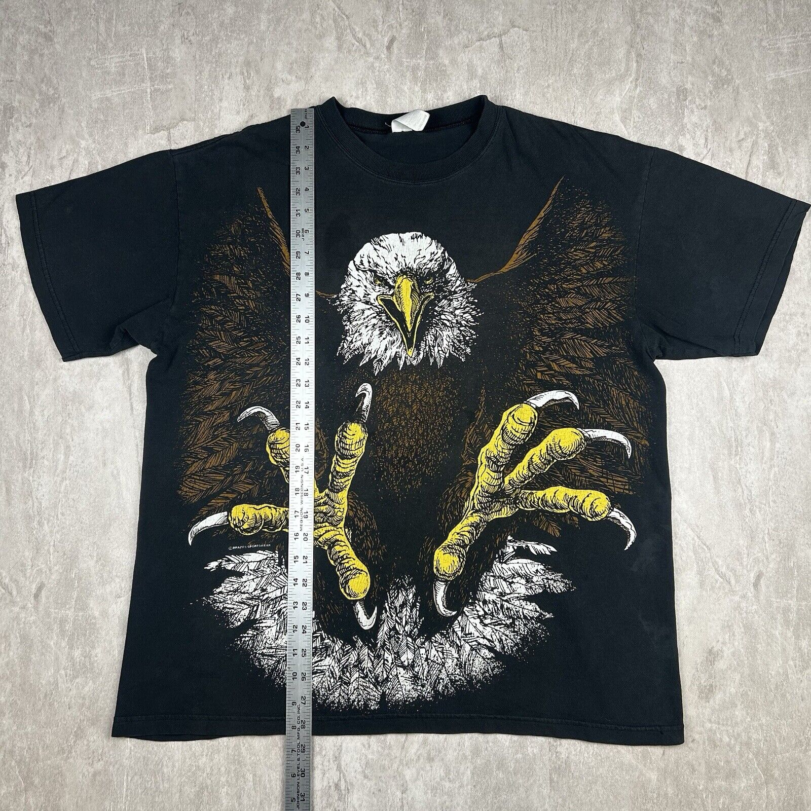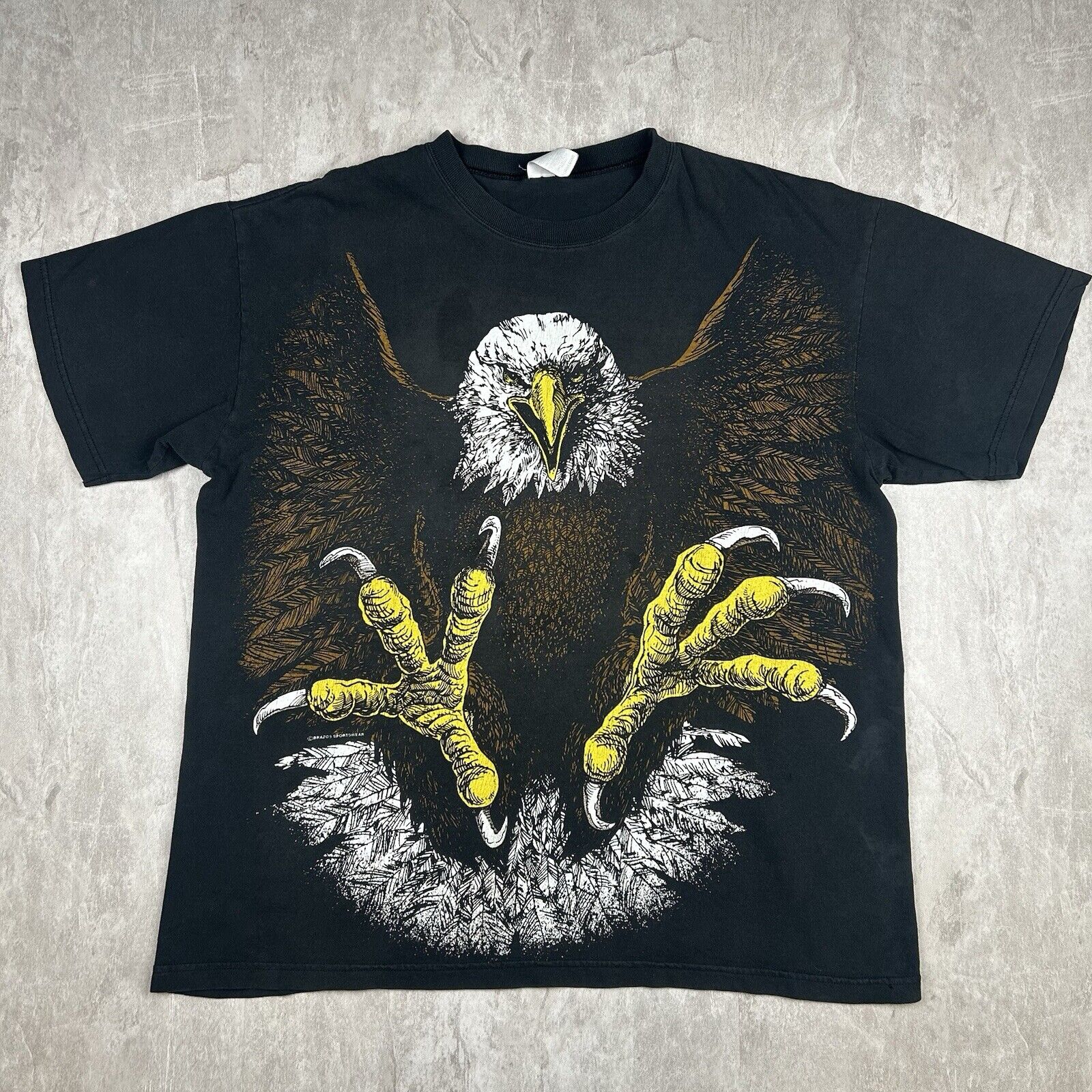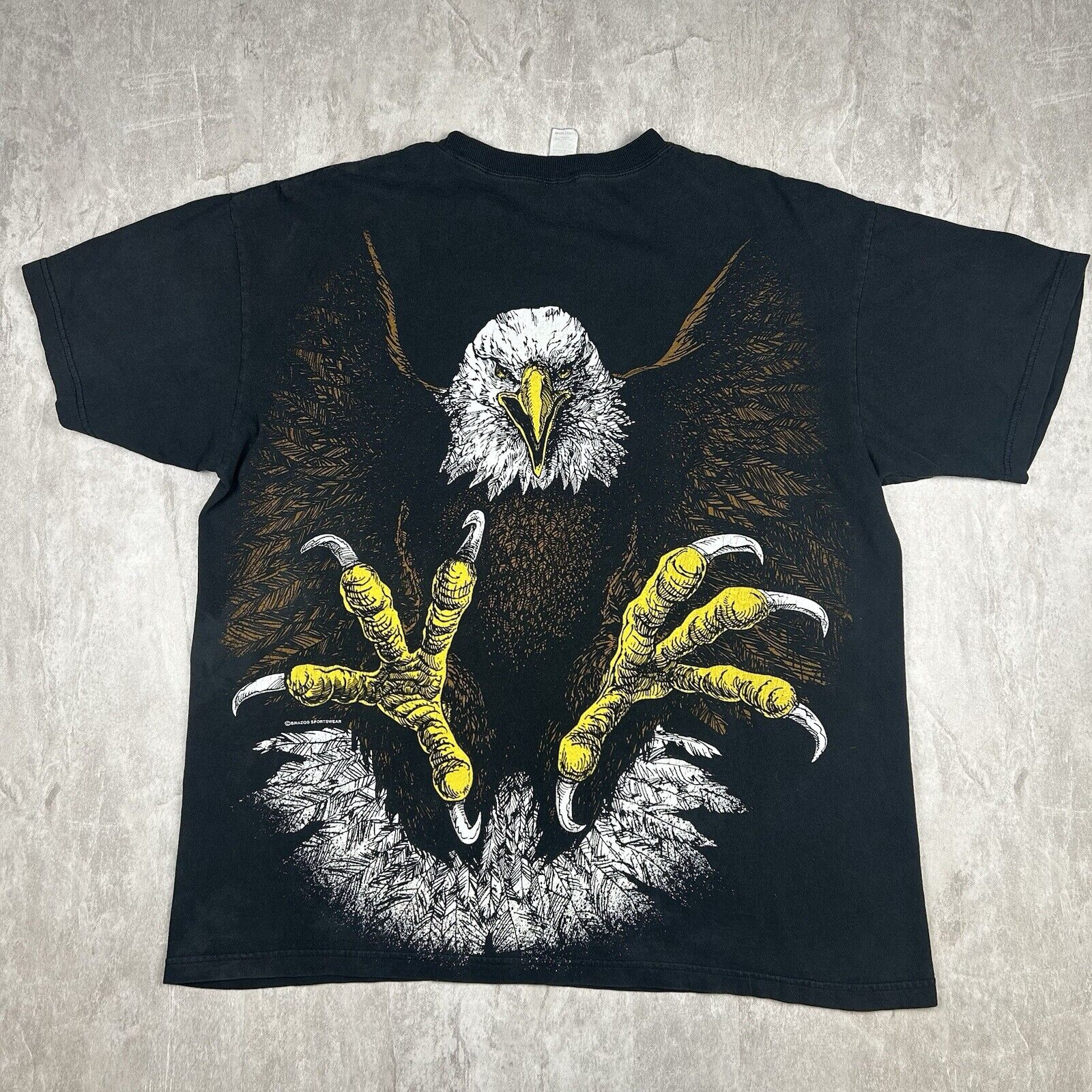This vintage Brazos Eagle T-shirt in Men's Size XL features an all-over print and a double-sided design on classic black fabric. Showcasing bold graphics and unique style, it's perfect for collectors or anyone who loves standout vintage apparel. A true statement piece!