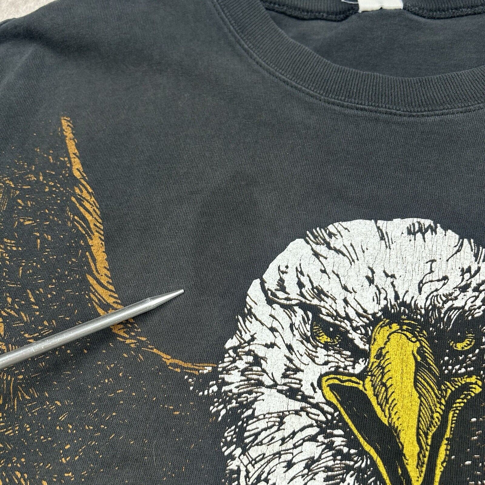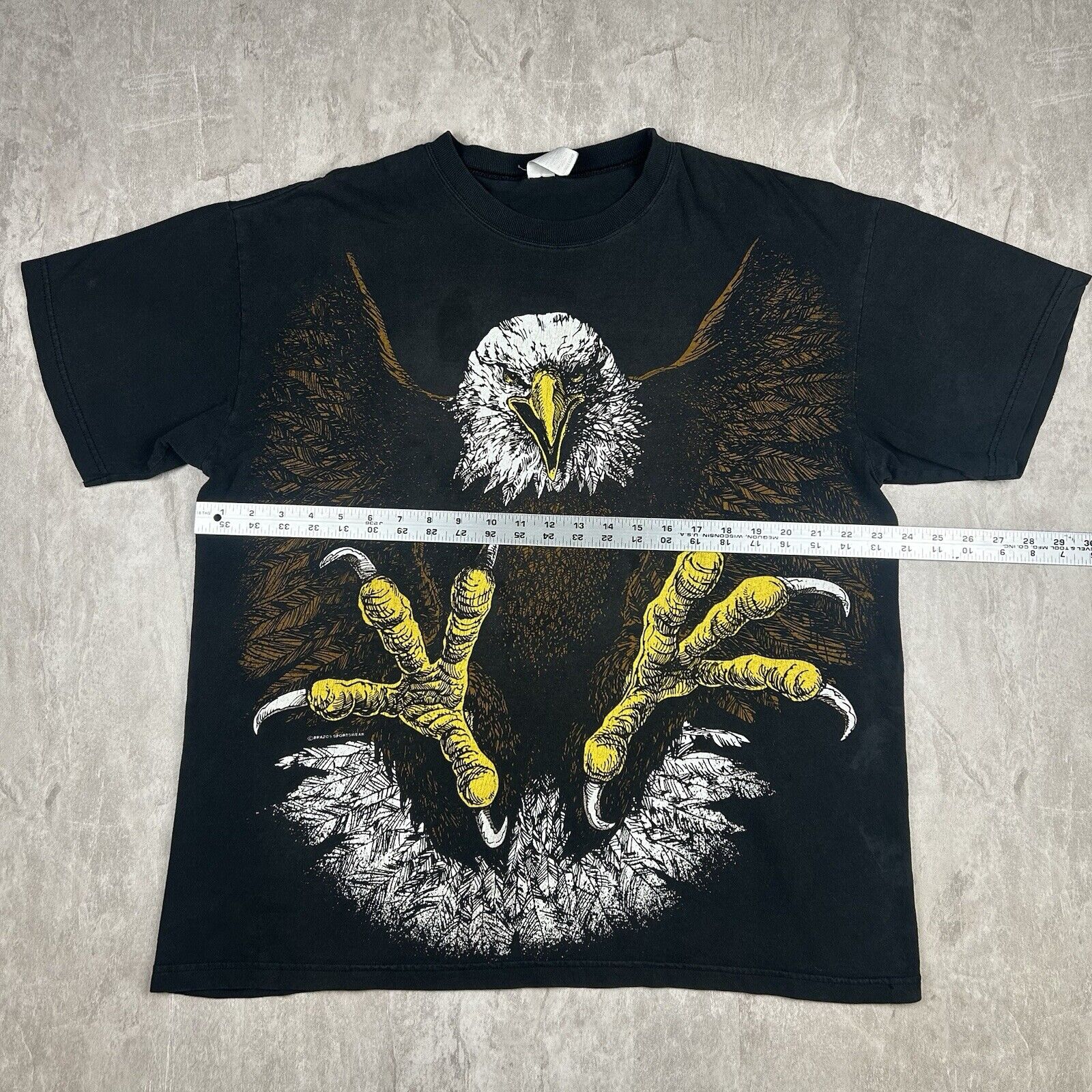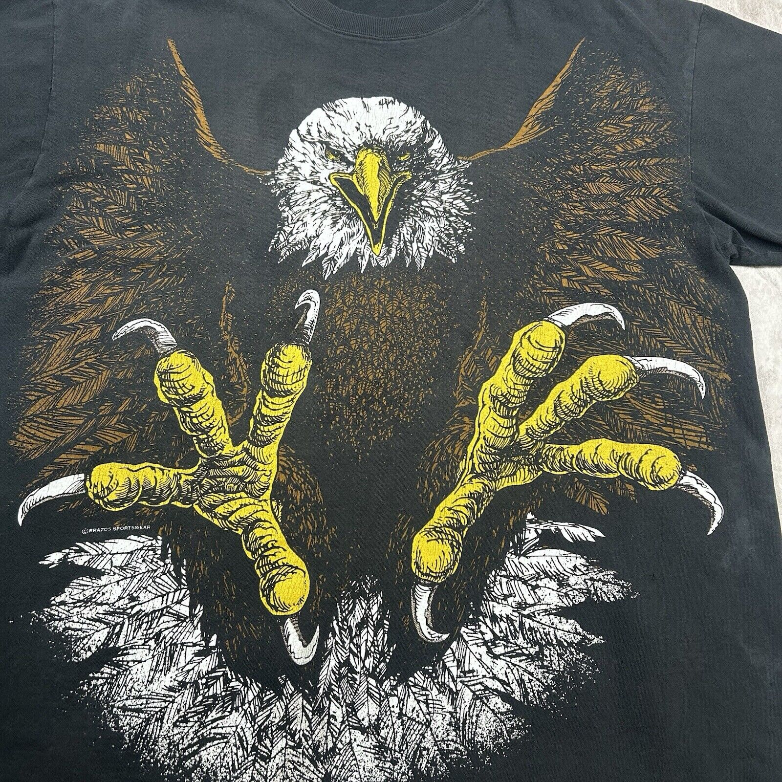 This vintage Brazos Eagle T-shirt in Men's Size XL features an all-over print and a double-sided design on classic black fabric. Showcasing bold graphics and unique style, it's perfect for collectors or anyone who loves standout vintage apparel. A true statement piece!