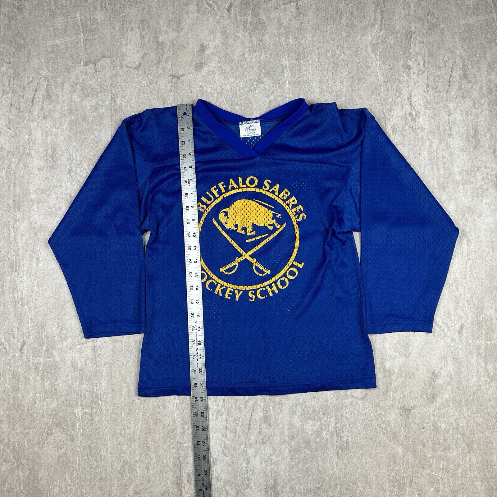 Support the Sabres with this Vintage Buffalo Sabres Hockey School Jersey. In blue, this NHL youth size M jersey is perfect for young fans who want to show their team pride. Featuring classic Sabres branding, it's a great choice for any budding hockey enthusiast or collector.