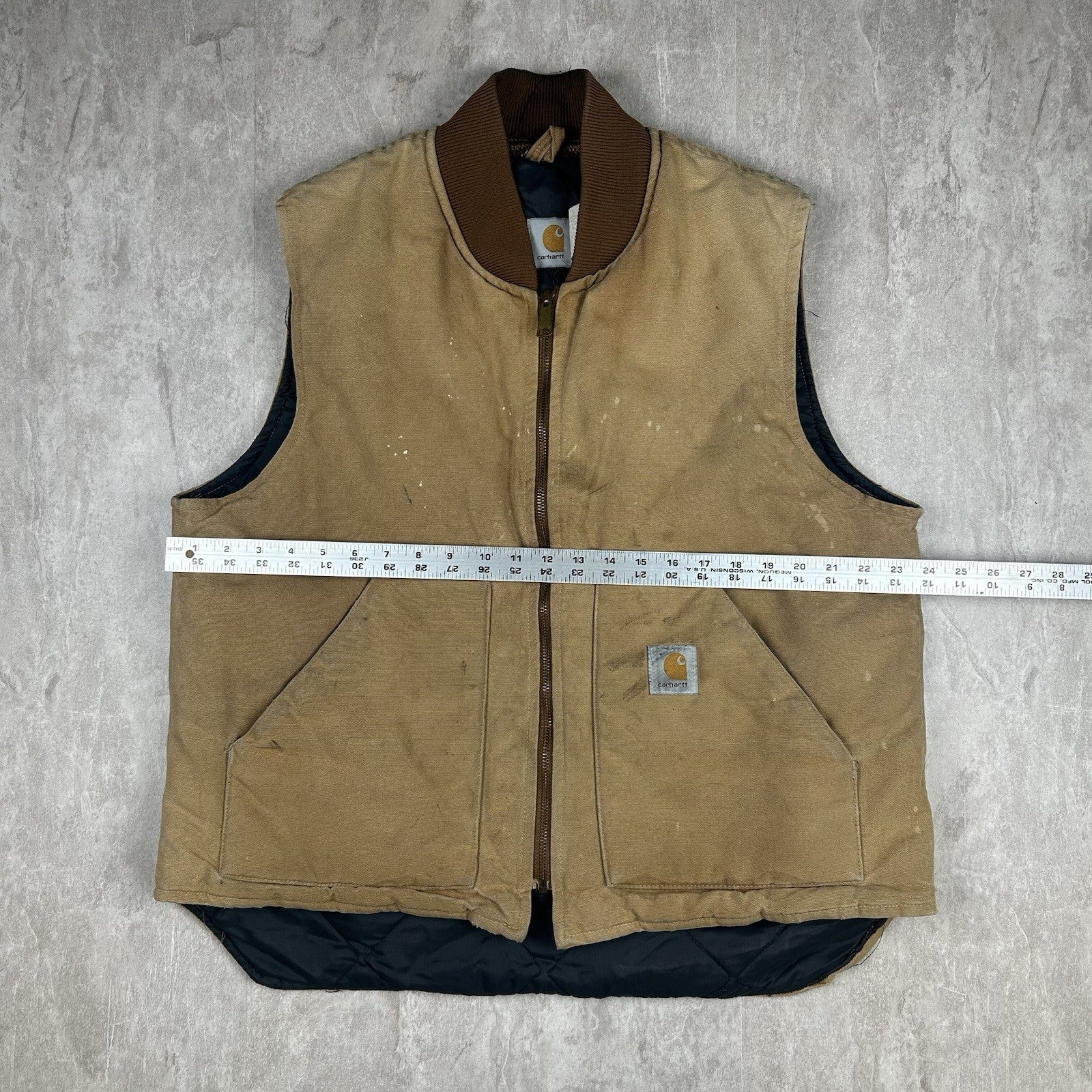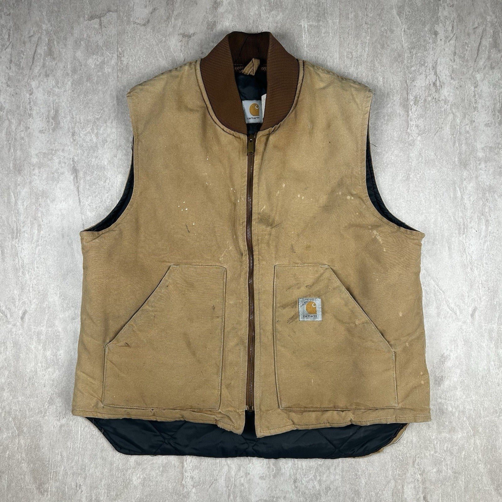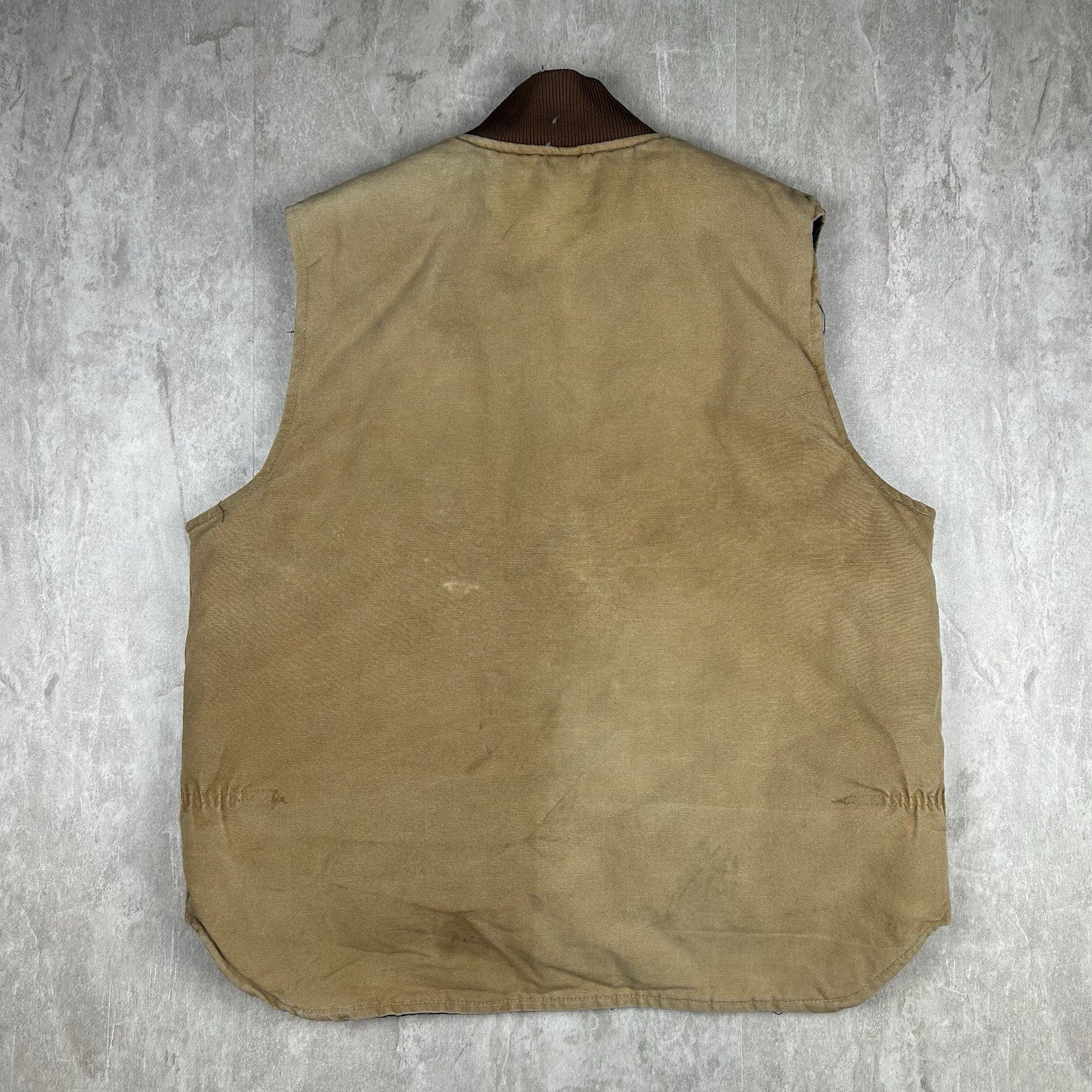 This vintage Carhartt VQ186 duck vest features a rugged brown canvas shell with warm quilted lining. Union made in the USA, it's a durable and timeless workwear piece. Men's size XL.