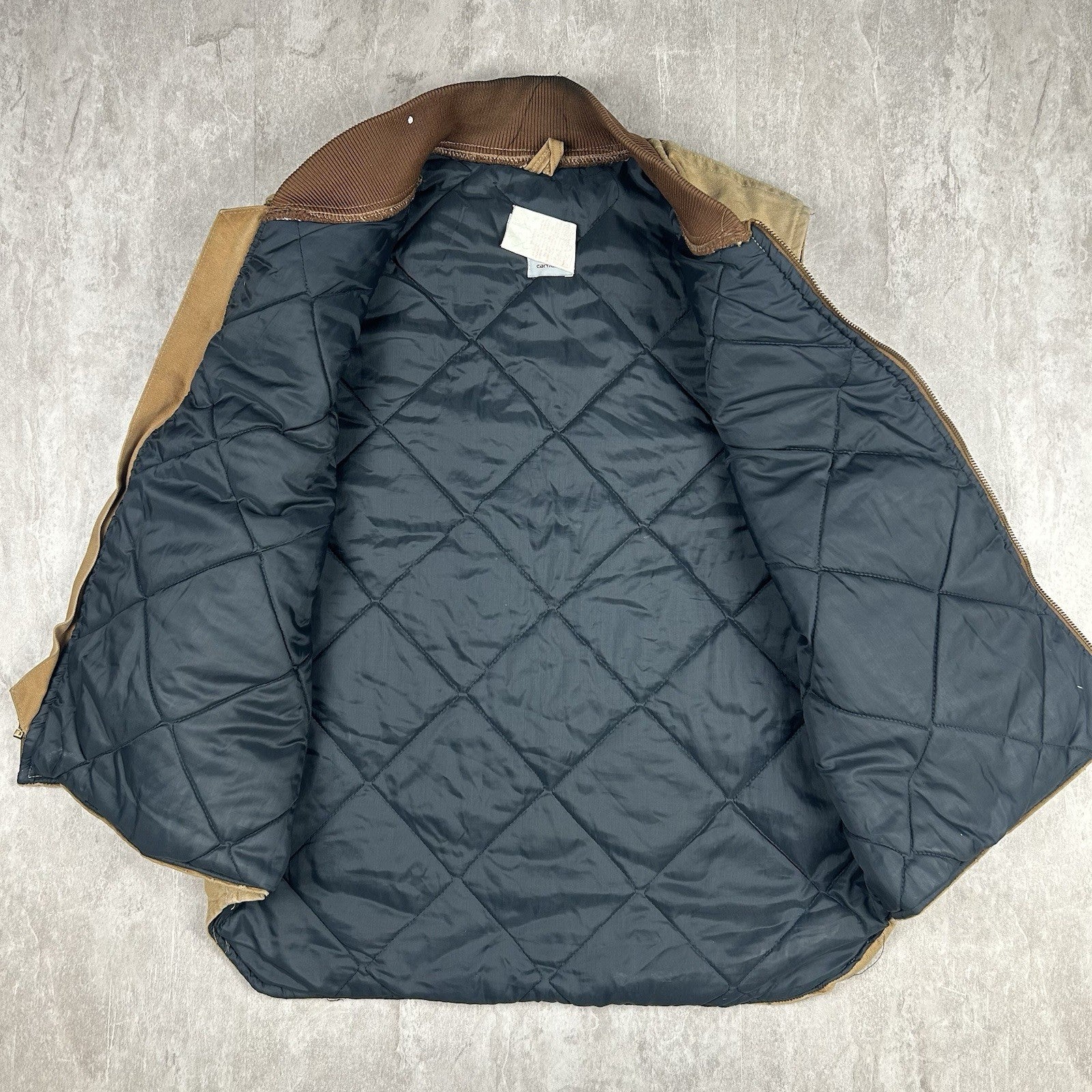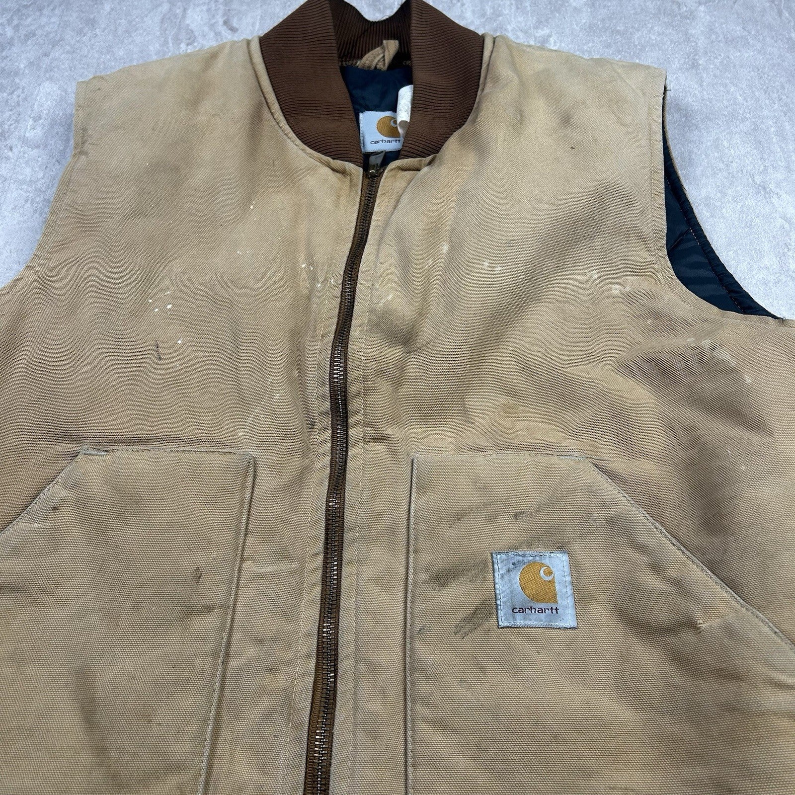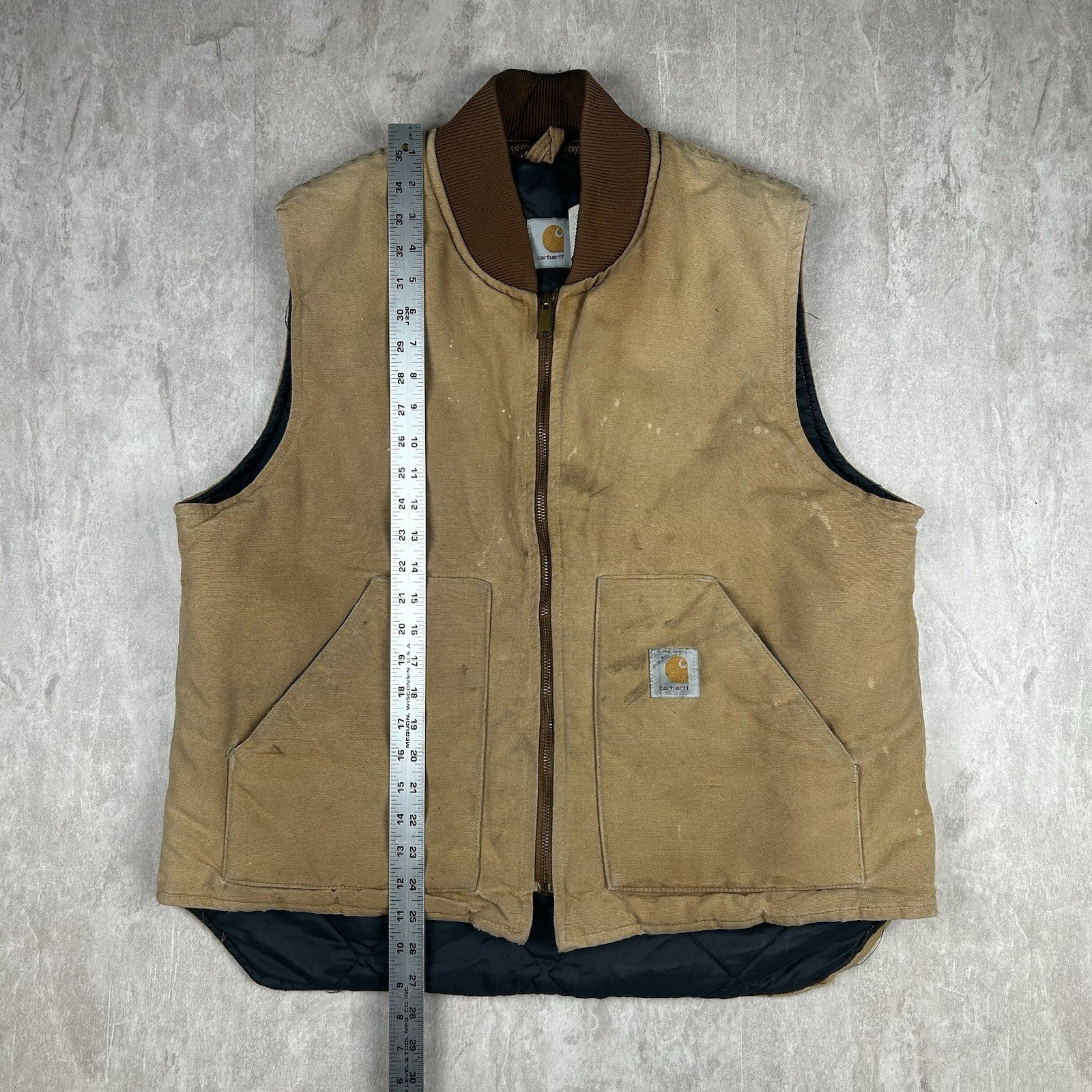 This vintage Carhartt VQ186 duck vest features a rugged brown canvas shell with warm quilted lining. Union made in the USA, it's a durable and timeless workwear piece. Men's size XL.