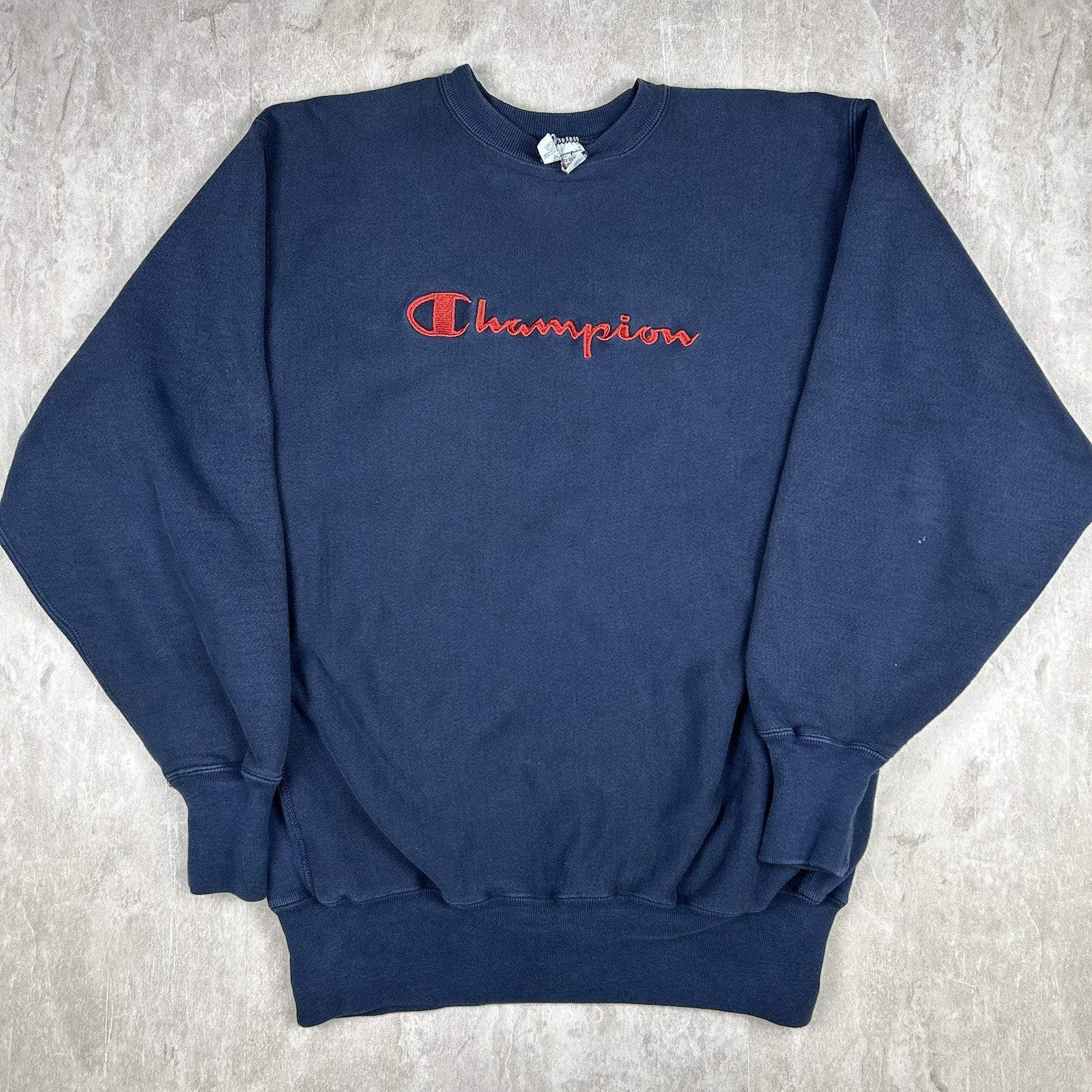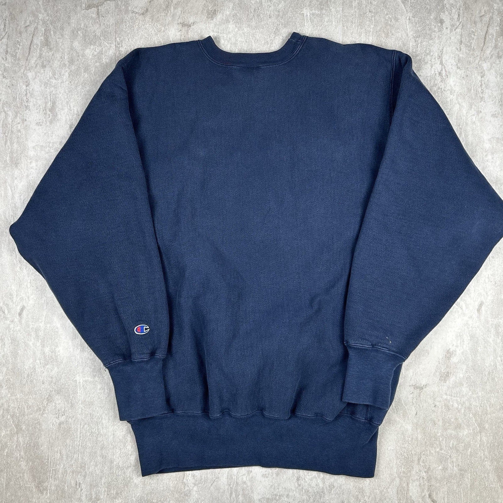 Vintage 1990s Champion Reverse Weave sweatshirt in classic blue with embroidered chest logo. Heavyweight cotton, iconic athletic fit, made to last. Men's size 2XL.