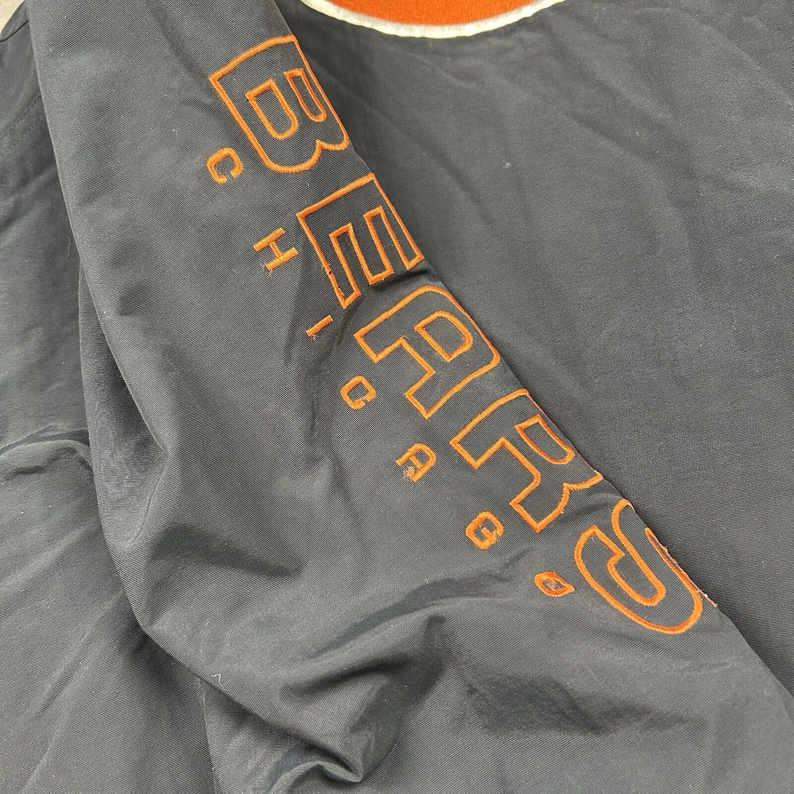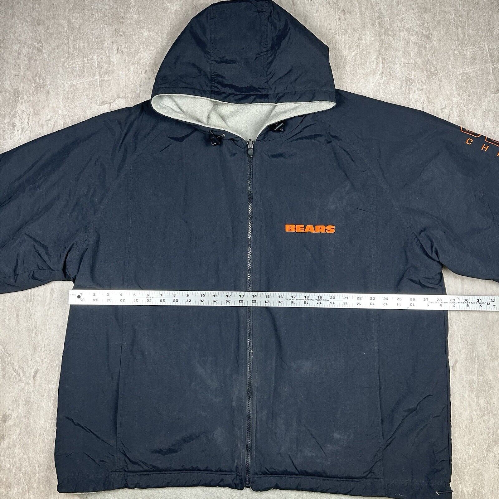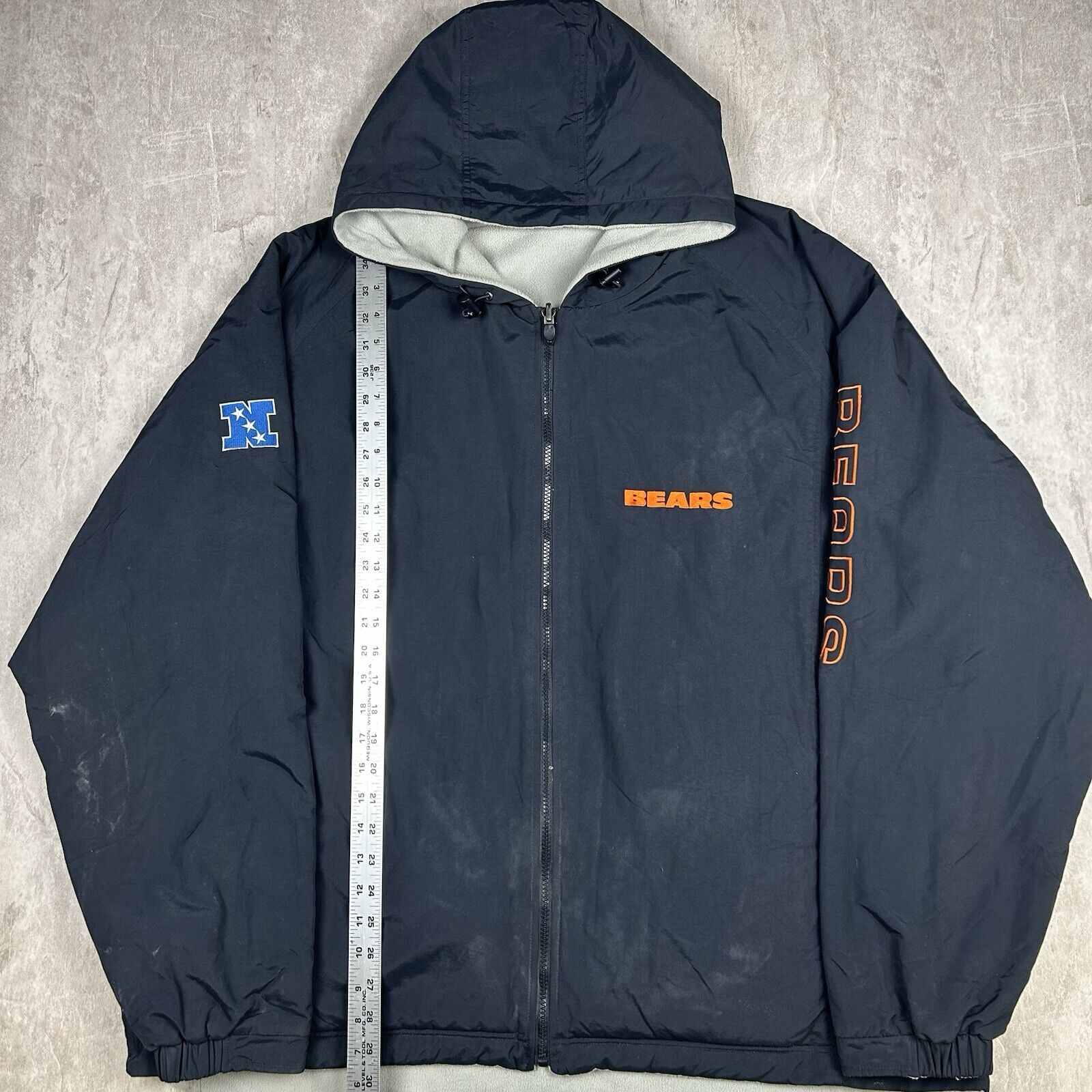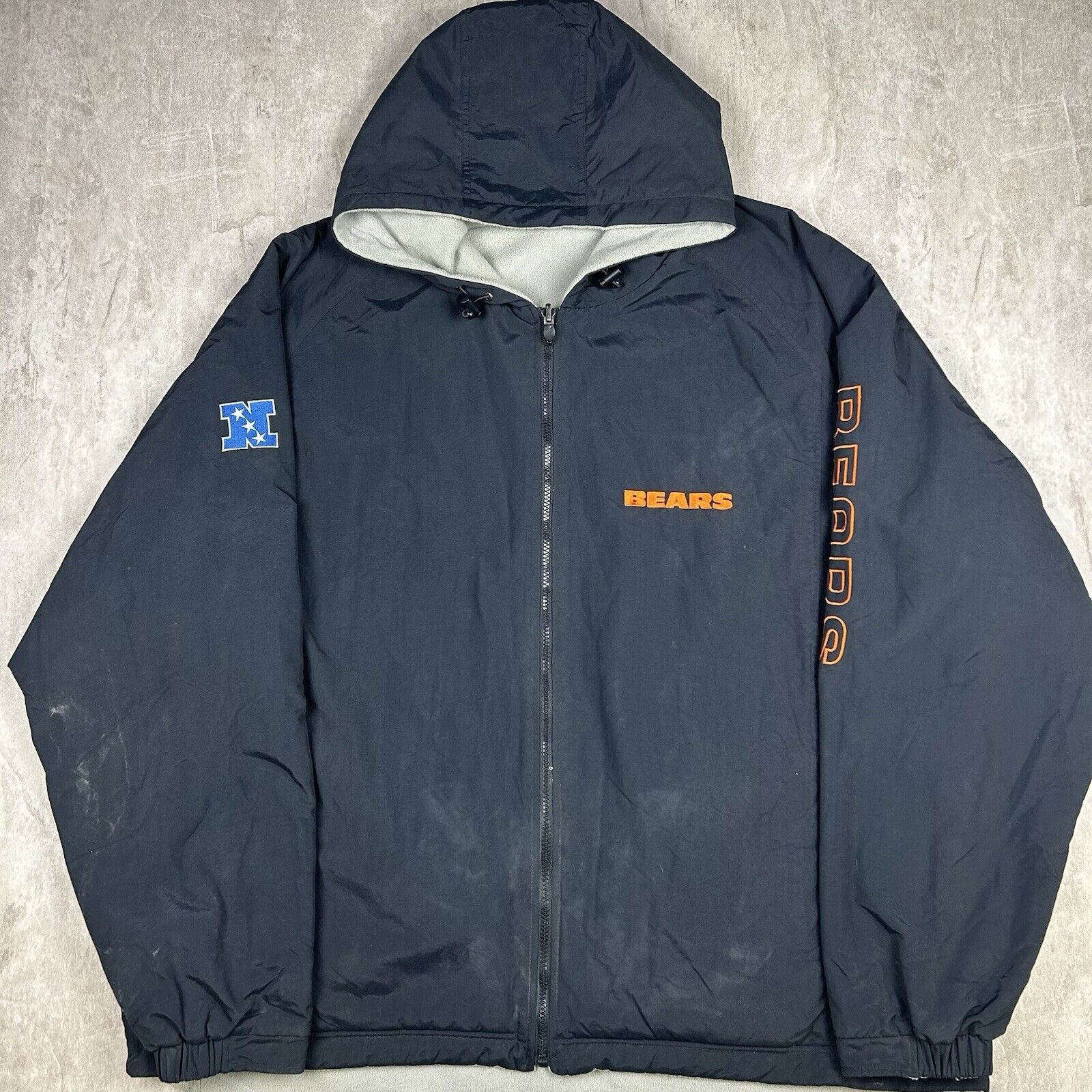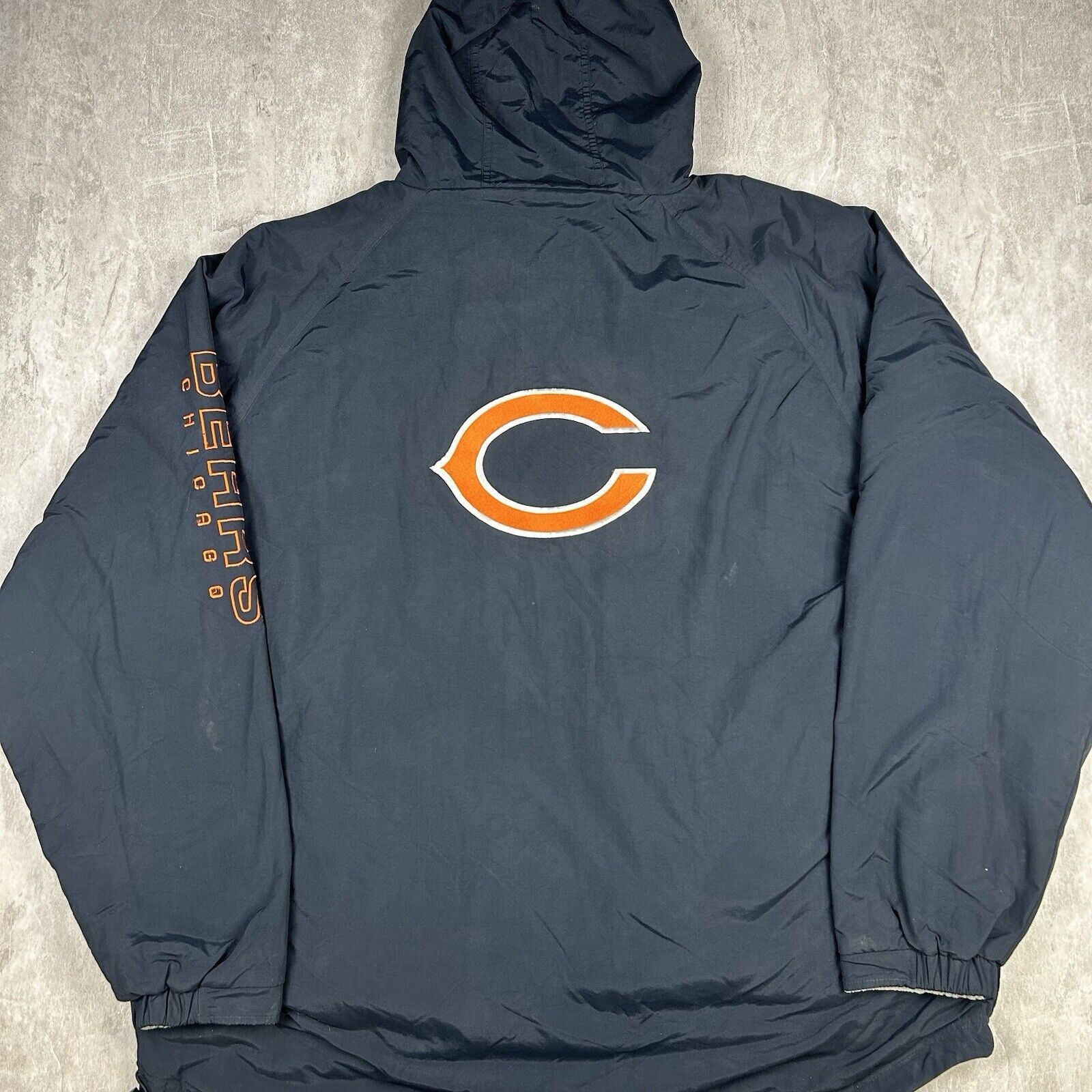 Presenting the Vintage Chicago Bears Embroidered Hooded Winter Coat Jacket, perfect for any NFL fan. This jacket showcases the iconic Bears logo with detailed embroidery, offering warmth and comfort for the colder months. Though the men's size is currently unknown, it is ideal for showcasing team pride while staying cozy during the winter season.