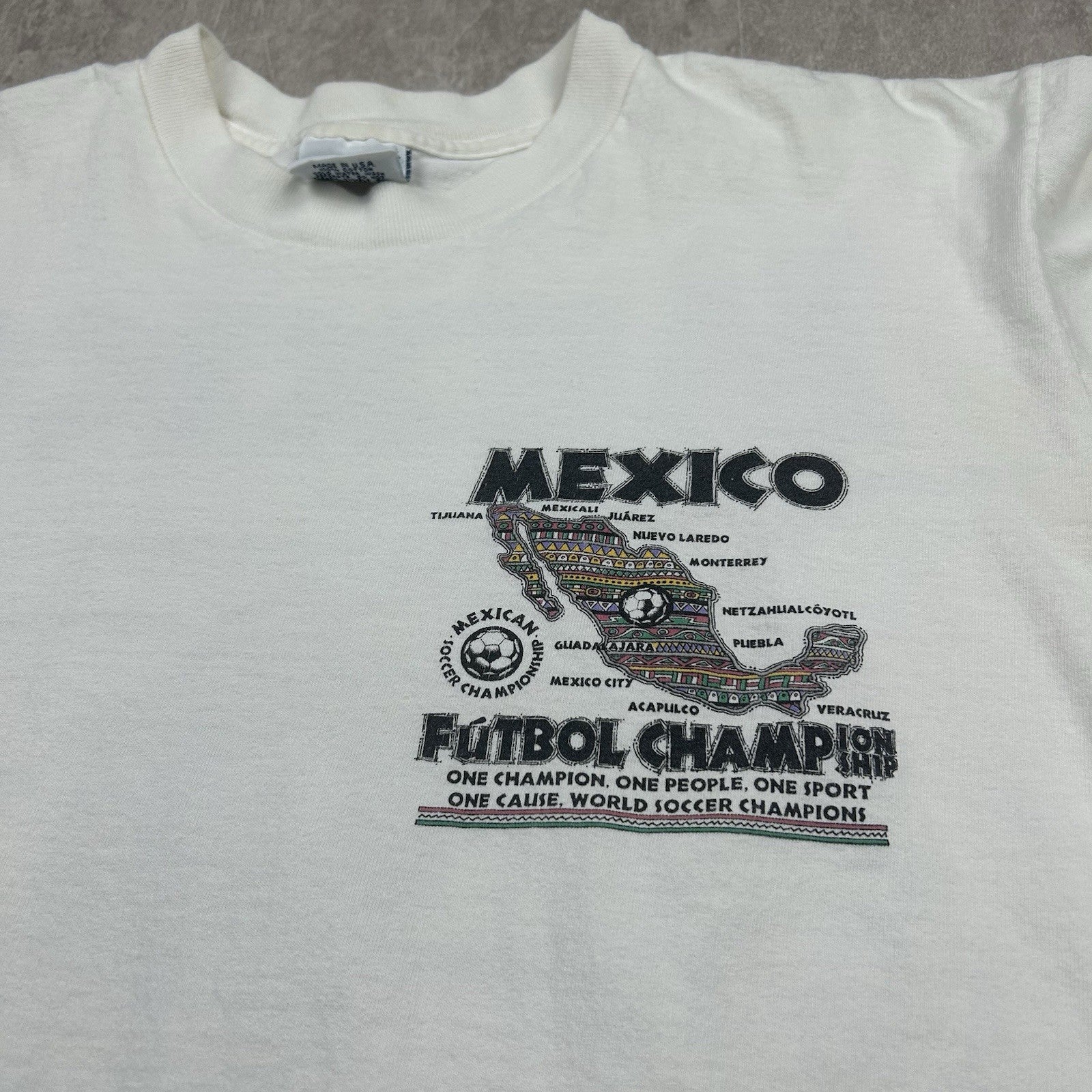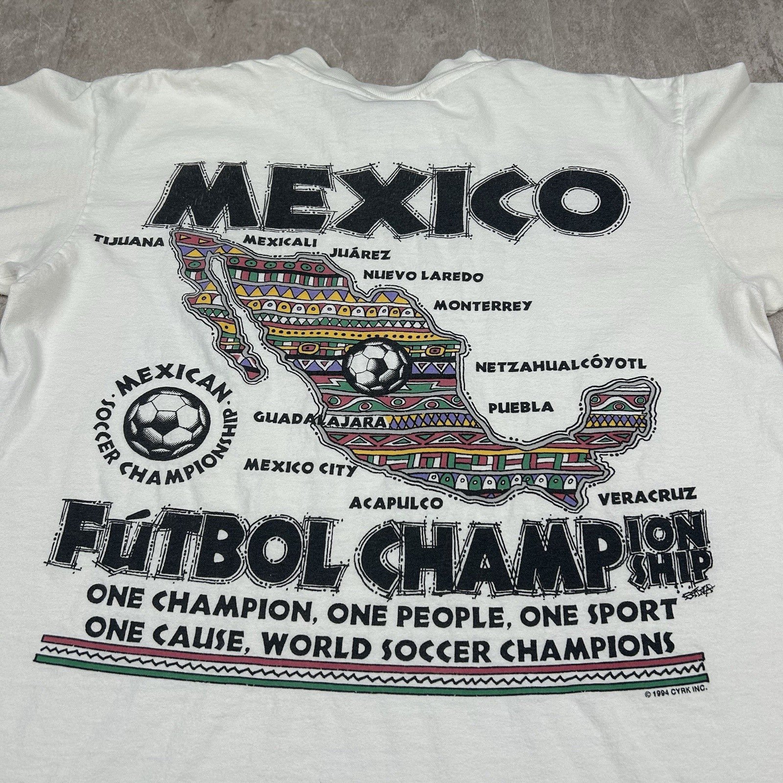 This vintage CYRK Mexico Futbol Championship T-shirt features bold soccer graphics celebrating the spirit of the game. A classic piece of 90s sportswear style. Men's size M.