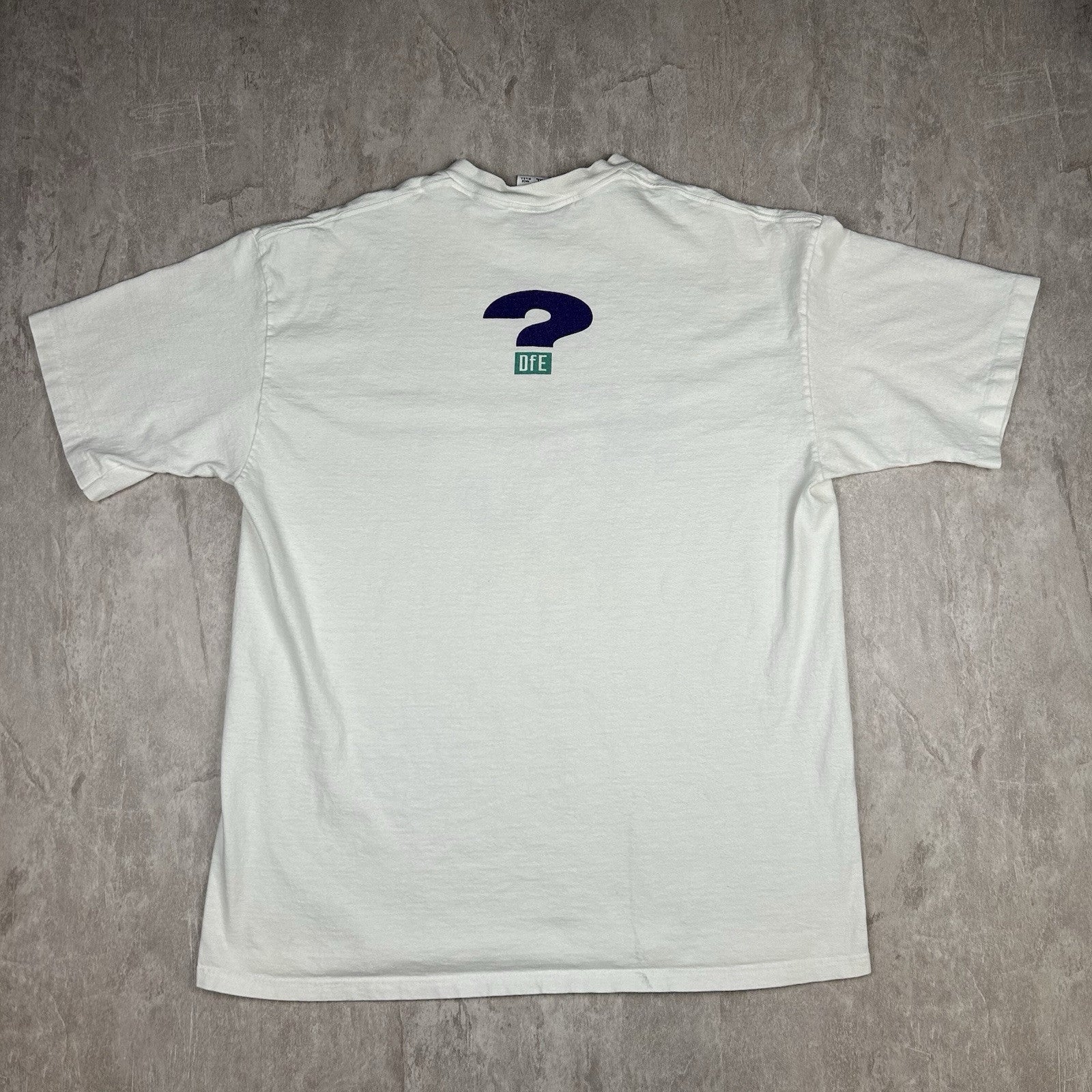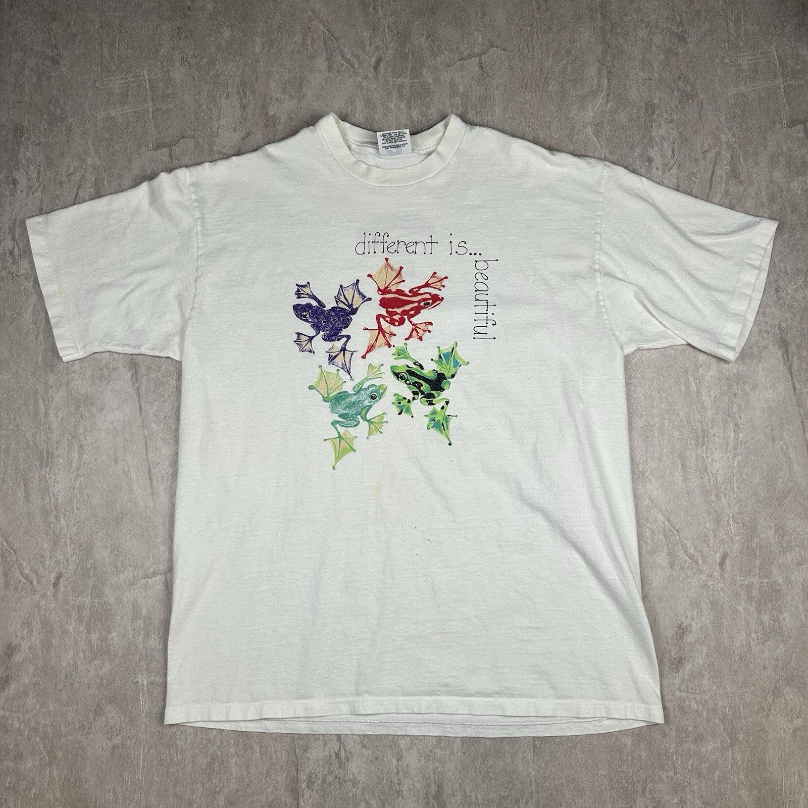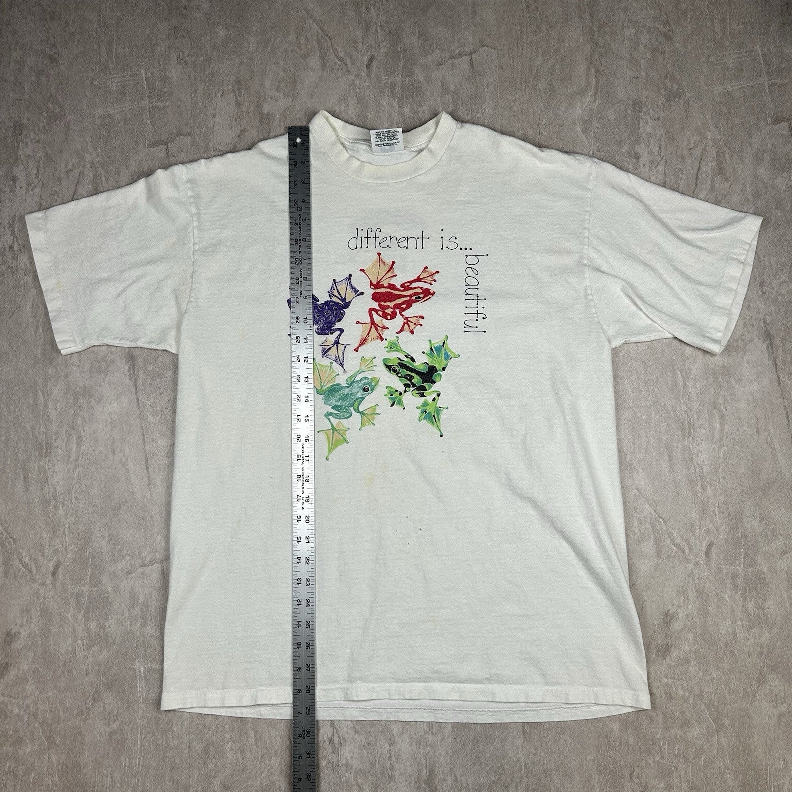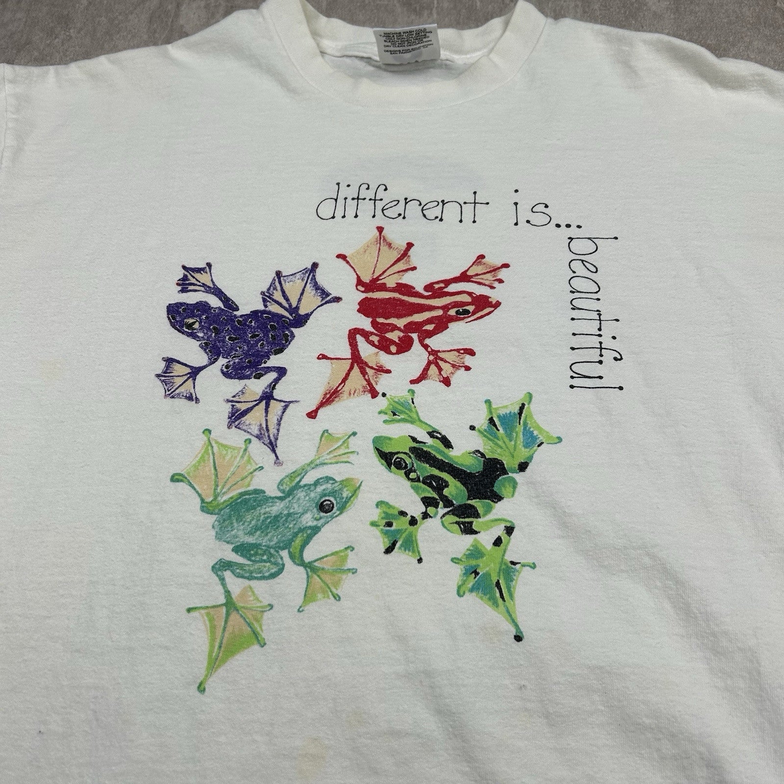 This vintage "Different Is Beautiful" Tree Frogs T-shirt features a charming frog graphic with a positive message. Crafted in the USA by DFE, it offers a unique design in a crisp white color. Men's size XL.