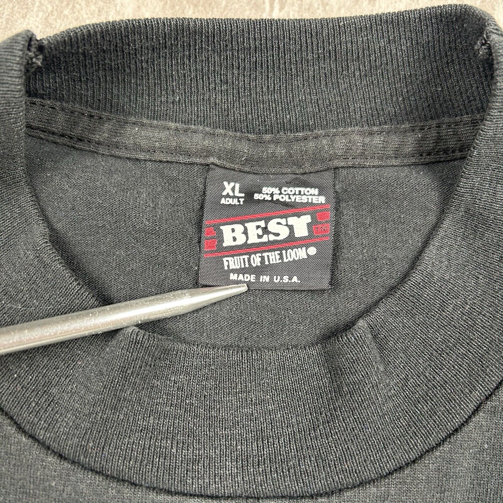 This vintage "Get Outta Line.. It's The Law" black T-shirt in Men's Size XL features a bold graphic with a humorous message. Made by Screen Stars, this soft cotton tee offers a comfortable fit and a fun twist on classic graphic tees. Perfect for collectors of quirky vintage apparel or anyone looking to make a statement!