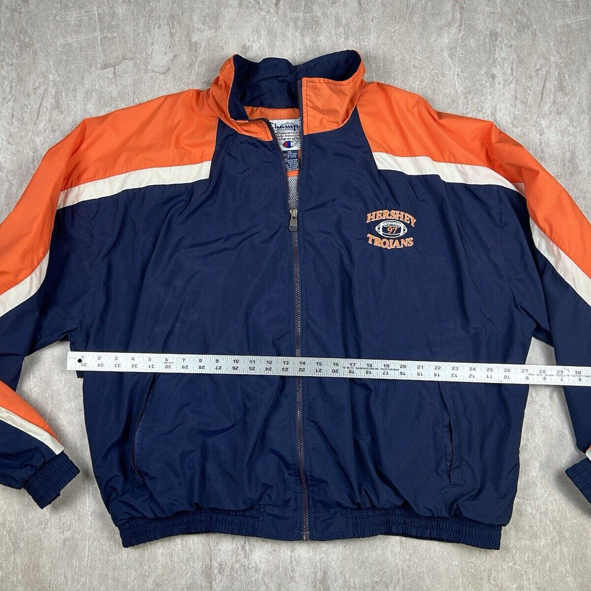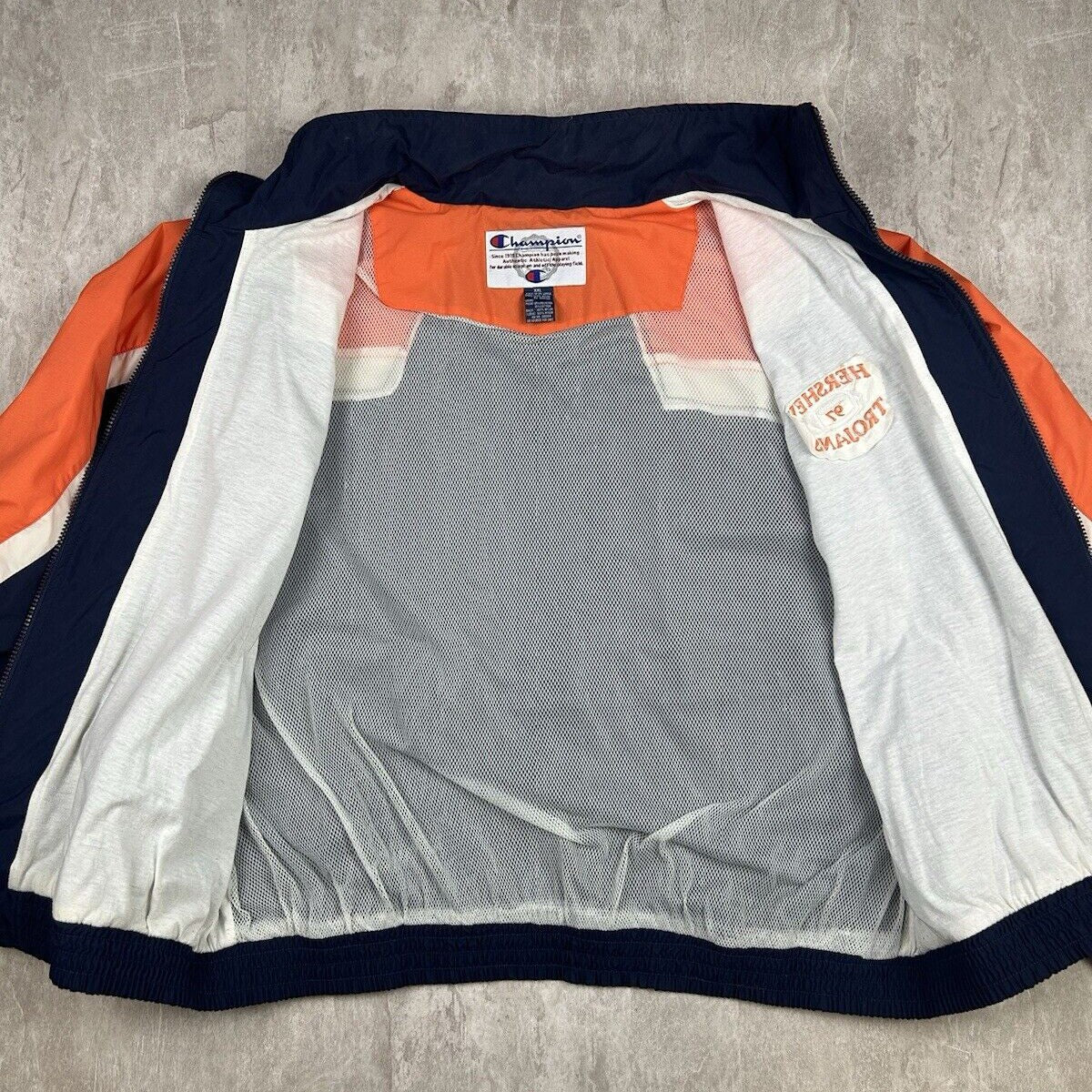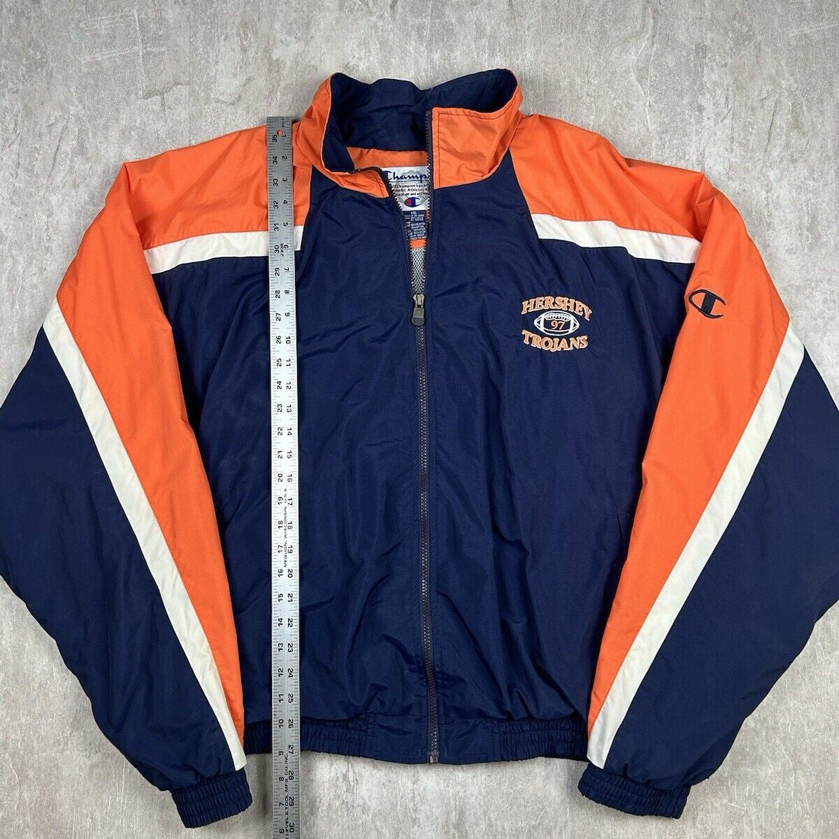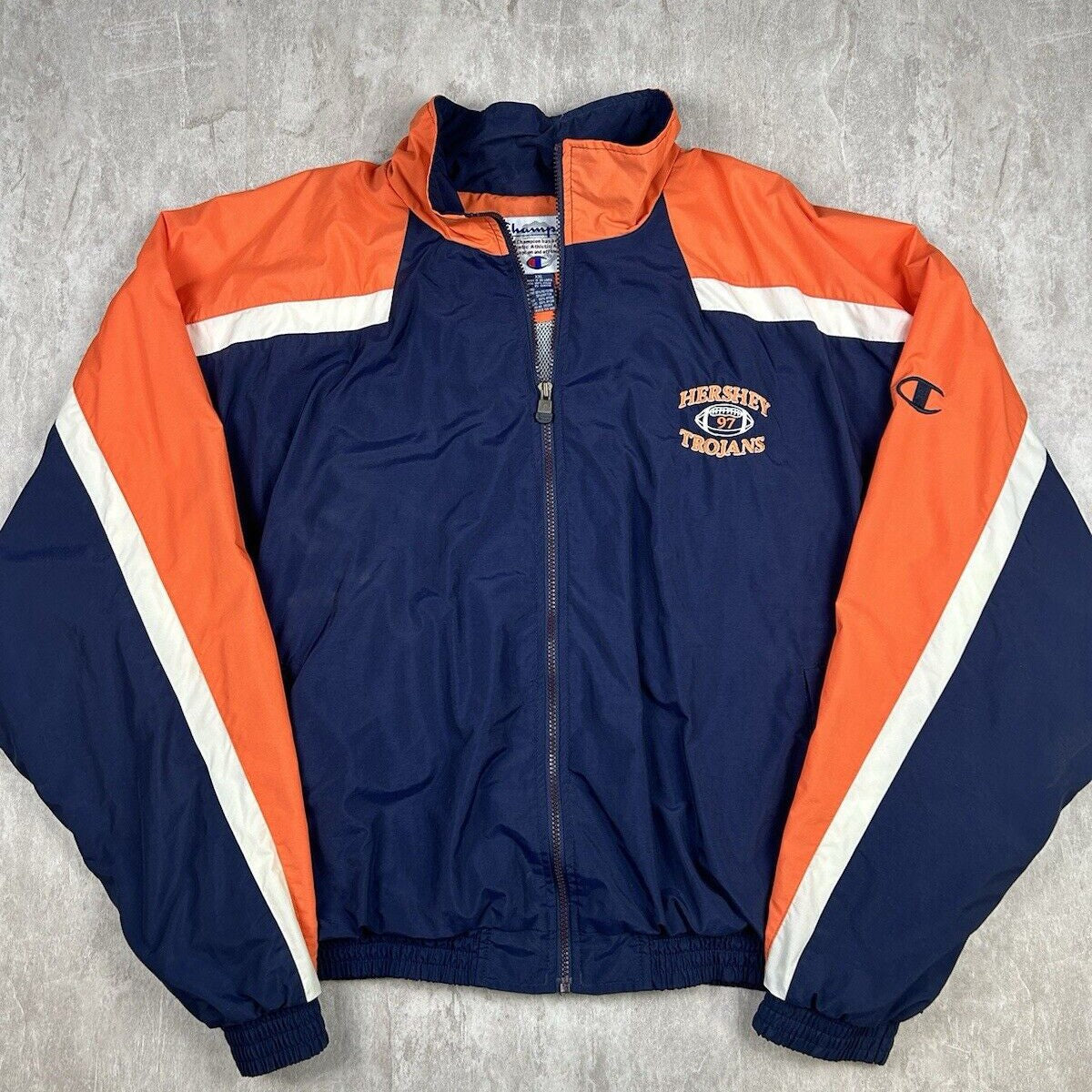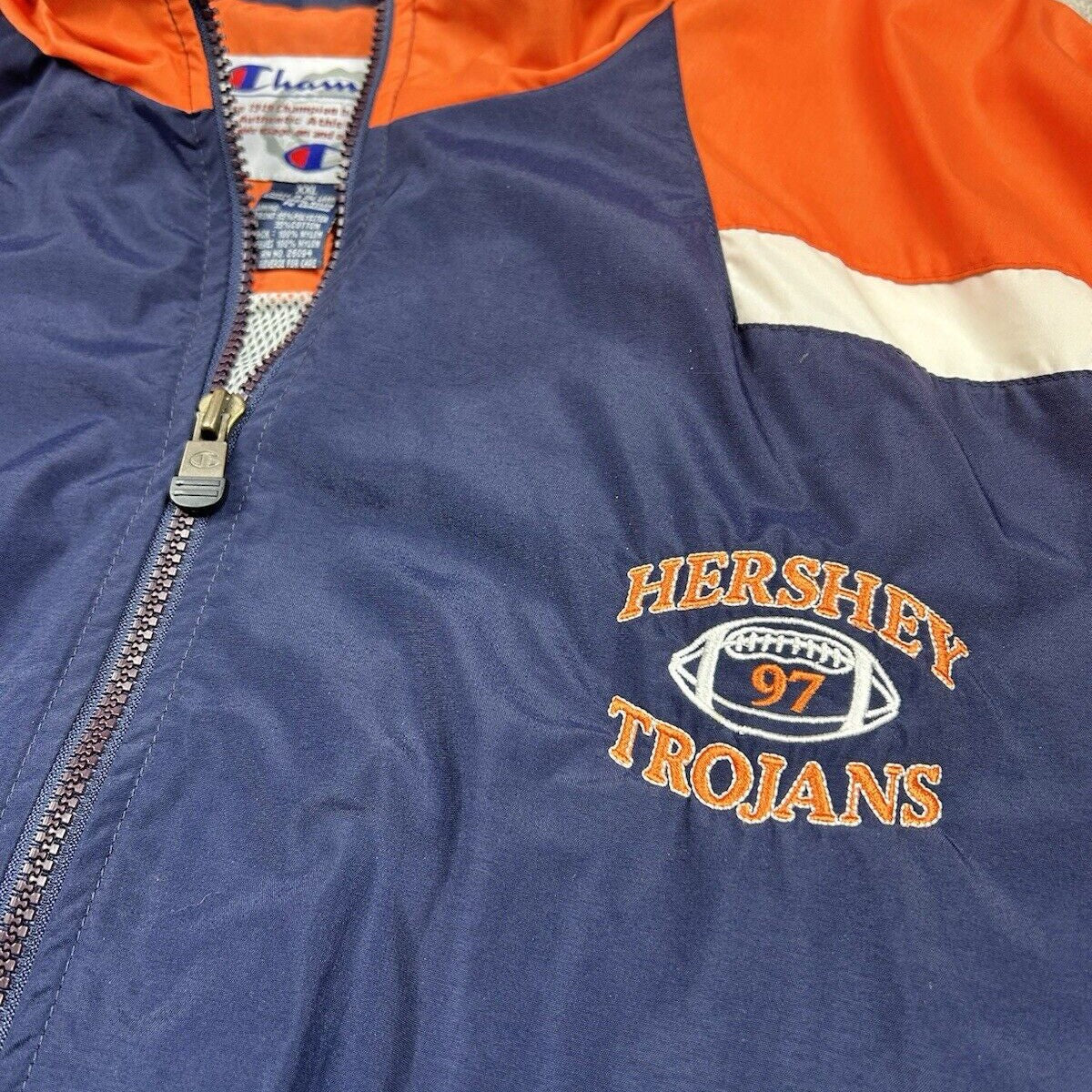 This vintage Hershey High School Trojans Football Champion jacket is a great find for fans of the school or high school football in general. In men's size 2XL, it features the Trojans' logo and colors, providing both a nostalgic touch and practical warmth. The Champion brand ensures quality and durability, making it a standout piece for showing school pride.
