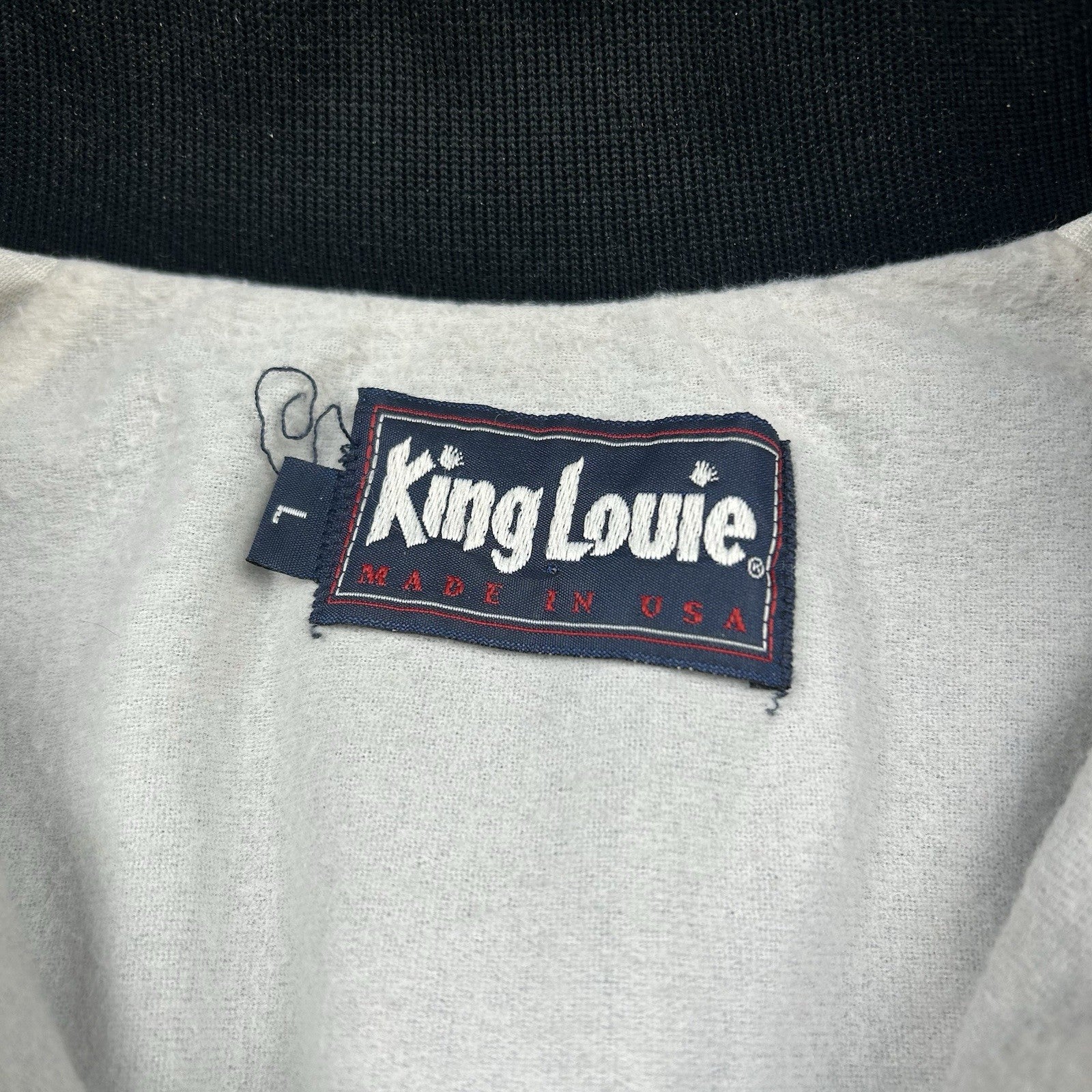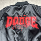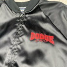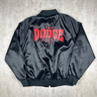 Sleek vintage King Louie satin jacket featuring Dodge branding and a made-in-USA tag. Classic black with bold embroidered details and a full zip front. Men's size L.