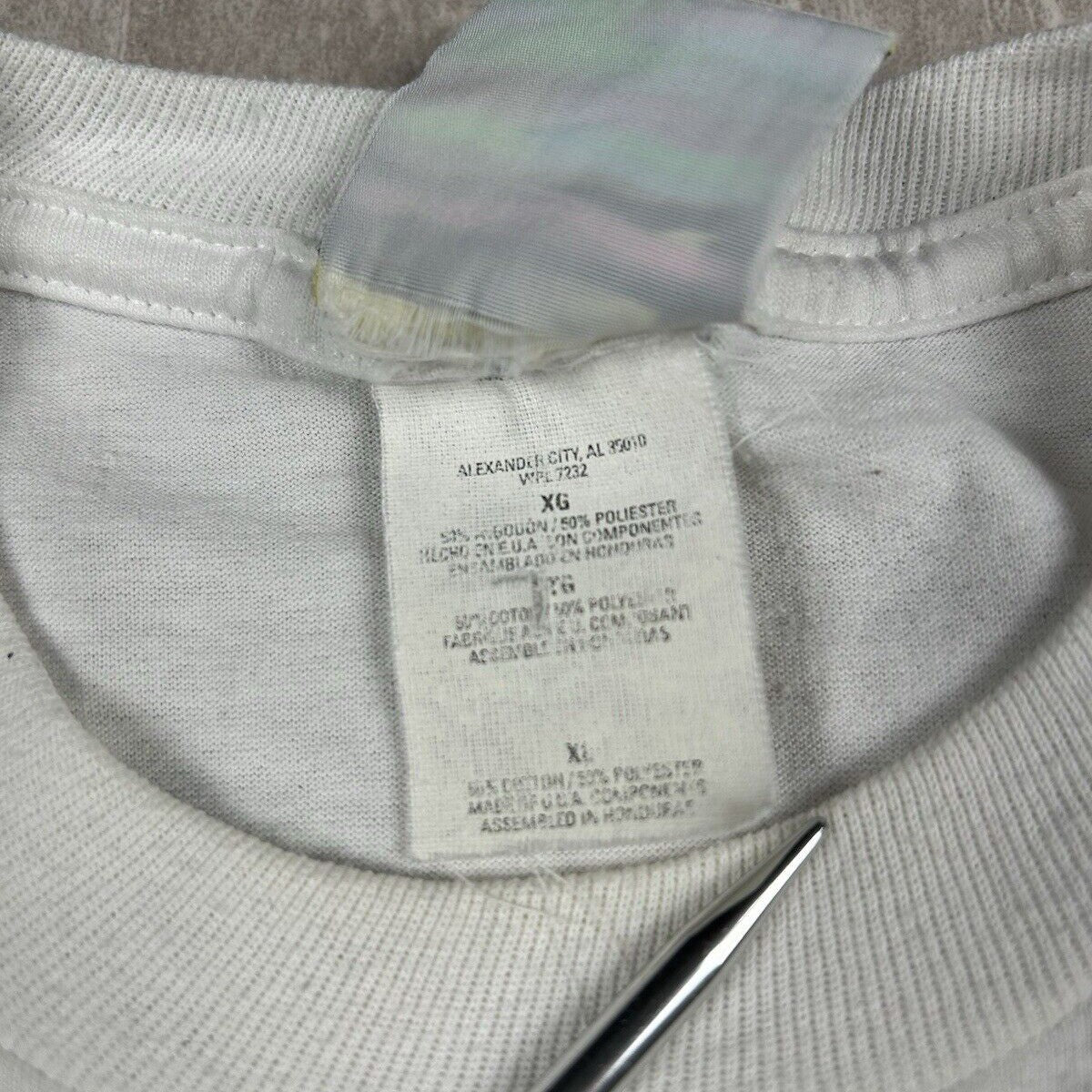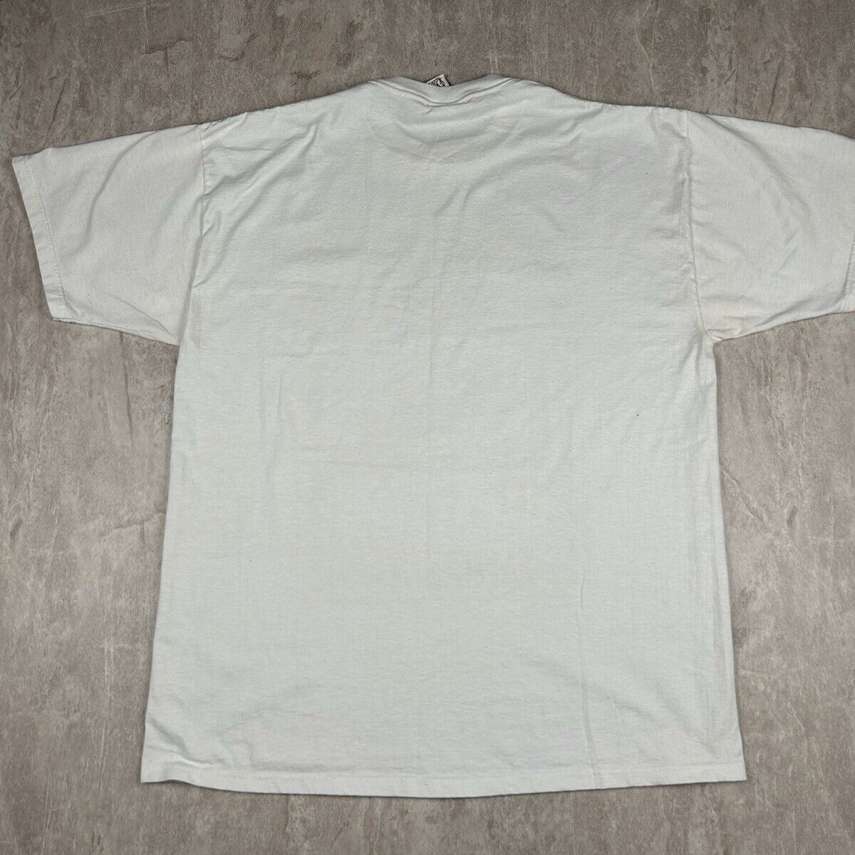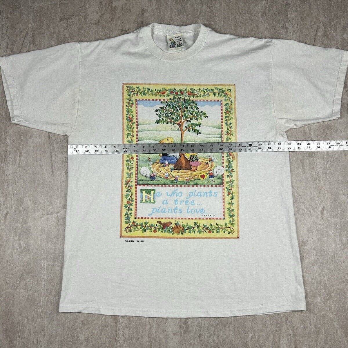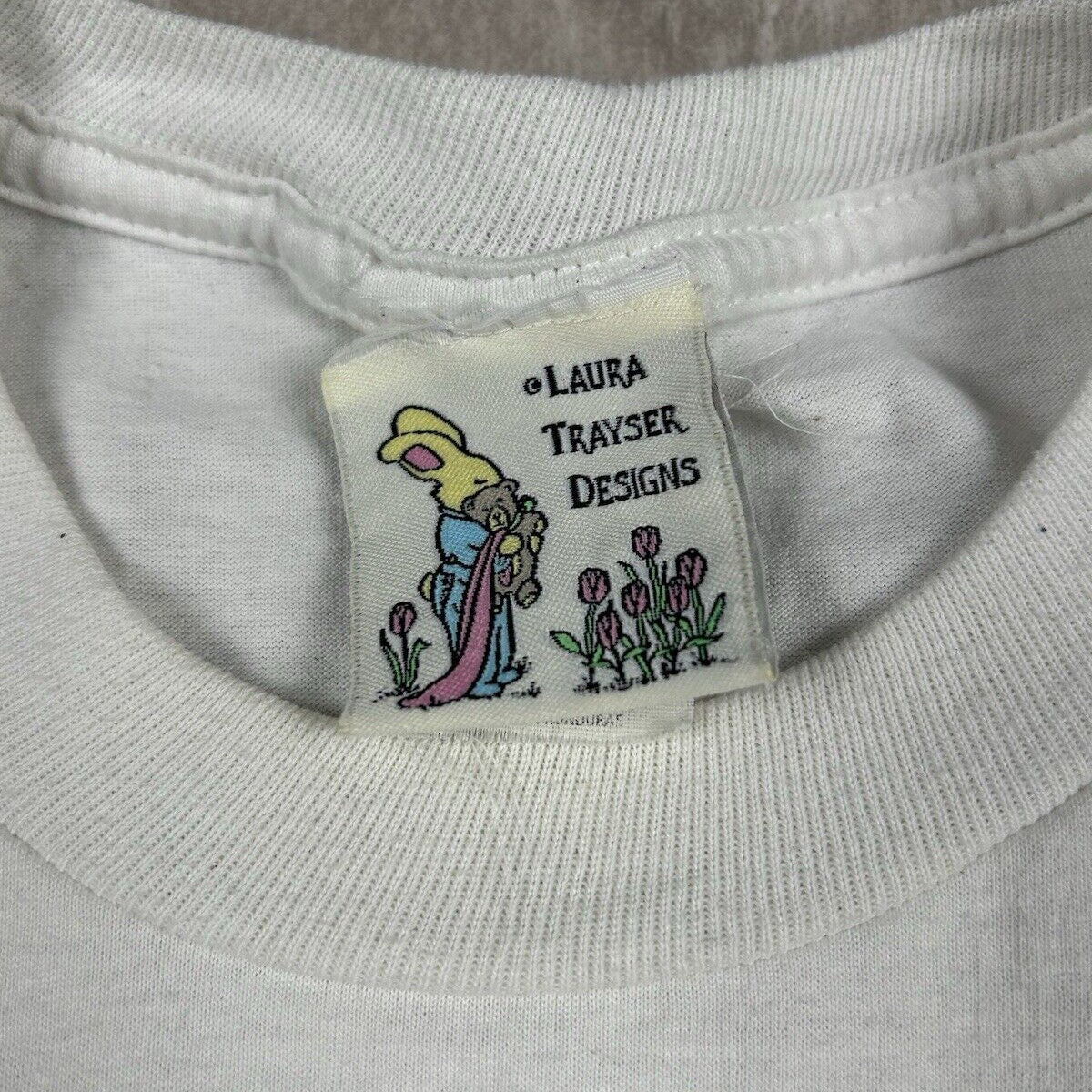 Add a whimsical touch to your wardrobe with our Vintage Laura Trayser Designs T-Shirt. This men’s size XL tee features a charming graphic of a bunny rabbit planting a tree, embodying a message of love and nature with a unique and artistic design.