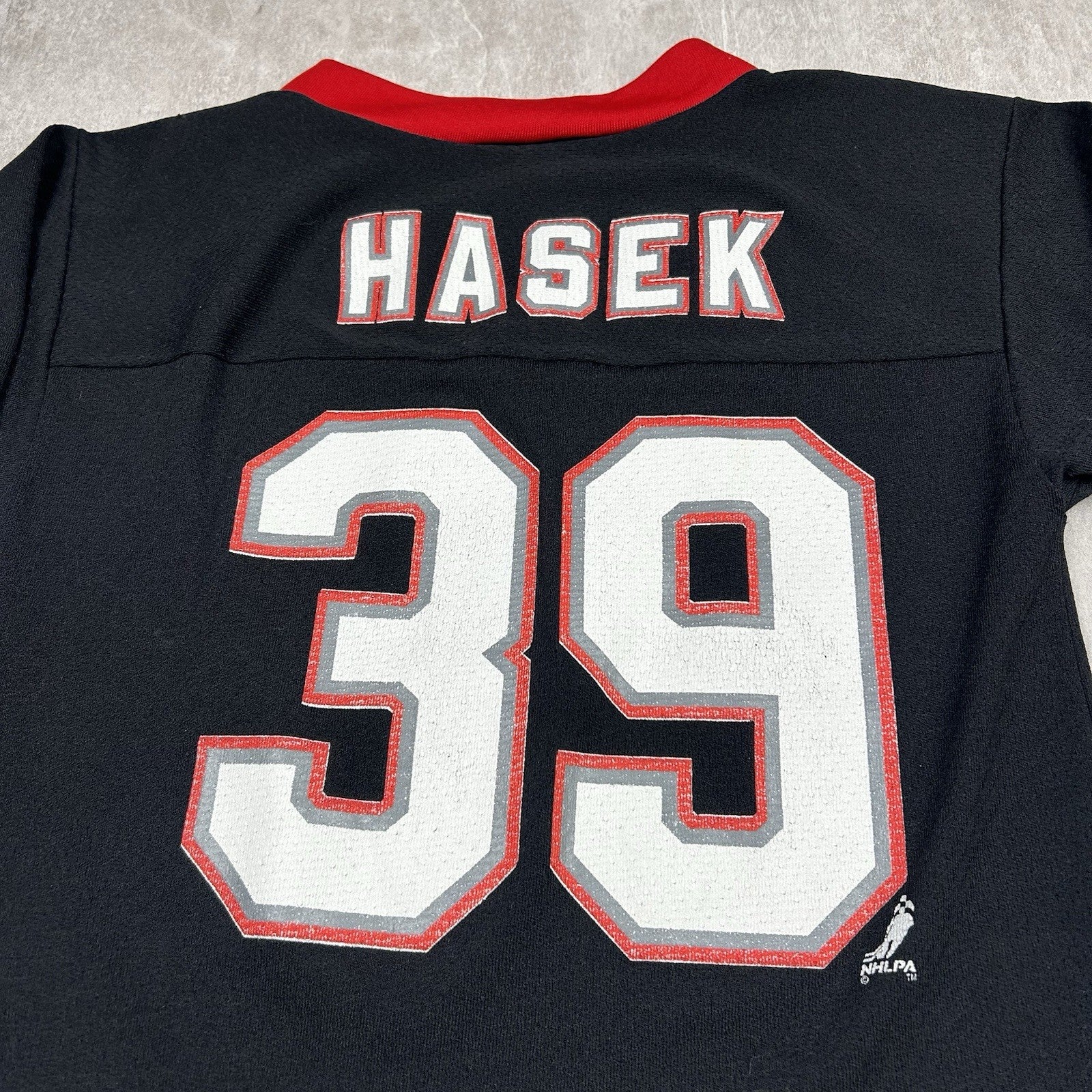 This vintage Logo 7 Buffalo Sabres hockey jersey features Dominik Hasek's iconic #39 and classic team colors. A perfect throwback for young fans or collectors of 90s NHL gear. Youth size 10/12.