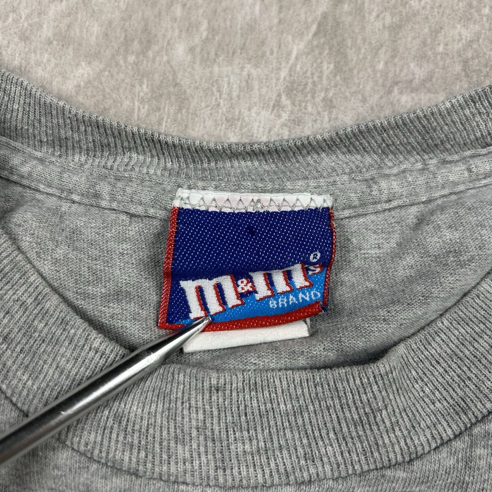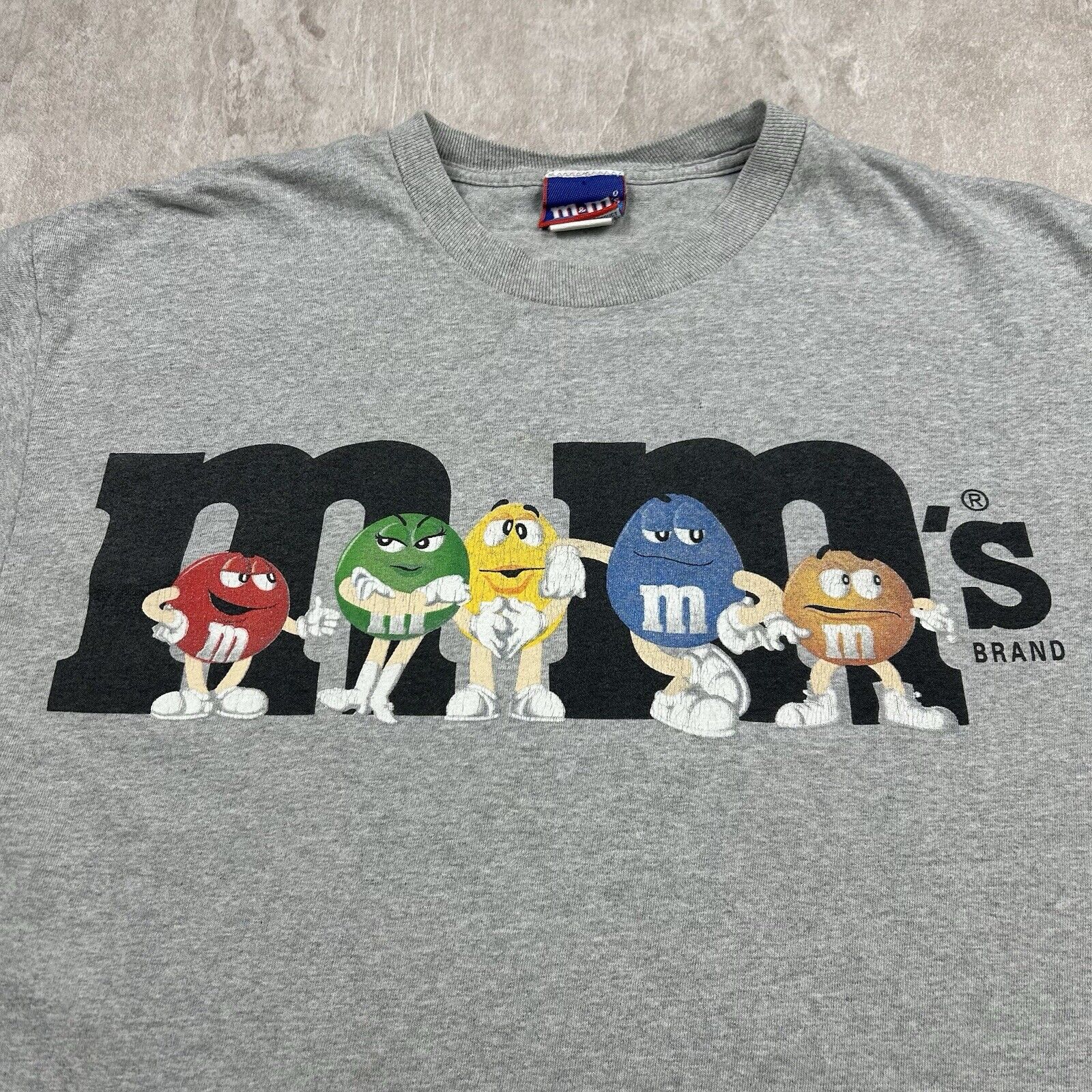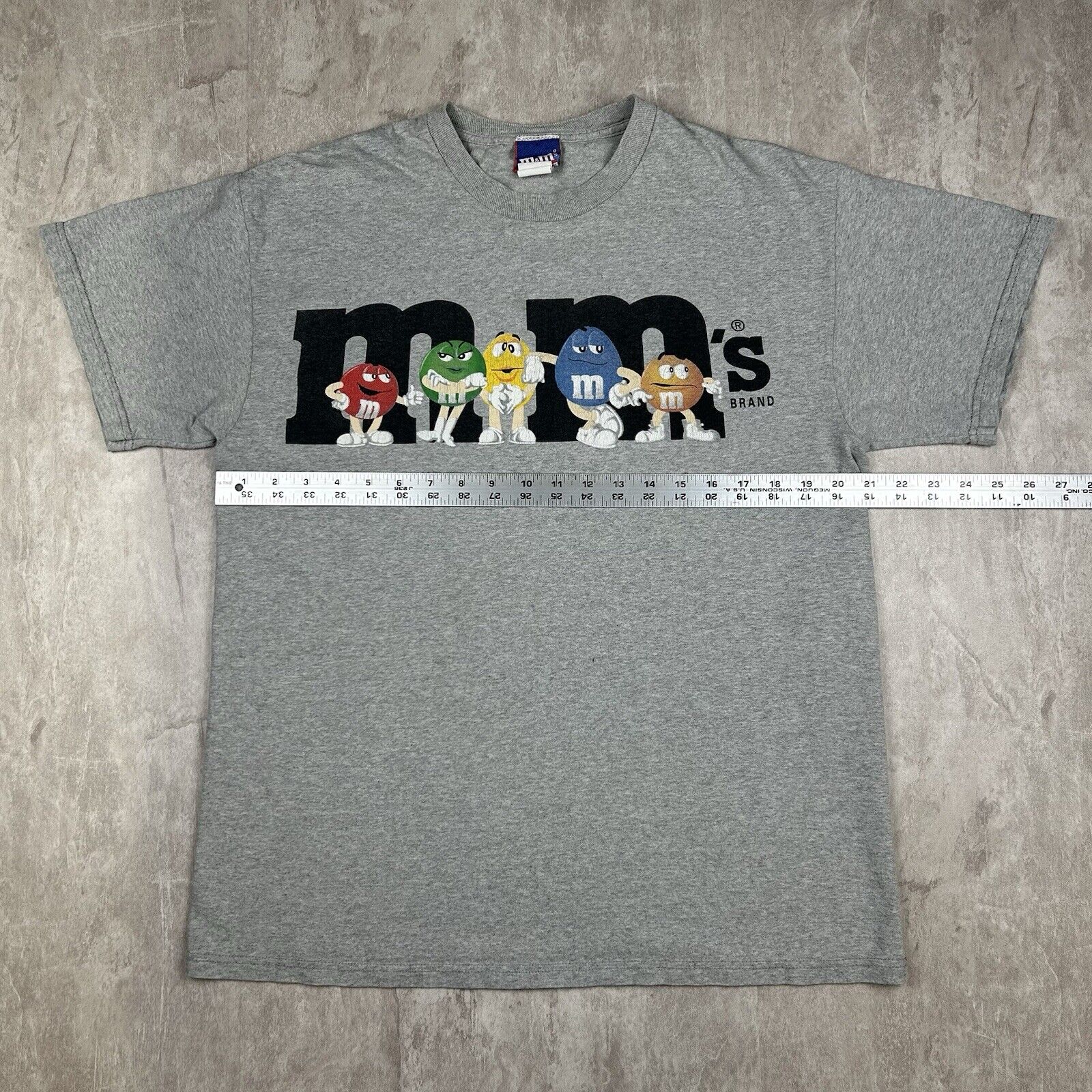 This Vintage M&M's Characters T-Shirt in size L features a playful graphic of the iconic candy characters on a gray backdrop. Made in the USA, it's a fun piece for collectors of nostalgic and retro candy-themed apparel.
