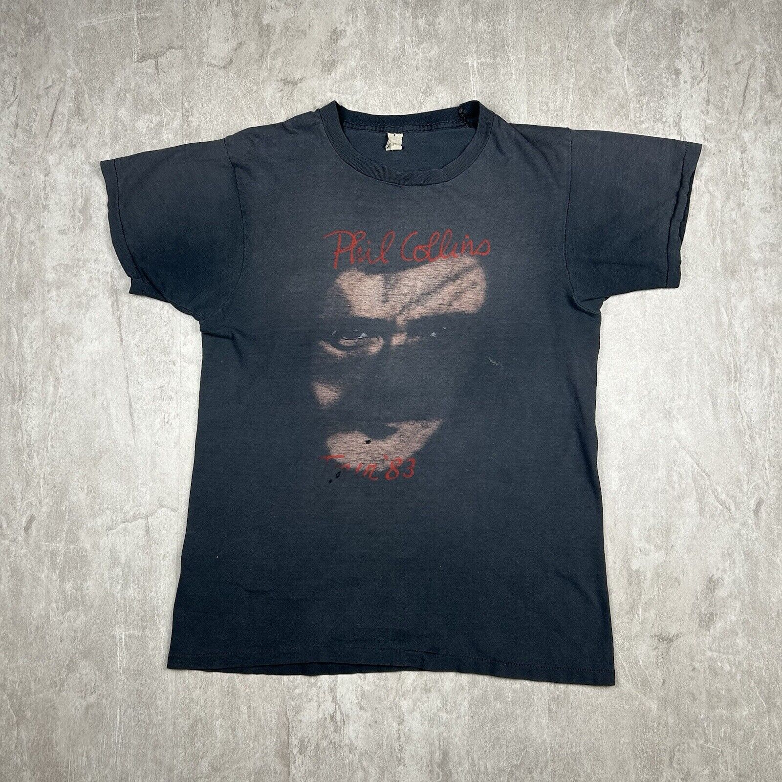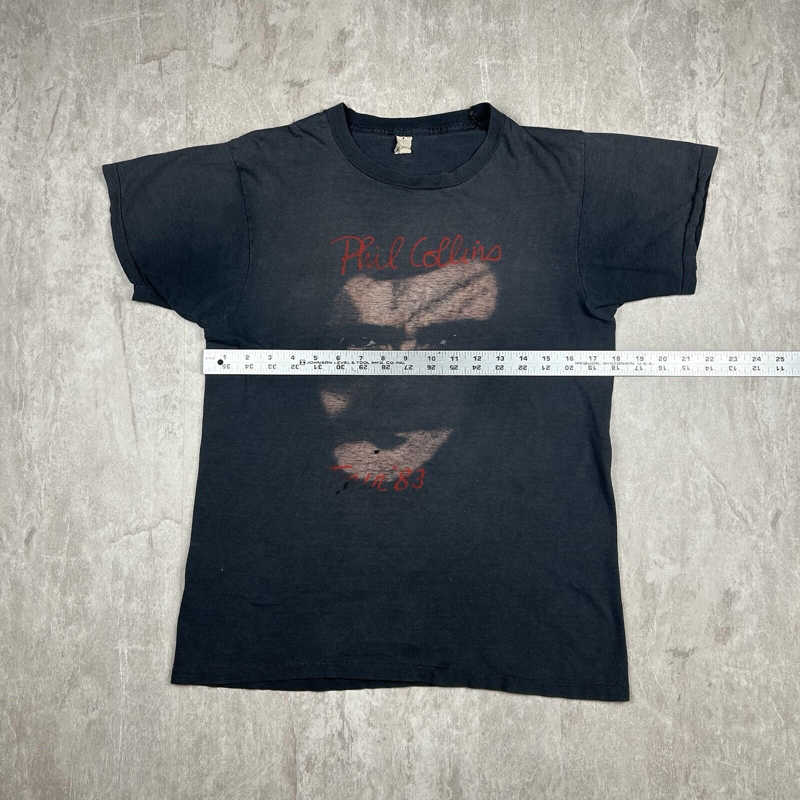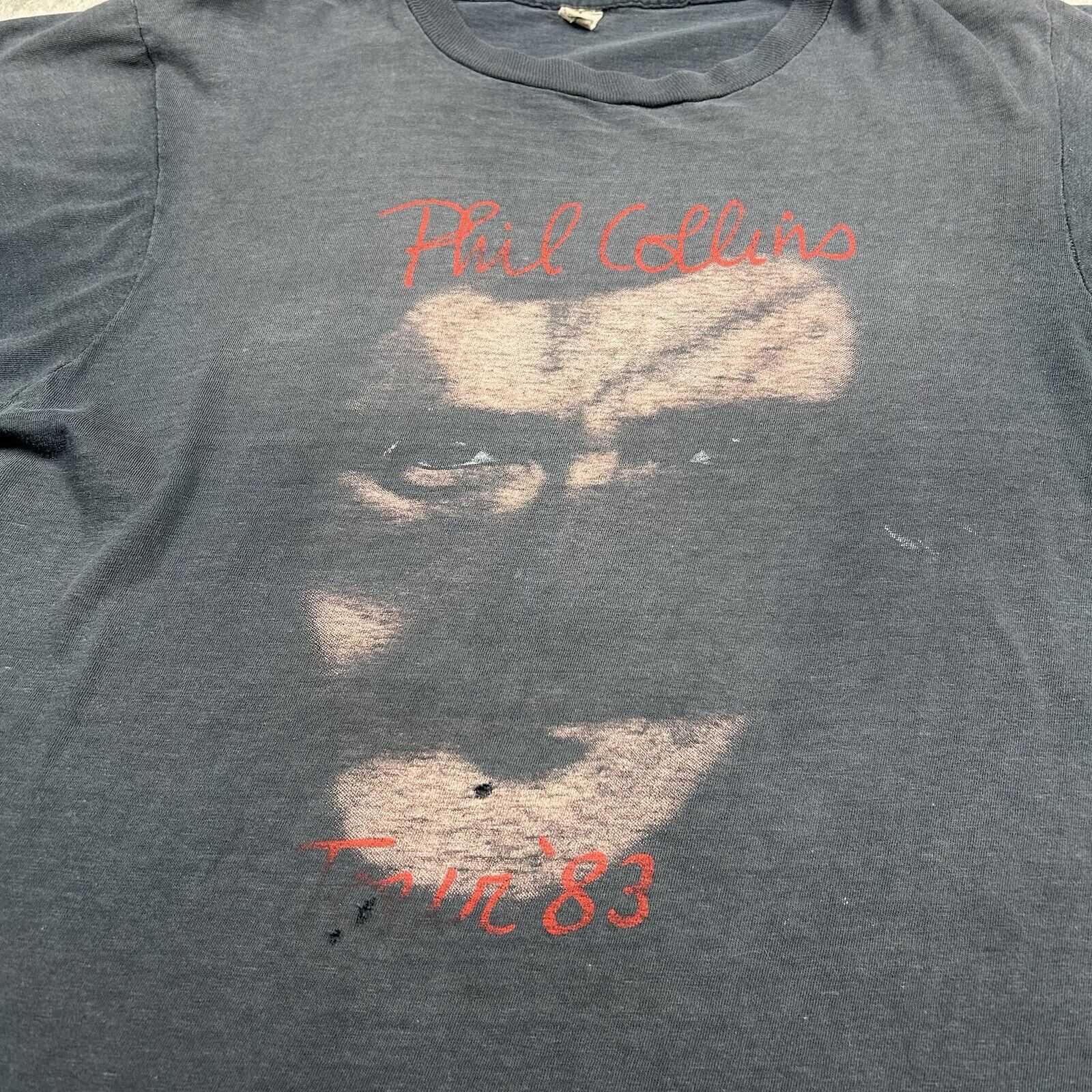 This vintage 1983 Phil Collins concert tour T-shirt in Men's Size L features a faded black design, giving it a well-loved, classic rock vibe. Made from soft cotton, this tee captures the essence of 80s music culture and is perfect for collectors of vintage band apparel or fans of Phil Collins. A true throwback piece!