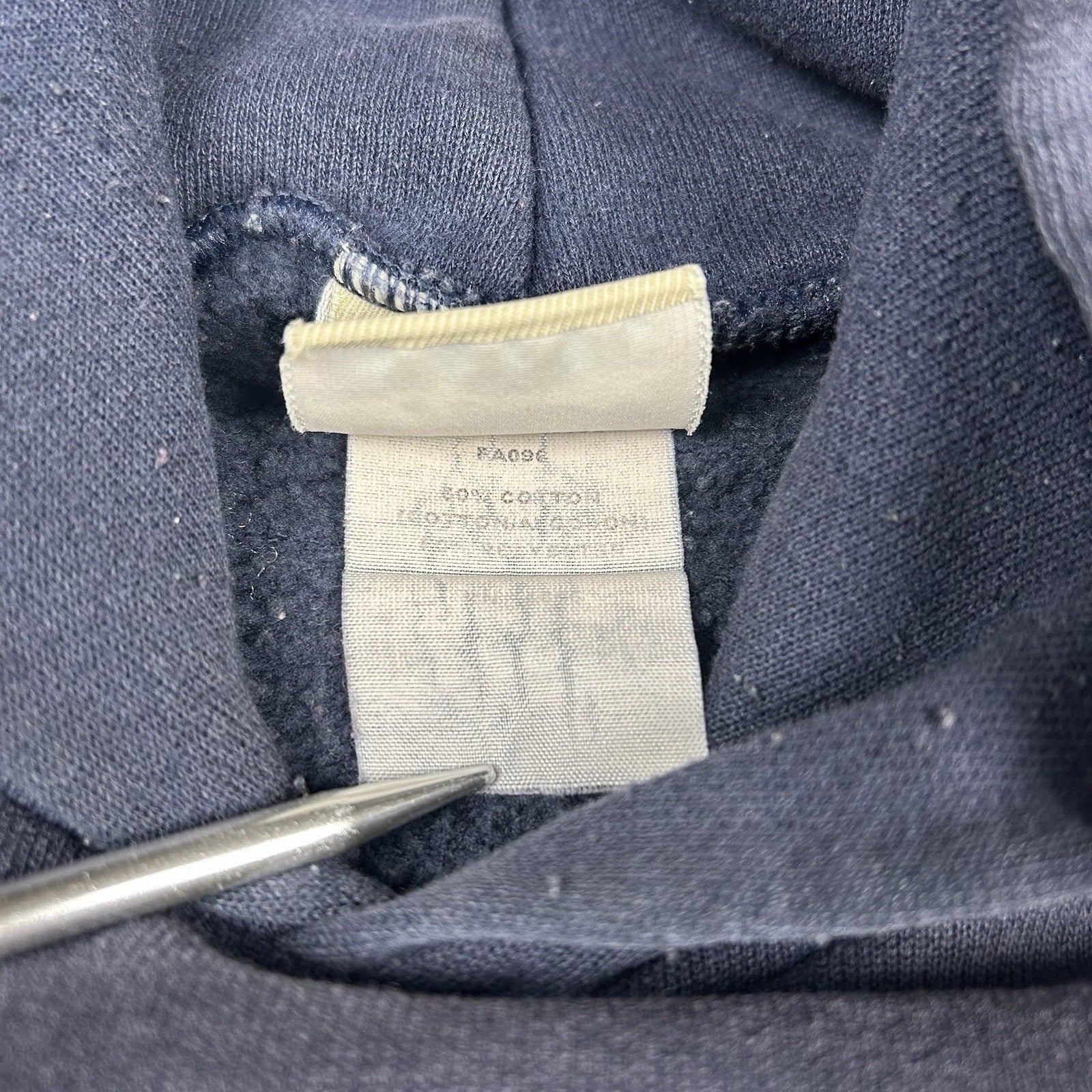 This vintage Polaris hoodie features a bold blue design with classic snowmobile racing graphics. Perfect for fans of motorsports and winter adventure. Men's size unknown — please refer to measurements for best fit.