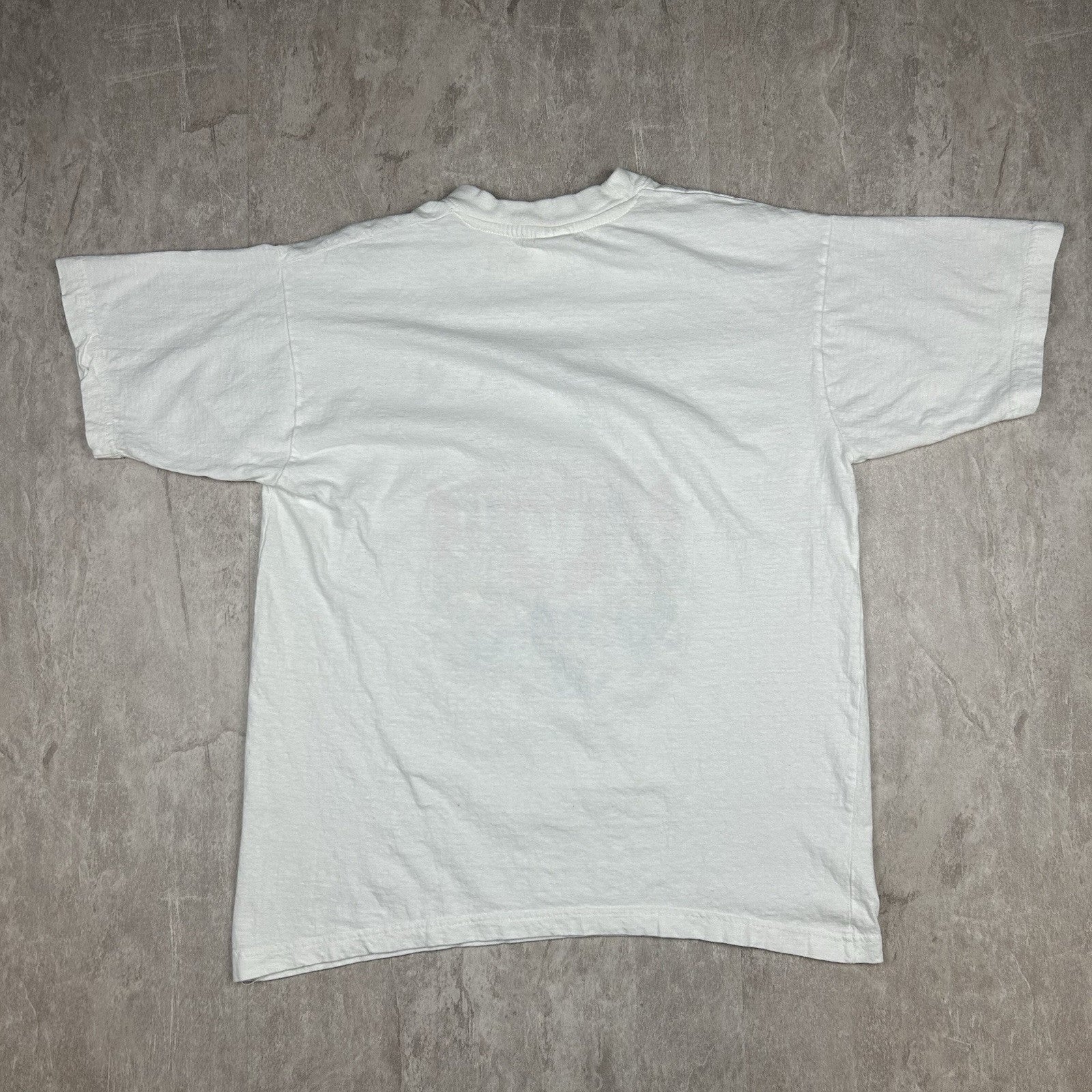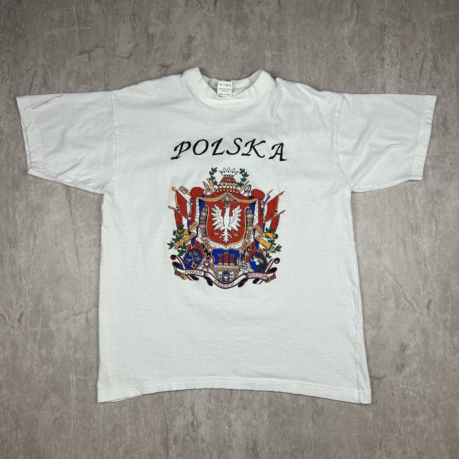 This vintage Polska Poland T-shirt in Men's size L features a bold eagle crest graphic, celebrating Polish heritage. A classic tourist tee with a timeless design.